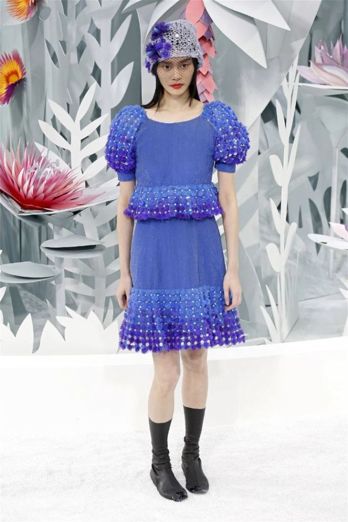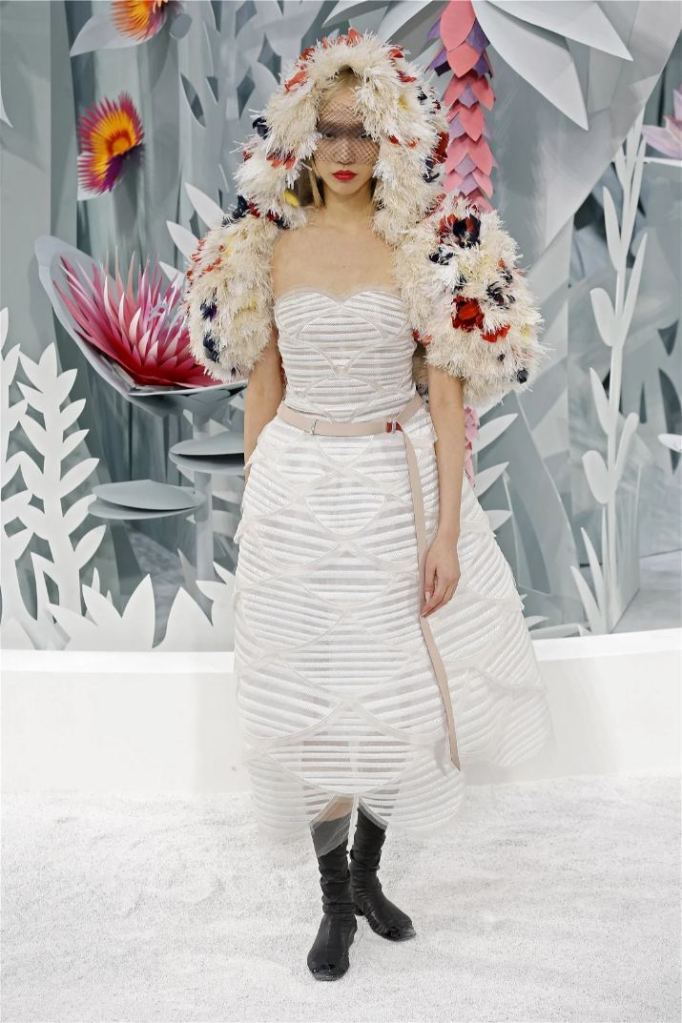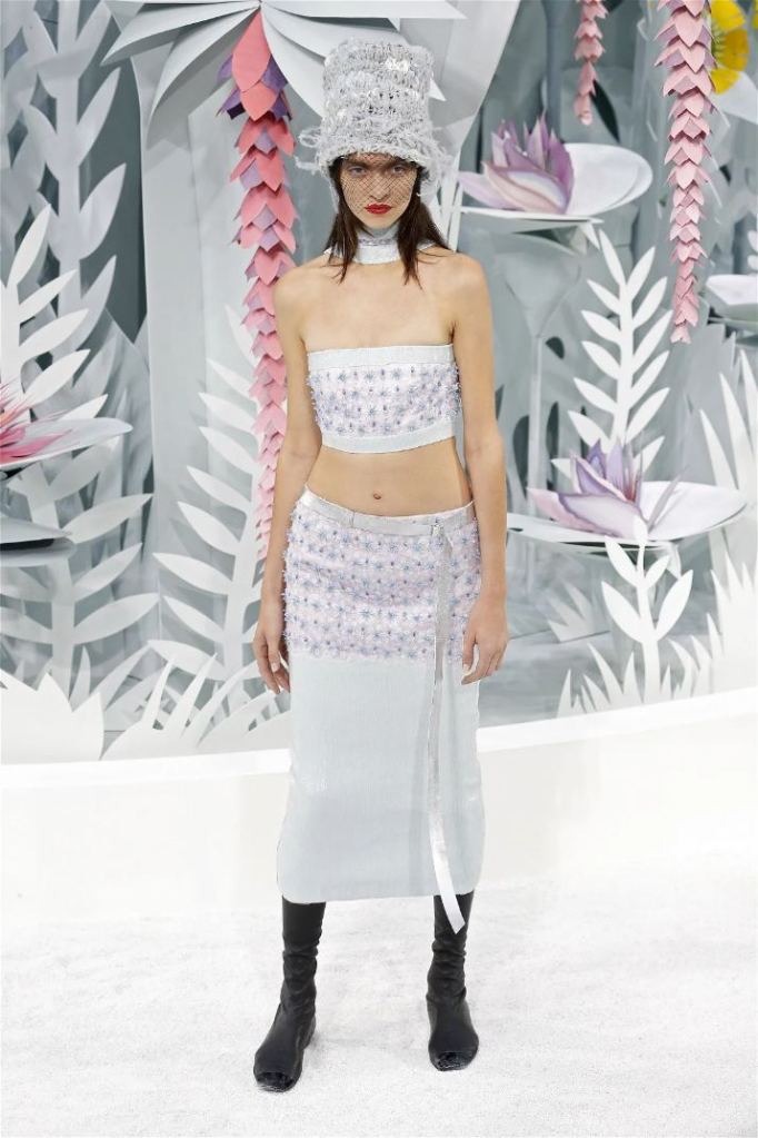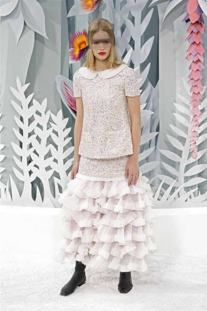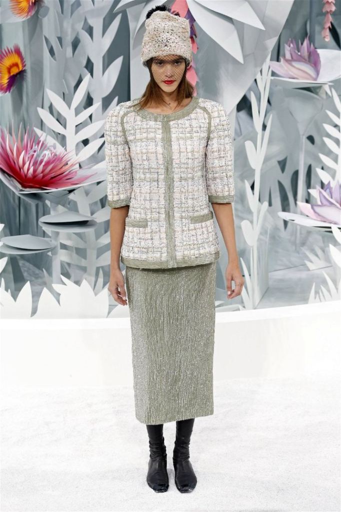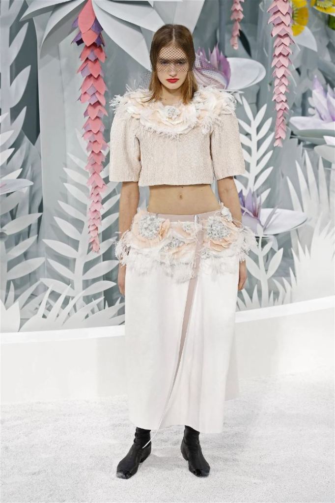 Distressed Chanel suits paired with oversized straw hats and knitted sequined granny-style hats. Traditional Chanel ensembles, including shredded jackets and skirts, embraced a mix of block colours. The collection exuded a springtime aura with light colours, floral motifs, and straw couture bonnets, culminating in a wedding dress adorned with flowers, a tulle bonnet, and fingerless gloves.