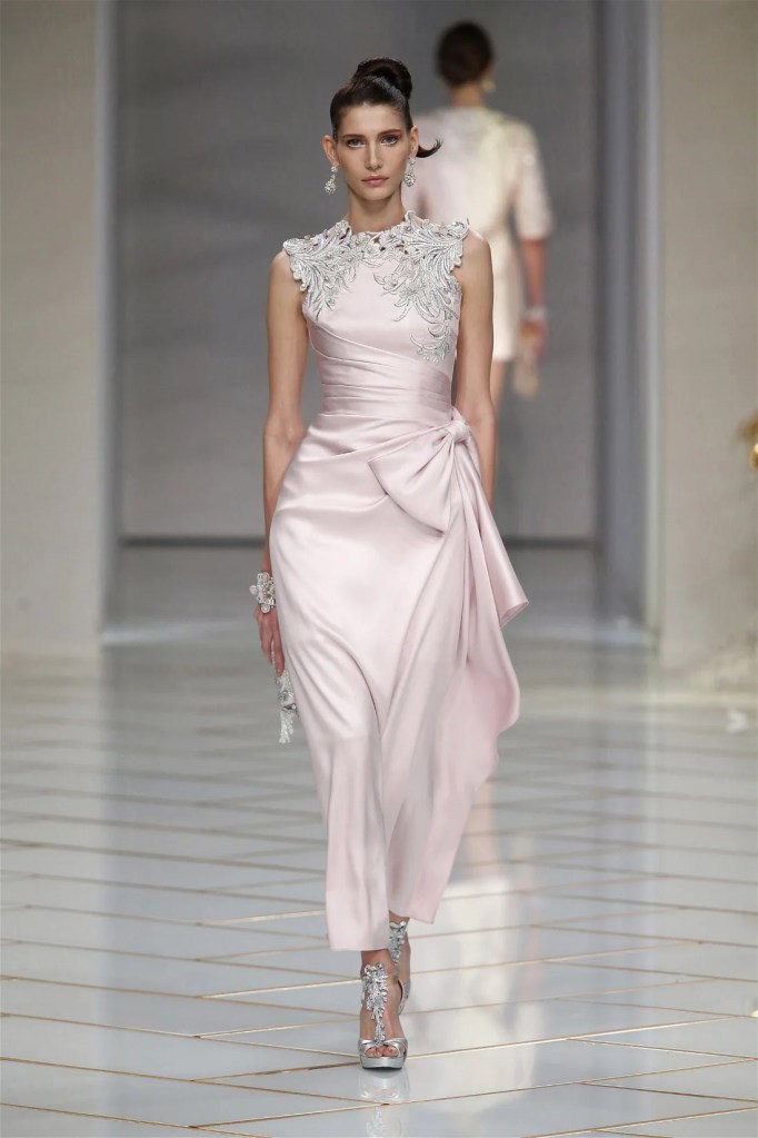 The collection draws inspiration from traditional Chinese courtyards, emphasizing intricate details, craftsmanship, and symbolism. Silhouettes are dramatic and voluminous, featuring long flowing gowns, capes, and skirts, some with elaborate trailing trains. Luxurious fabrics like silk, satin, brocade, and tulle are employed, adorned with embroidery, crystals, and feathers. The colour palette is rich, showcasing jewel tones such as emerald green, ruby red, and sapphire blue, along with softer hues like blush pink and ivory.