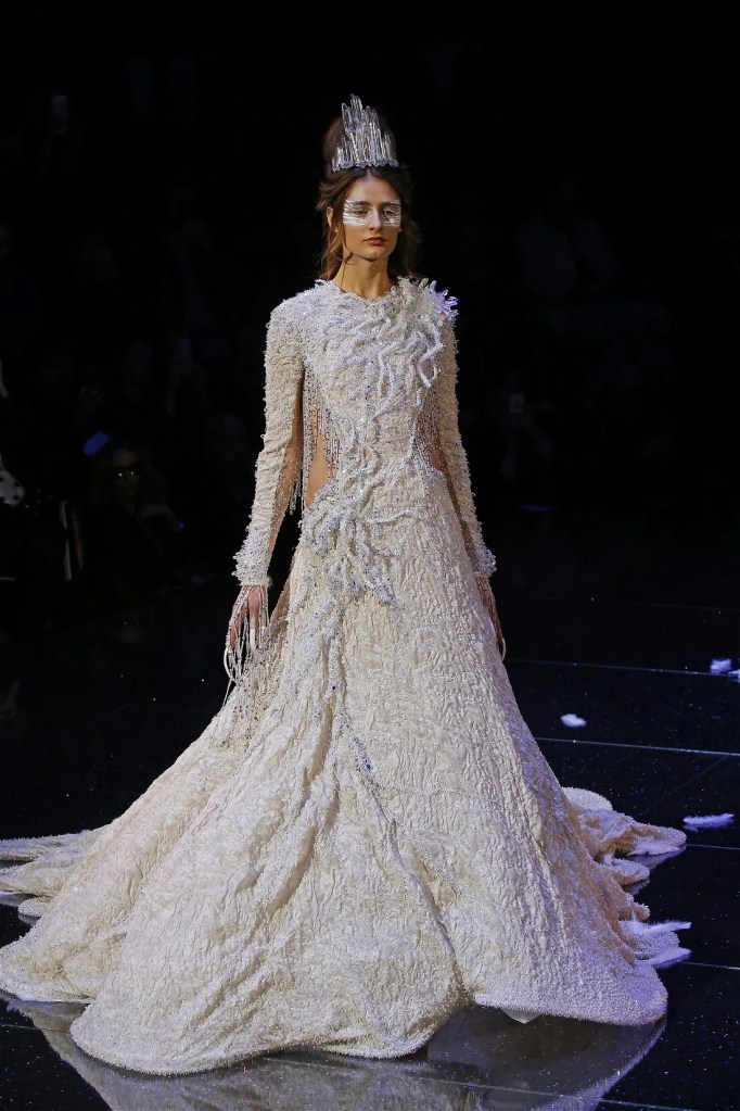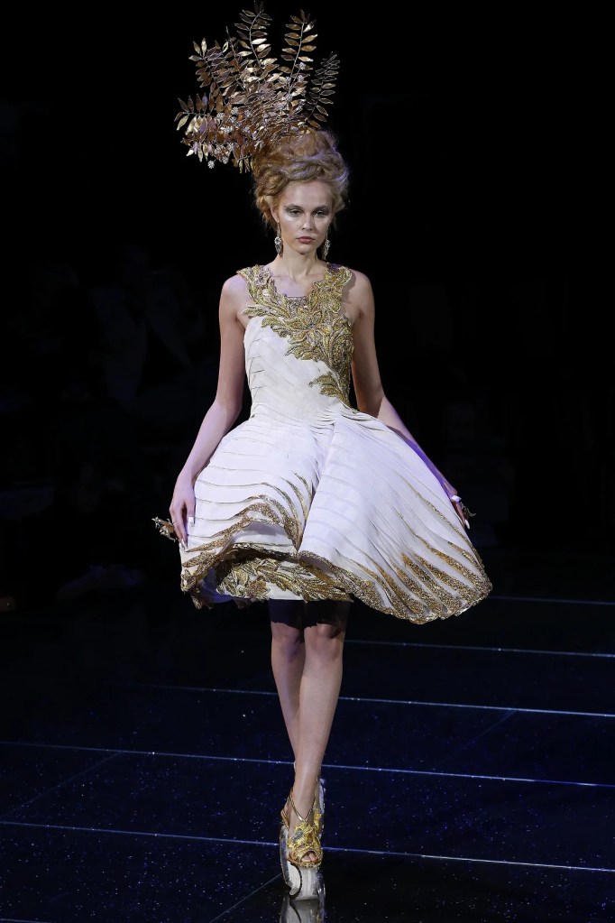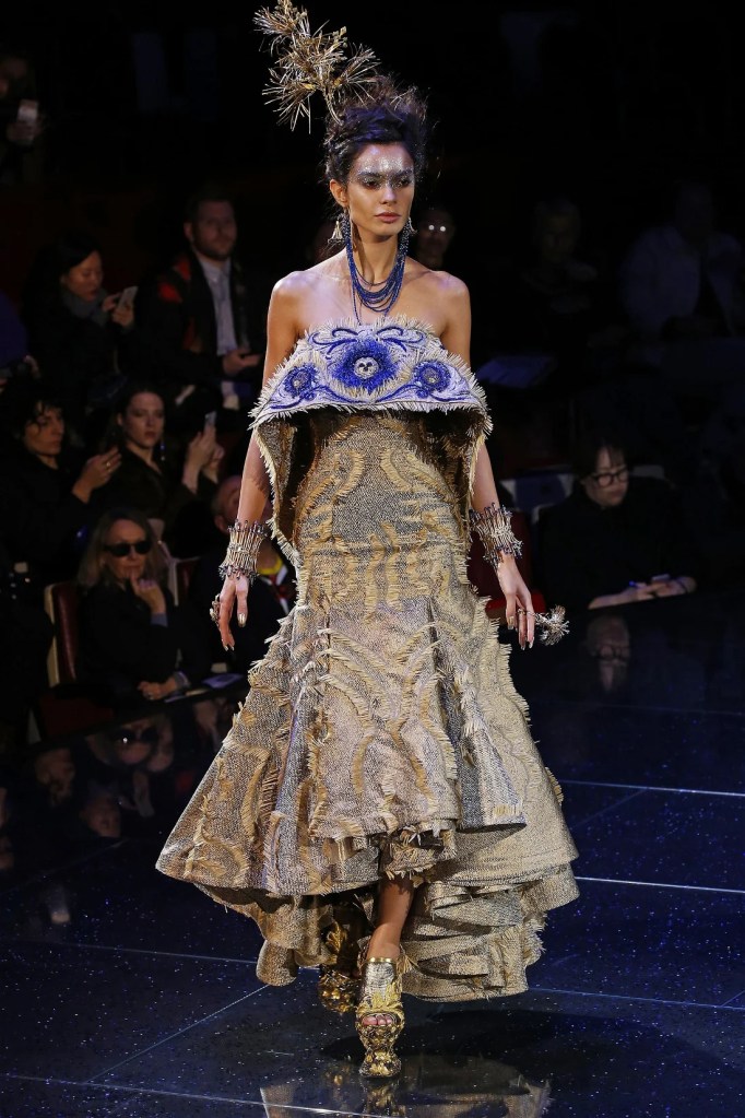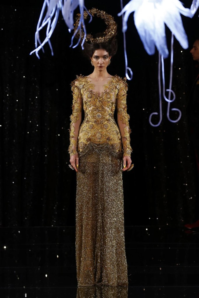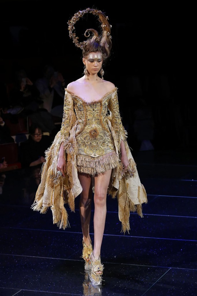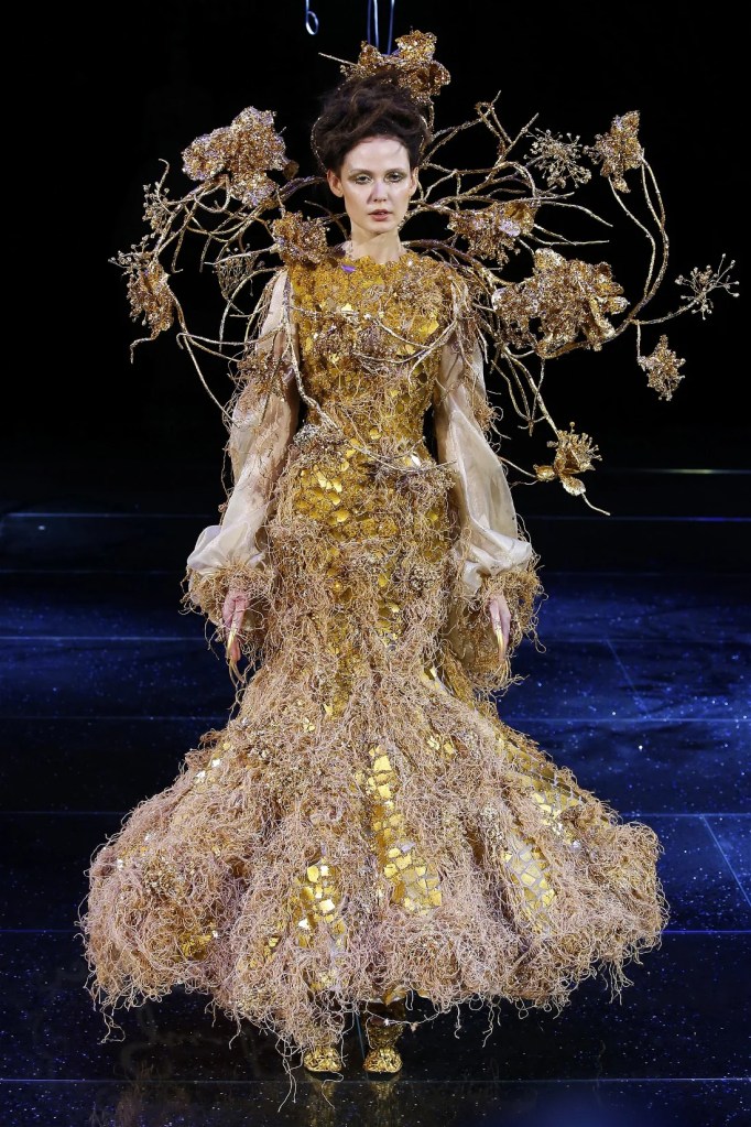 Inspired by the Greek mythological paradise, the collection featured richly embellished clothes with flowers, feathers, and crystals. Models wore gothic crowns and fantastical halos, with innovative fabrics and materials. One striking piece was a dress made entirely of bamboo, covered in golden flowers. The opening look, an ornate gold dress with golden flowers and stems sprouting from the neckline, was made of woven bamboo from Huangshan. With a thematic focus on Life, the collection brought to life a fantastical universe where mermaids, elves, princesses and deities converged in harmony.