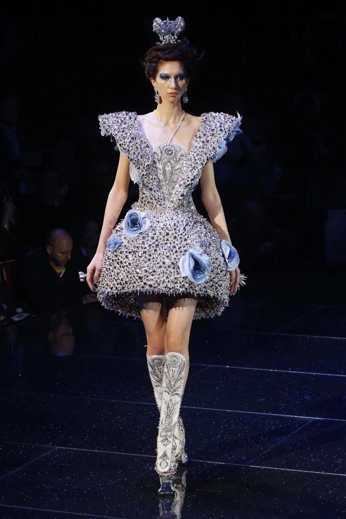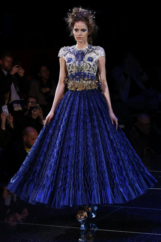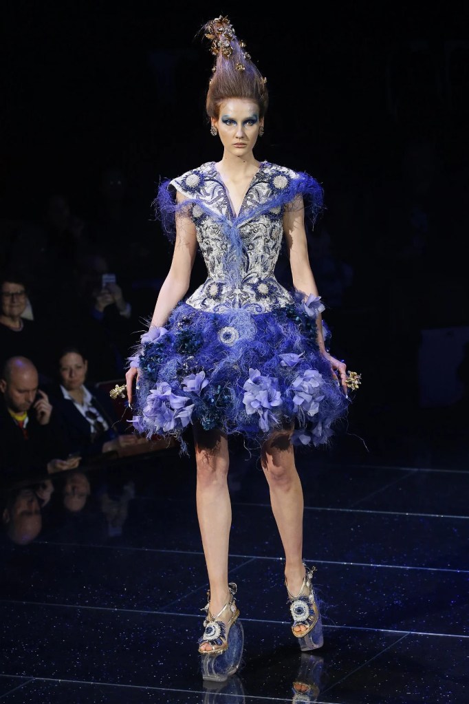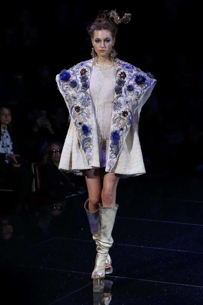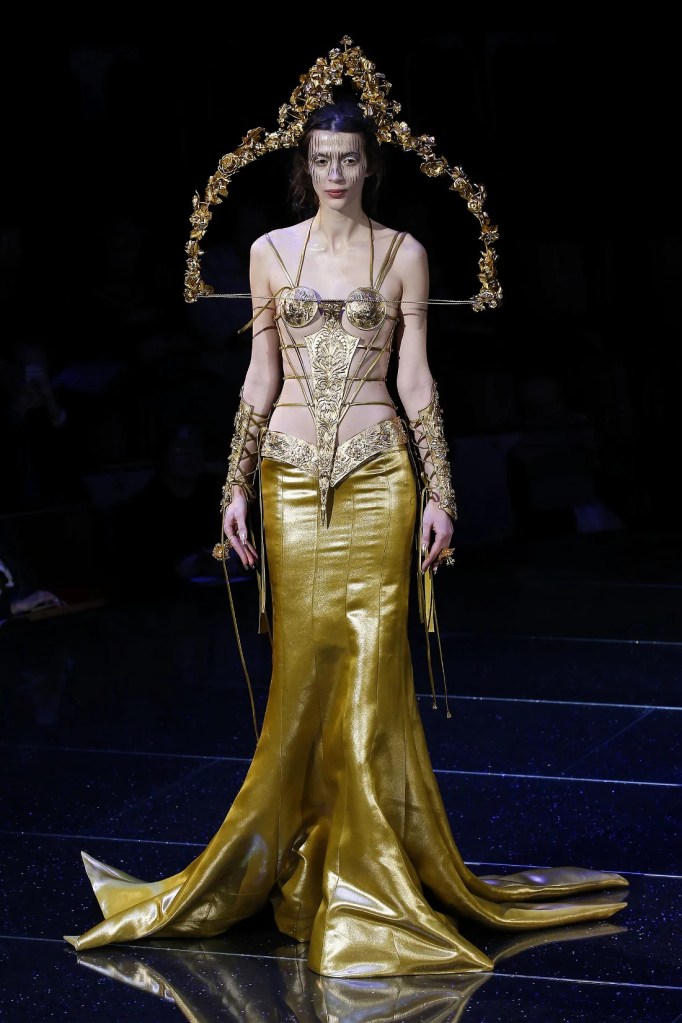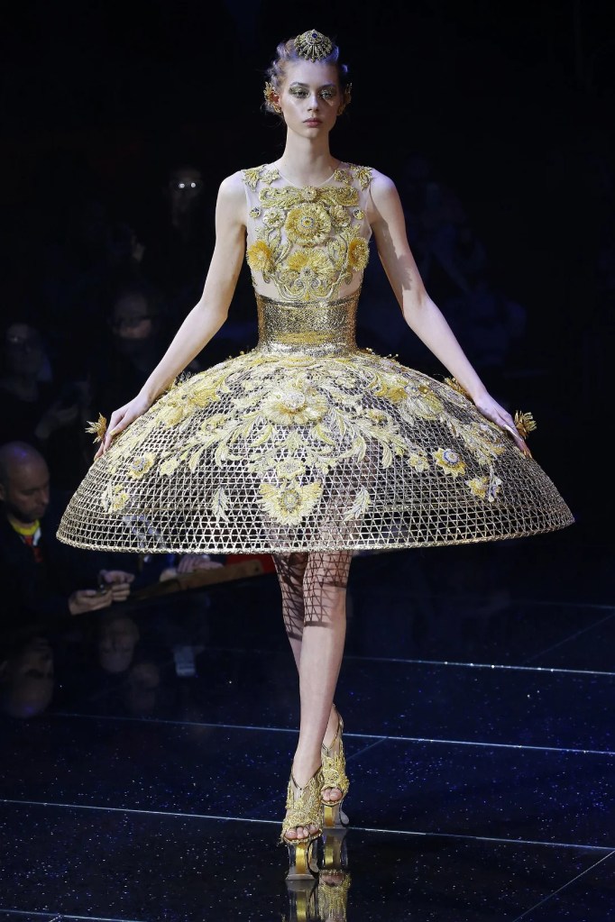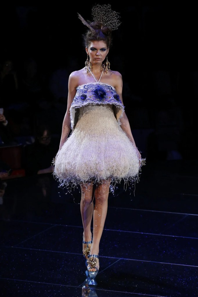 Inspired by the Greek mythological paradise, the collection featured richly embellished clothes with flowers, feathers, and crystals. Models wore gothic crowns and fantastical halos, with innovative fabrics and materials. One striking piece was a dress made entirely of bamboo, covered in golden flowers. The opening look, an ornate gold dress with golden flowers and stems sprouting from the neckline, was made of woven bamboo from Huangshan. With a thematic focus on Life, the collection brought to life a fantastical universe where mermaids, elves, princesses and deities converged in harmony.