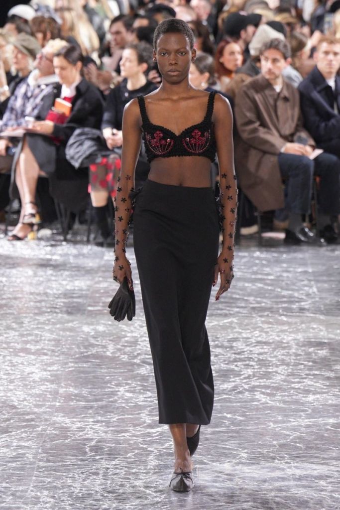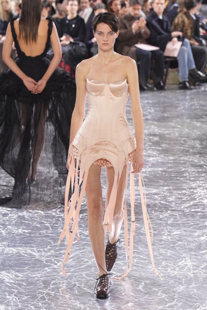 Rocha, with her signature blend of romanticism and subversion, was a perfect match for Gaultier’s audacious spirit. The resulting collection did not disappoint, offering a blend of the two houses’ aesthetics. Rocha’s touch was evident throughout the 36-piece collection. Her love of volume and soft hues like blush pink were beautifully integrated with Gaultier’s iconic corsetry and structured silhouettes. Playful nods to Gaultier’s history were sprinkled throughout, with the conical bra reimagined as devil horns and sailor stripes fashioned from cascading ribbons.