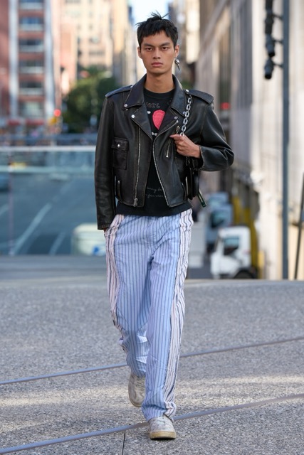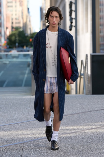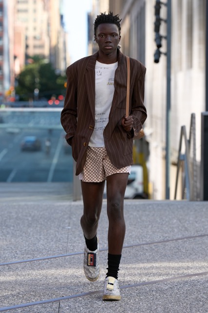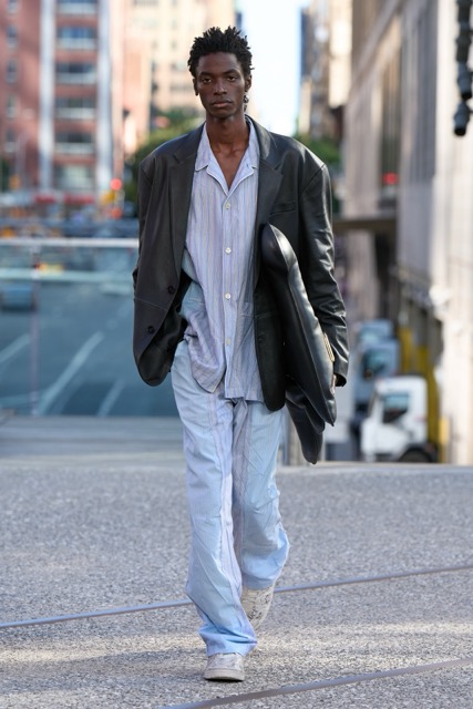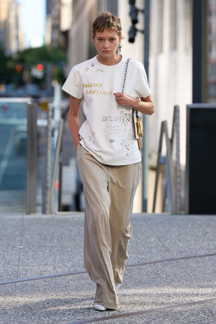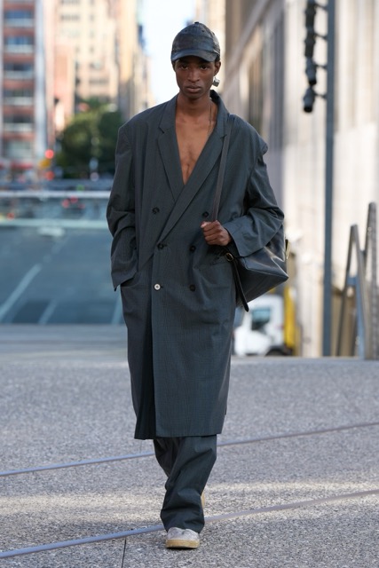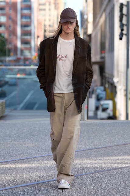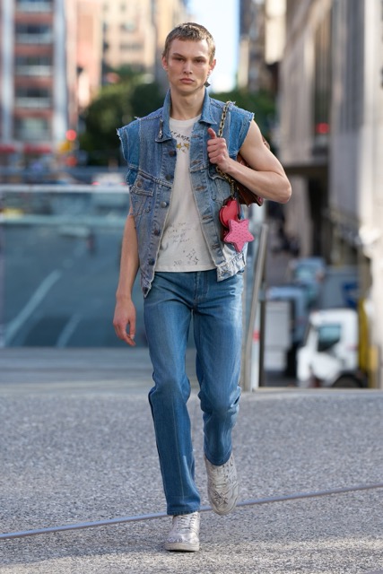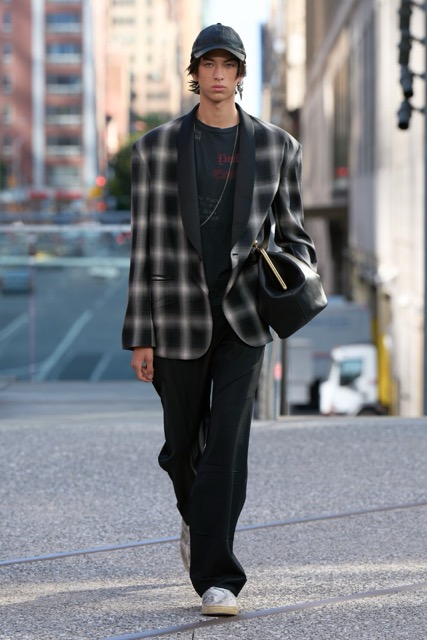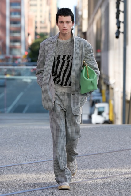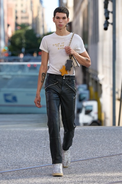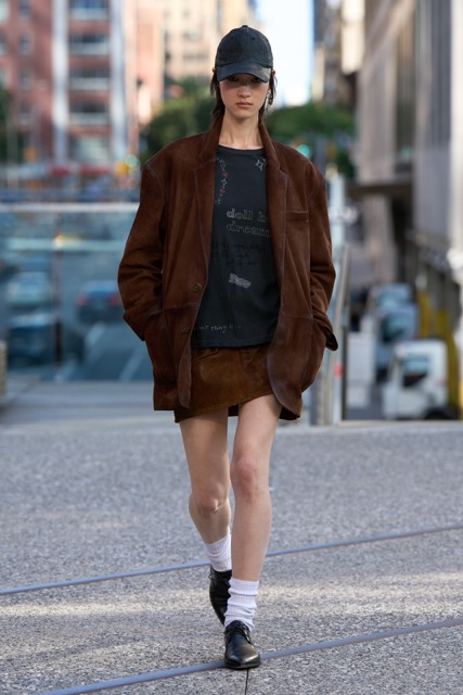 Stuart Vevers takes a fresh look at American classics through the lens of modern youth. The collection blends timeless materials such as denim, leather, and khaki with playful, upcycled designs that embrace imperfection. Frayed edges, patched-together garments, and vibrant ‘60s-inspired minidresses breathe new life into heritage pieces. Vevers taps into nostalgia while pushing fashion forward, emphasizing sustainability and craftsmanship. The collection also features bold accessories, including oversized clutches and playful, charm-adorned sneakers. The juxtaposition of classic tailoring with contemporary streetwear elements offers a unique and wearable aesthetic. While the collection’s emphasis on sustainability and authenticity aligns with current trends, it does not feel overly contrived. By repurposing vintage materials and injecting a youthful energy, Vevers creates a collection that is both nostalgic and modern. Held on New York’s High Line, the show reflected the collection’s urban, streetwise appeal, celebrating individuality and self-expression.