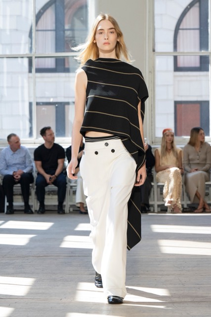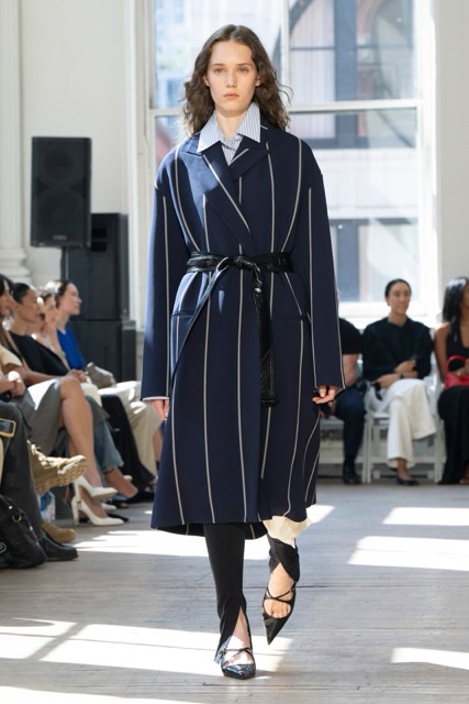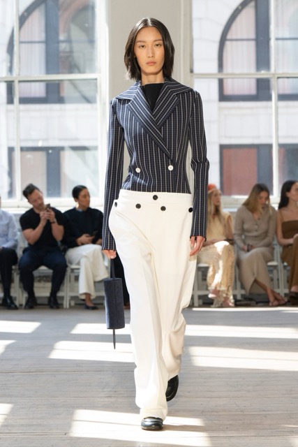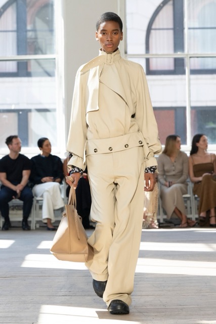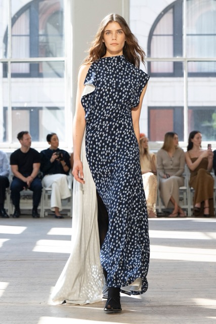 Proenza Schouler presented a refreshing departure from their minimalist aesthetic. Inspired by sails, the collection showcased a harmonious blend of structure and fluidity without veering too far into literal nautical themes. Key pieces, such as floral dresses, striped sailor tops, knit sets, and jersey dresses with pleats, reflected the designers’ commitment to craftsmanship and emotional resonance. Collaborations with Sorel brought a street-ready edge with rubber rain boots and low-profile sneakers, while fringed sandals added playful textures. Intricate detailing, including metal belt loops and leather fringe, enhanced the garments’ tactile appeal. The layered silhouettes and bold color palette, featuring vibrant pinks and blues alongside neutrals, offered versatility. The pieces were notably easy to style, making them ideal for everyday wear or more elevated looks.