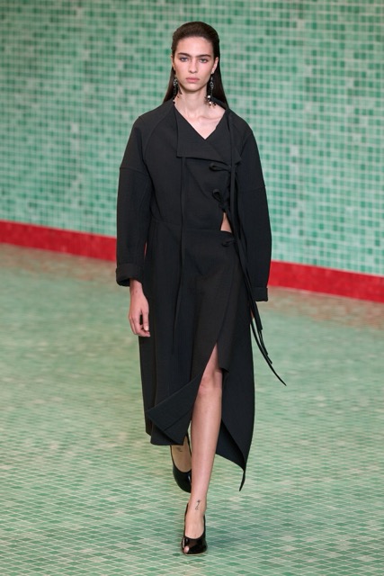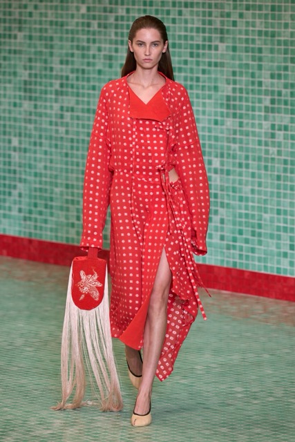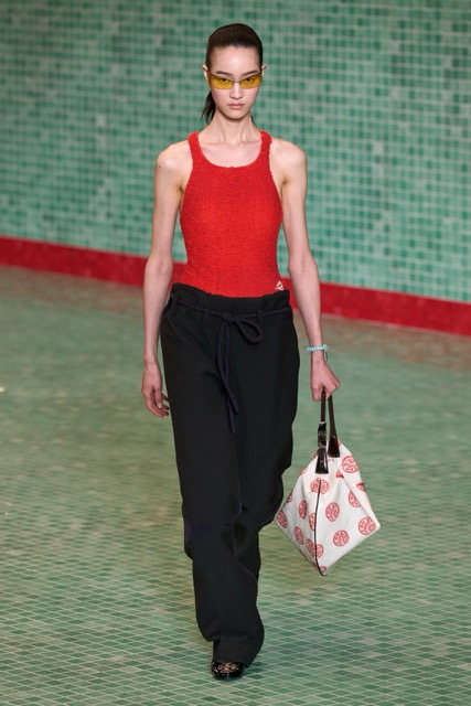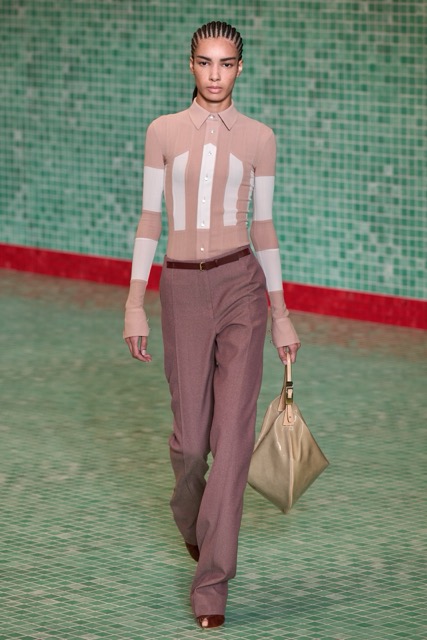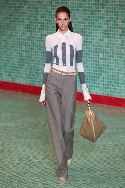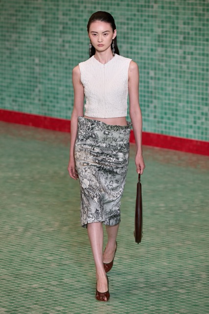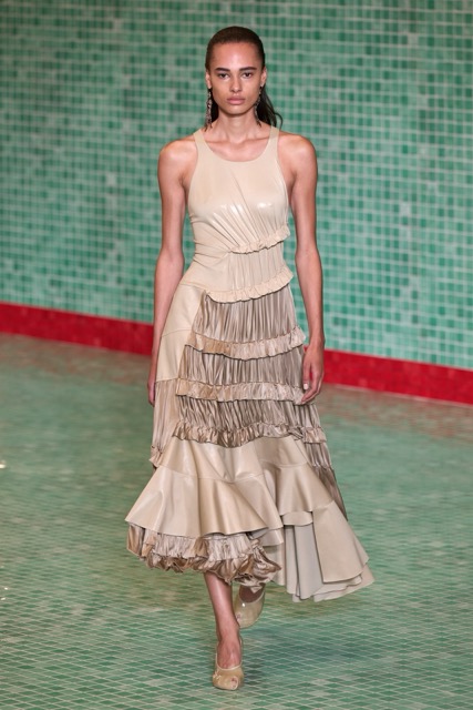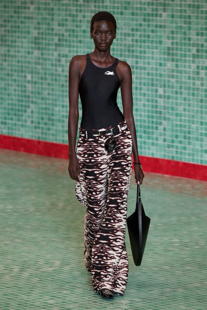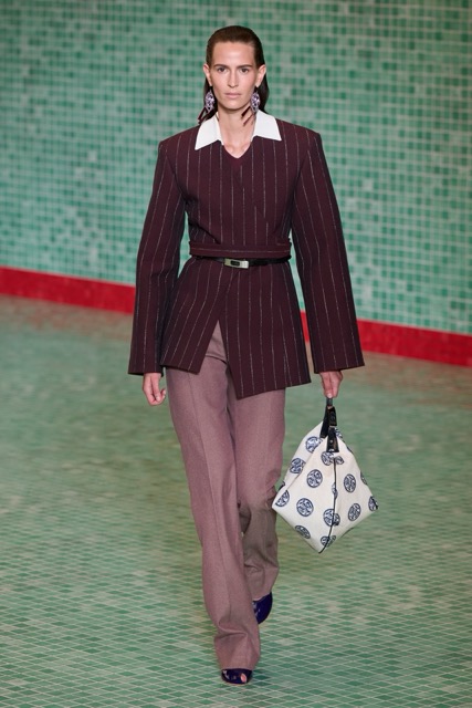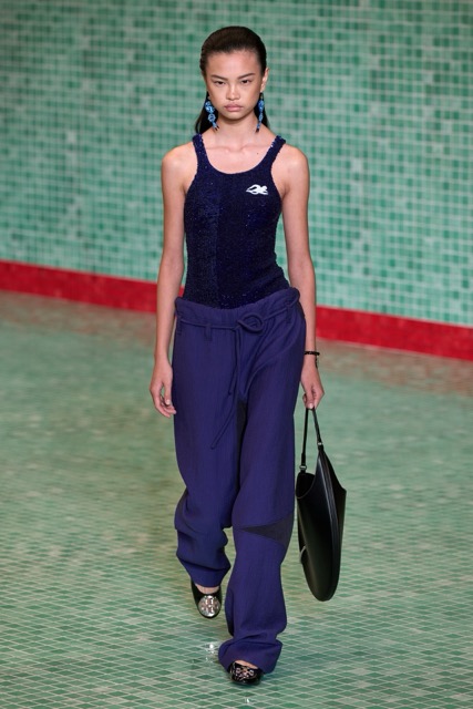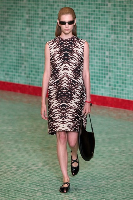This Tory Burch collection effectively marries athleticism with chic sophistication. Through thoughtful design choices and a continued emphasis on wearability, the collection maintains Burch’s signature style while incorporating a fresh, sporty edge. Burch’s choice to merge her Tory Sport line into her main collection further blurred the boundaries between activewear and daywear. The lineup featured athletic-inspired pieces such as sequined swimsuits, scuba-like dresses, and sporty silhouettes, all while maintaining the ultra chic femme energy. Highlights of the show included a surprise runway appearance by Alexa Chung, the resurrection of the iconic Reva ballet flats, and a stunning venue that transformed the Domino Sugar Factory into a pool-themed wonderland. The collection featured a range of sporty silhouettes, abstract animal prints, and vibrant colors. This season, Burch once again demonstrated her ability to innovate while staying true to her brand’s athletic roots.