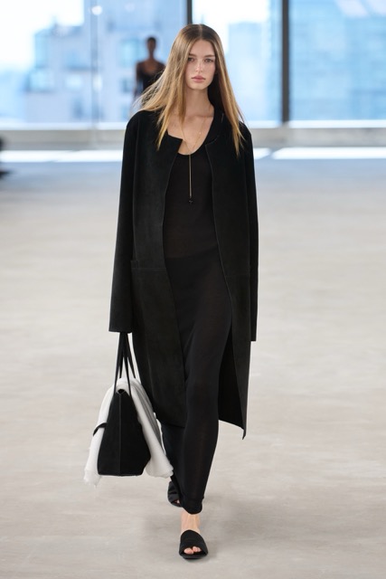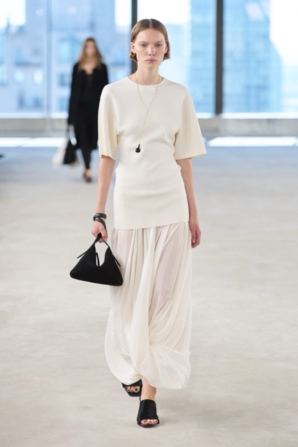 Toteme’s debut New York City runway show showcased the brand’s minimalist aesthetic and commitment to timeless design. The collection, inspired by the Upper East Side and the brand’s Scandinavian roots, featured a muted color palette of black and white and clean, classic silhouettes.The collection was a study in quiet luxury, dominated by black and white looks that emphasized texture and subtle layering rather than bold colors. Black suedes paired with matte fabrics created a grayscale effect, while tulle hems and soft knits added a delicate touch.