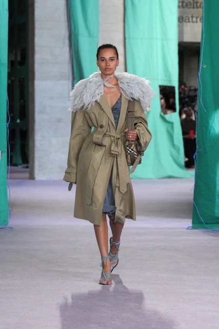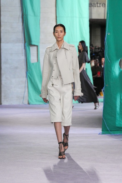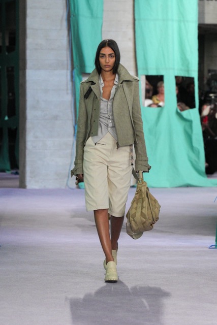 While classic silhouettes like the trench coat were prominently featured, Lee incorporated contemporary touches such as cropped jackets, cargo pants, and low-rise trousers. The collection’s color palette, featuring earthy tones alongside playful shades of lavender and soft grays, echoed the British outdoors. Military-inspired details on outerwear and pants, as well as the use of lightweight fabrics like washed silk and linen, showcased a blend of practicality and understated elegance. Lee’s collaboration with British artist Gary Hume added a contemporary edge to the show, with green cut-out installations complementing the streamlined setting of the National Theatre.