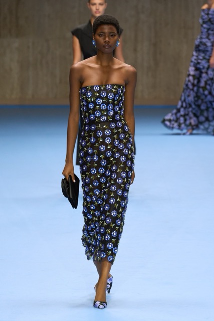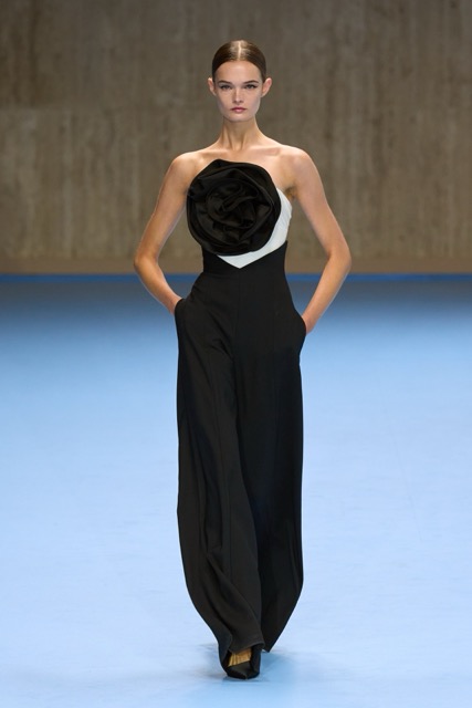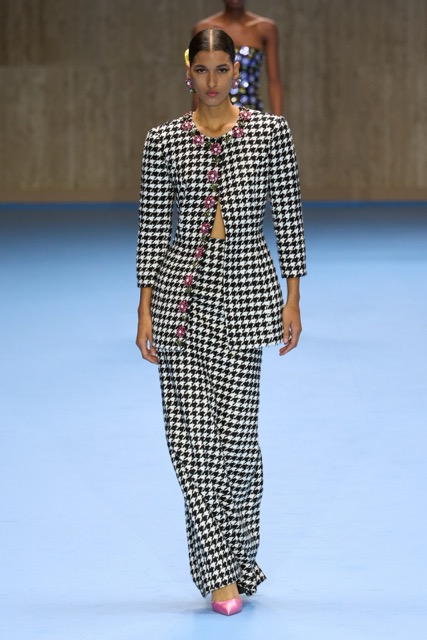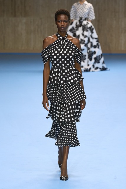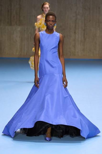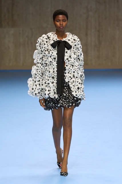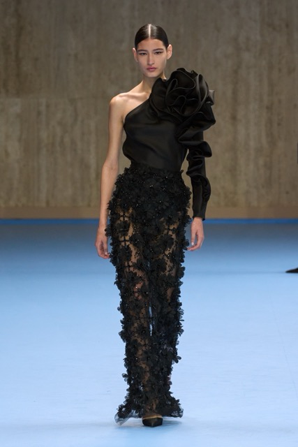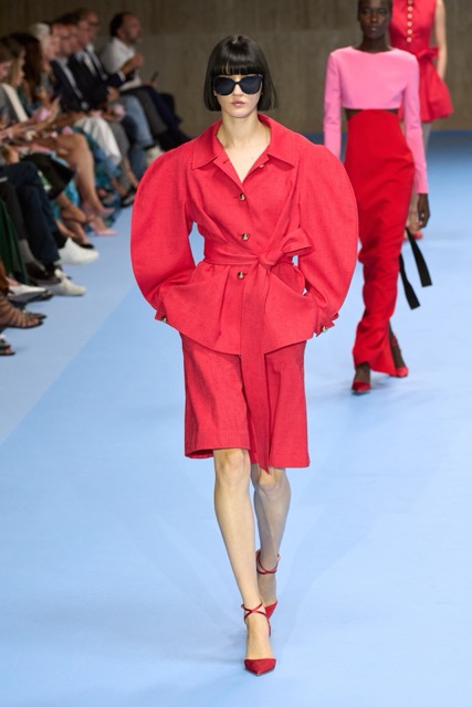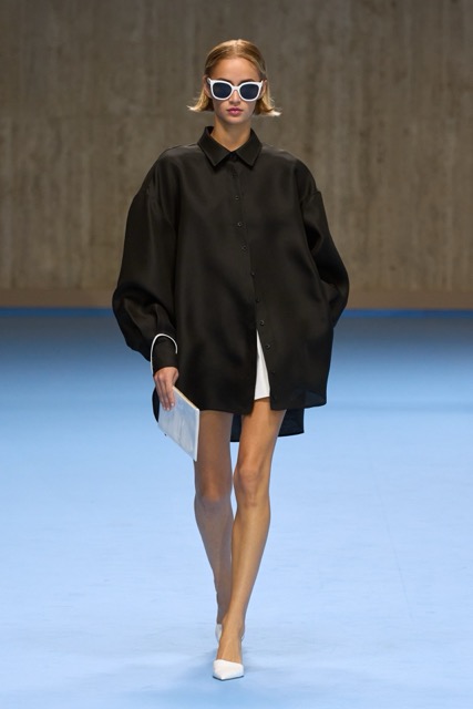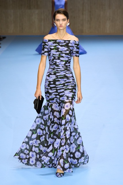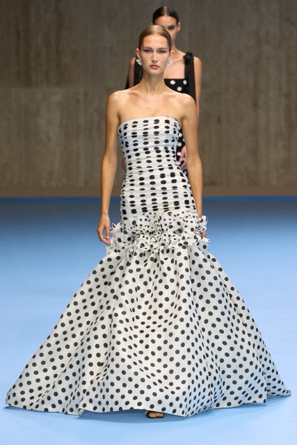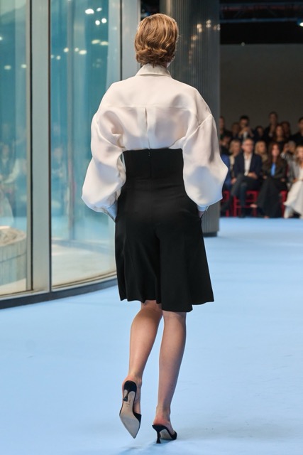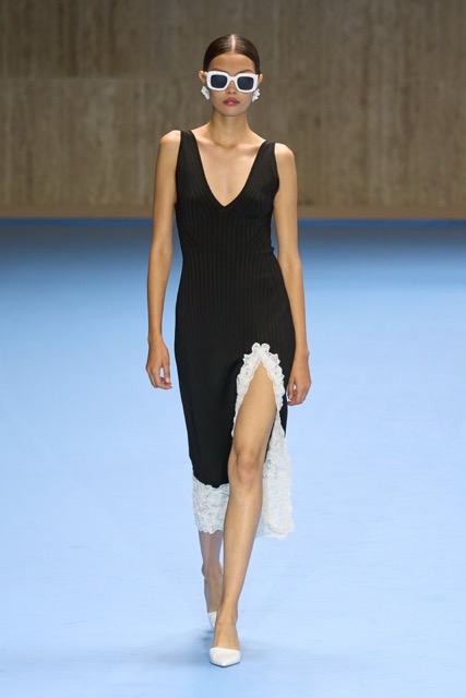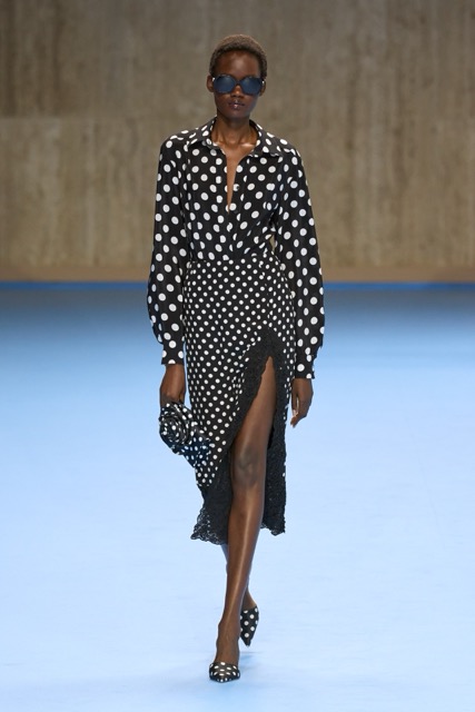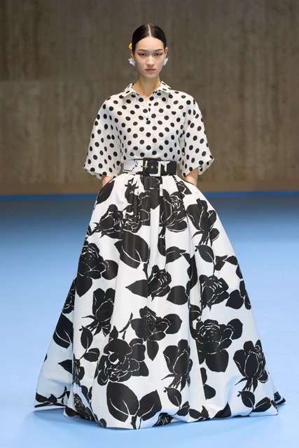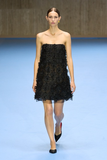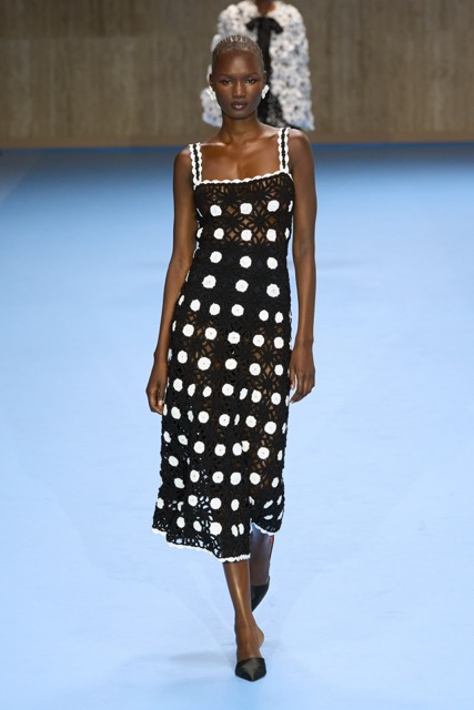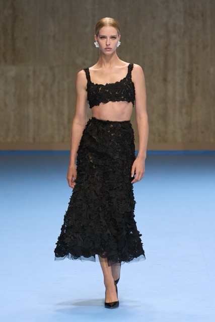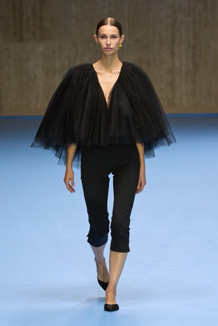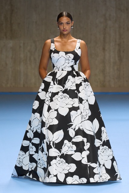 The Collina Strada show, titled “Touch Grass,” offered a refreshing blend of playful theatrics and presented a more subdued take on the brand’s usual whimsical aesthetic. Designer Hillary Taymour cited the overwhelming news cycle and global events as inspiration for a collection that offered a sense of peace and grounding through fashion.Held in the Marble Cemetery in the East Village, the atmosphere was a perfect balance of whimsy and serenity. Models moved down the runway with graceful, earthy gestures, adorned in ruffled, airy pieces and intricate shell tops, blending femininity with a modern edge. The prints ranged from vibrant, saturated hues to sun-bleached tones, capturing a sense of natural wear and weathering. The show’s soundtrack added a playful touch, with a bossa nova remix of Ashlee Simpson’s “Pieces of Me” reimagined to sing about vegetables. Hillary Taymour’s collection felt like a gentle commentary on the chaotic energy of the world, encouraging reconnection with nature. The event’s charm, coupled with its toned-down maximalism, created a creative escape.