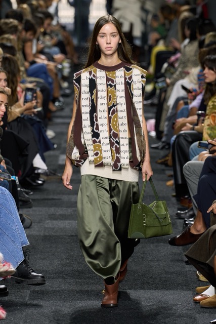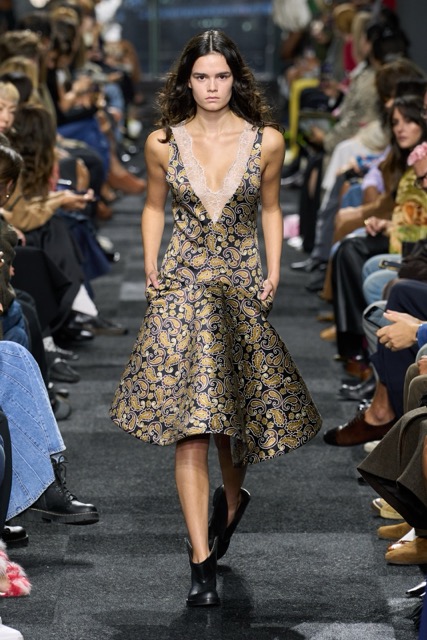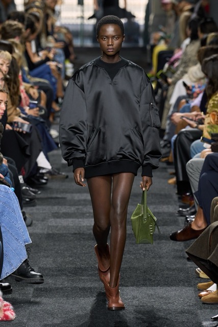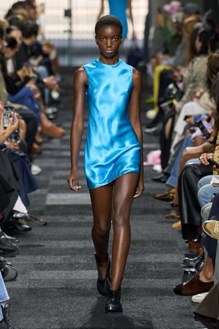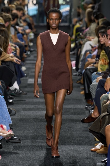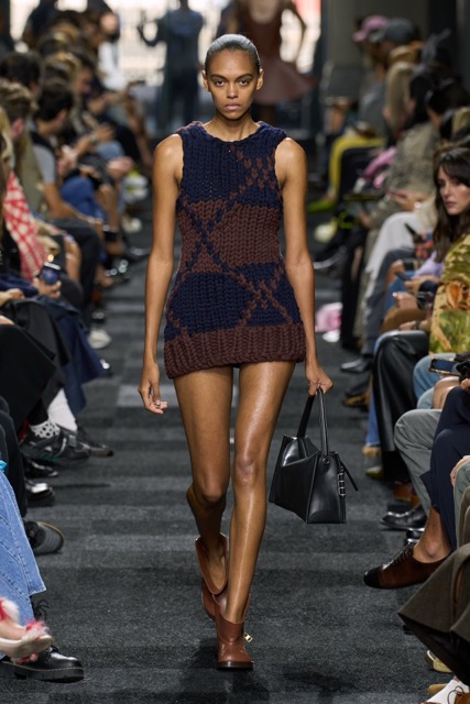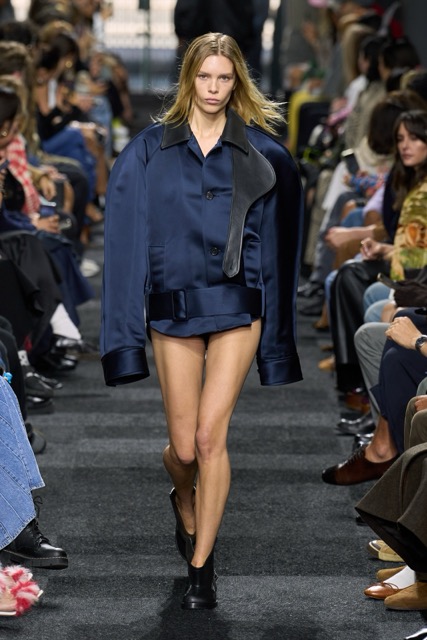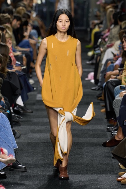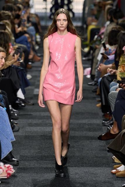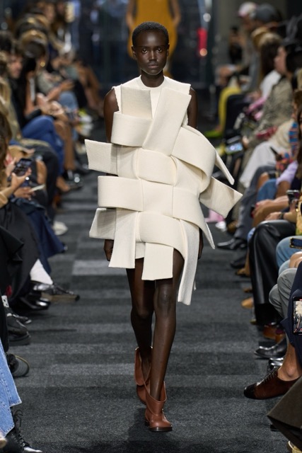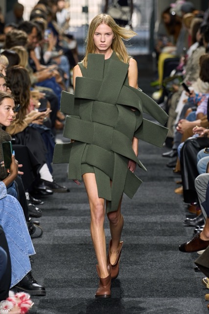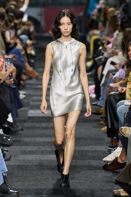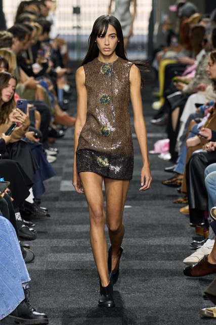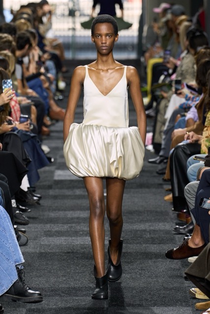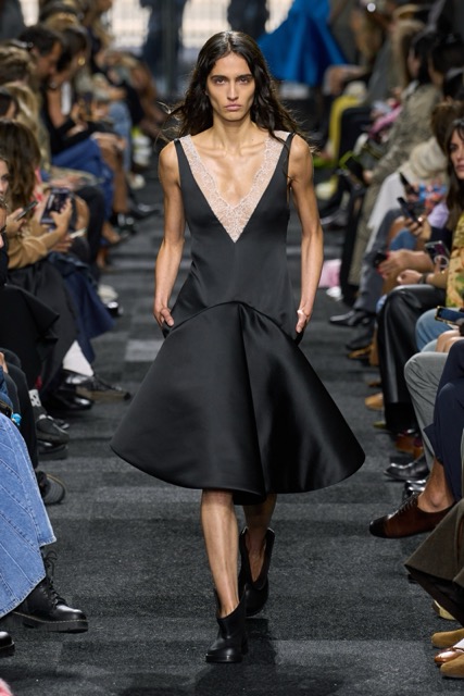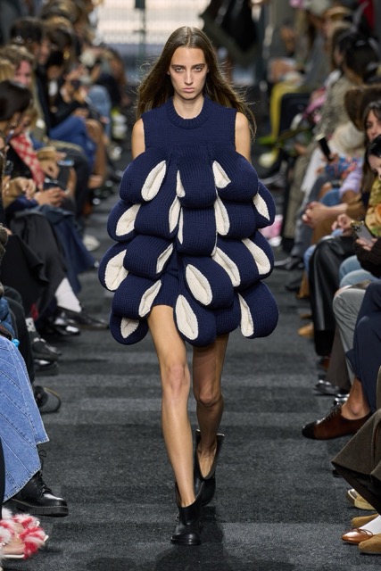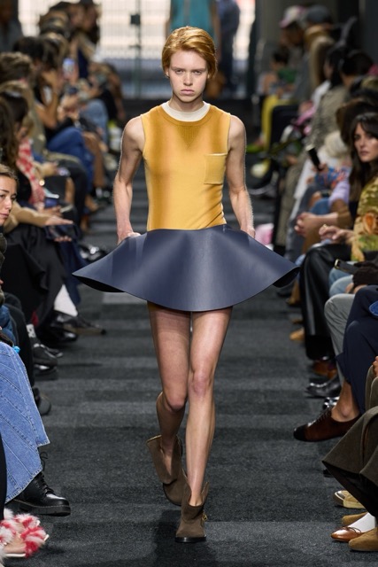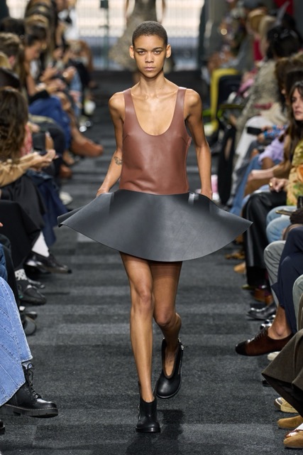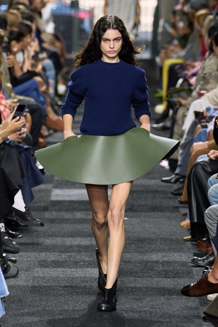 At first glance, it appeared straightforward—minimalist silhouettes, micro hemlines, and a limited fabric palette of cashmere, leather, silk, and sequins. But with Anderson, nothing is as it seems. A sweatshirt is actually a silk dress, a pair of boots transforms into a rebellious style statement, and a classic sweater dress becomes an avant-garde architectural masterpiece. Minimal silhouettes, including micro-mini hemlines and leather tutu-dresses, dominated the runway, offering a youthful, edgy aesthetic. Anderson’s signature trompe l’oeil techniques adding a clever twist to familiar wardrobe staples. Artistic references, such as text from Clive Bell’s essay on art and aesthetics, further underscored the collection’s thoughtful design process. However, there is a newfound sobriety that reflects the designer’s concerns about the industry as a whole. His emphasis on “narrowing things” and “refocusing” suggests a desire for a more intentional and meaningful approach to fashion. While the collection may seem understated, it is anything but.