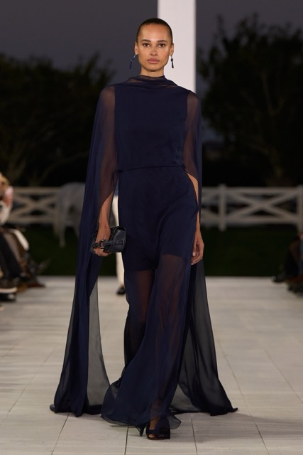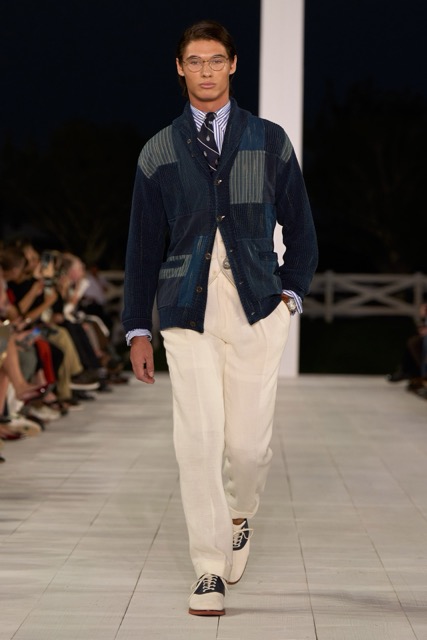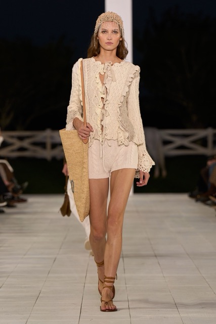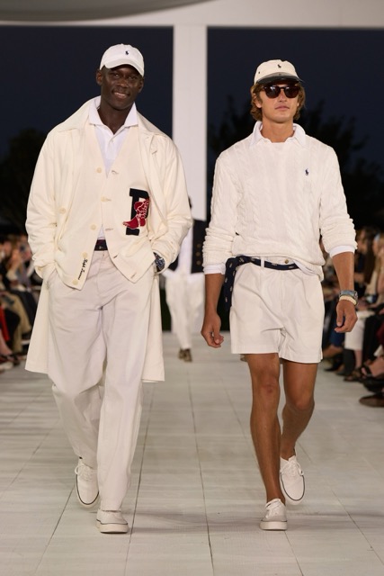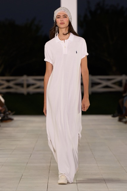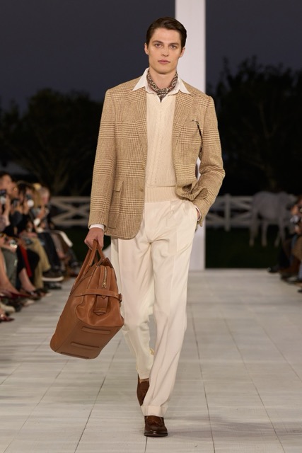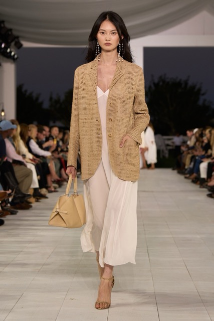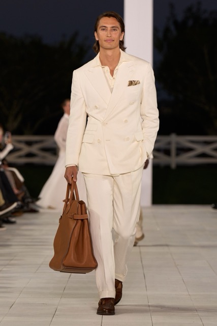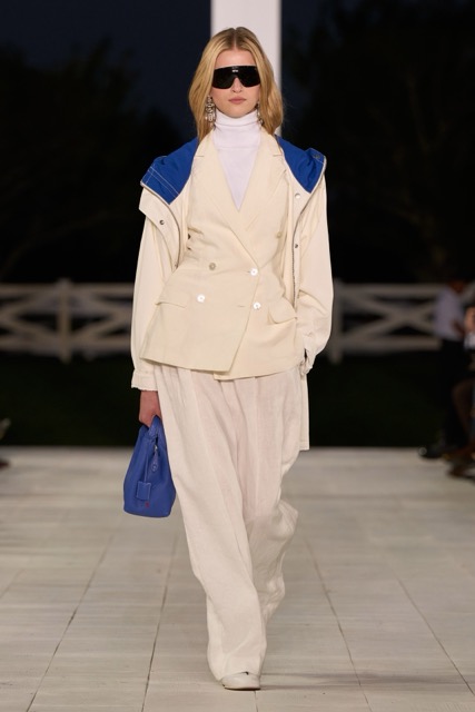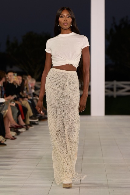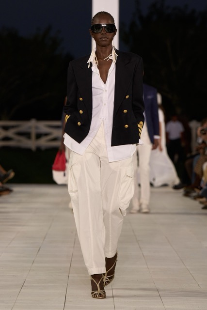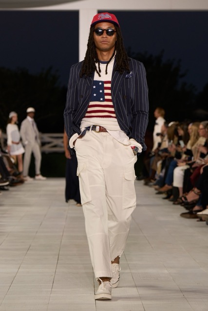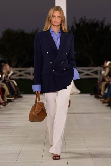 Drawing on his longstanding connection to the Hamptons, Ralph Lauren embraced elements of equestrian and seaside life. The runway, featuring supermodels like Christy Turlington and Naomi Campbell, presented a mix of menswear-inspired tailoring, Americana classics, and breezy, beach-ready outfits. Highlights included the iconic American flag sweater and nautical-inspired blue and white ensembles. Lauren’s attention to detail extended to accessories, including the new leather tote, “The Ralph,” inspired by vintage car interiors. With its multigenerational cast and elegant styling, the collection encapsulated a blend of rustic charm for the generationally wealthy. The show was an immersive experience, featuring vintage cars and a recreation of his Polo Bar, reaffirming the brand as a master of creating quintessential wannabe American luxury.