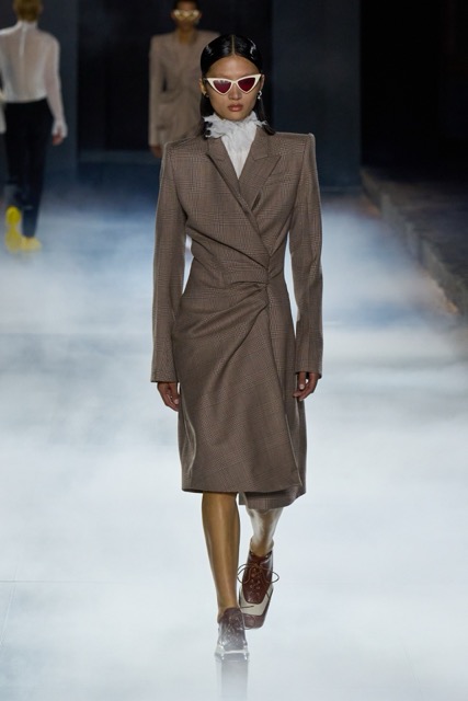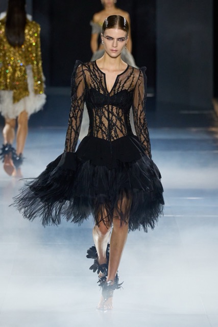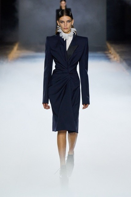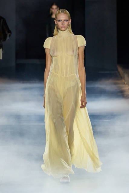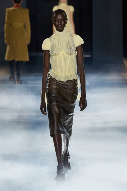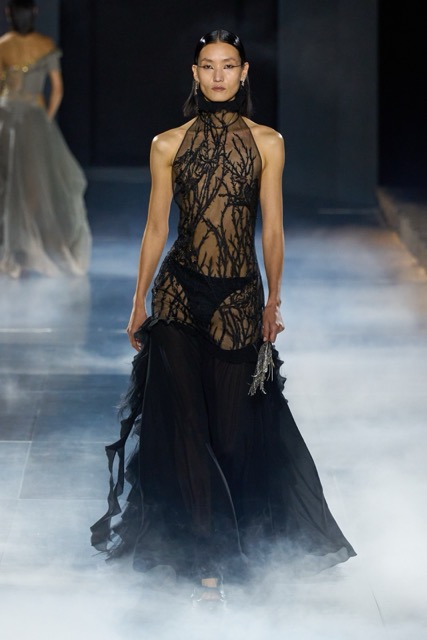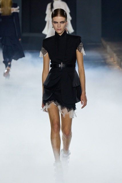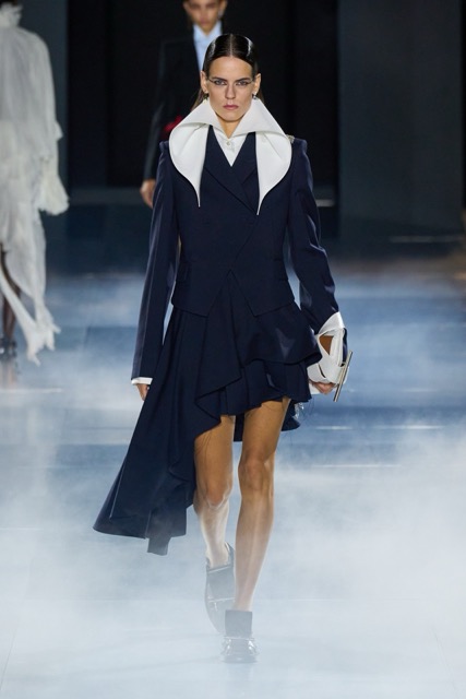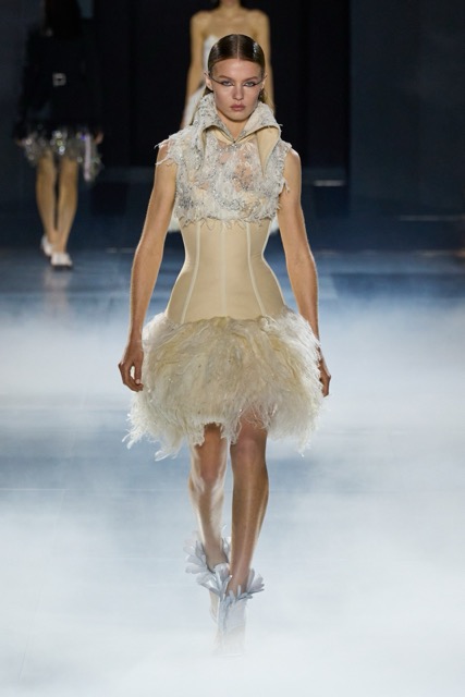 McGirr skillfully balanced McQueen’s iconic gothic flair with more romantic, wearable pieces. His exploration of the S-bend silhouette, combined with constricted tailoring and flowing fabrics, was a nod to McQueen’s legacy while showing McGirr’s confidence in evolving the brand.