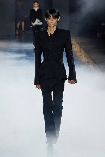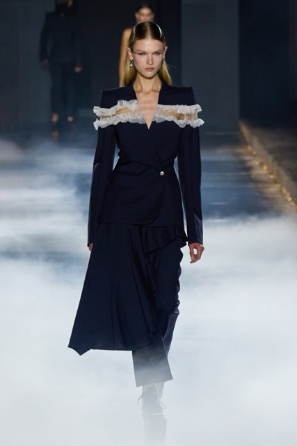 The collection was a harmonious blend of darkness and light, with the runway transformed into a smoky, ethereal setting. The collection featured twisted tailoring and sharp silhouettes, reminiscent of traditional British suiting, but with a subversive edge. Highlights included translucent silk chiffon and hand-stitched cobweb lace, creating an illusion of garments unraveling, yet meticulously controlled. The palette of ivory, jet black, and crepuscular hues like blazing yellow and orange added an energetic contrast to the darker tones. The clothing, a mix of sharp tailoring and ethereal fabrics, was the true star of the show. One standout feature was the use of ruffles and fringe, which added a touch of drama and femininity to the collection. The accessories, including mismatched earrings and platform shoes