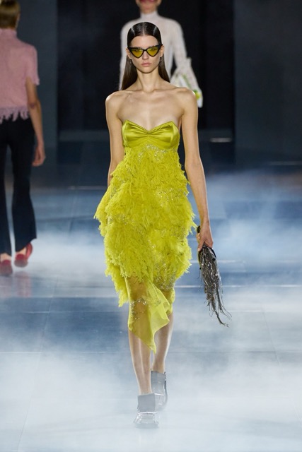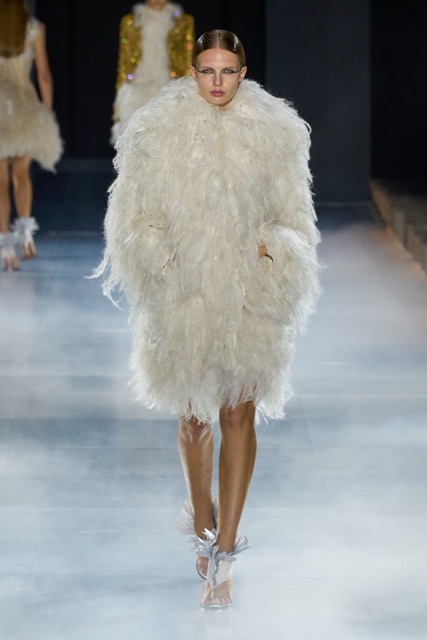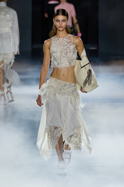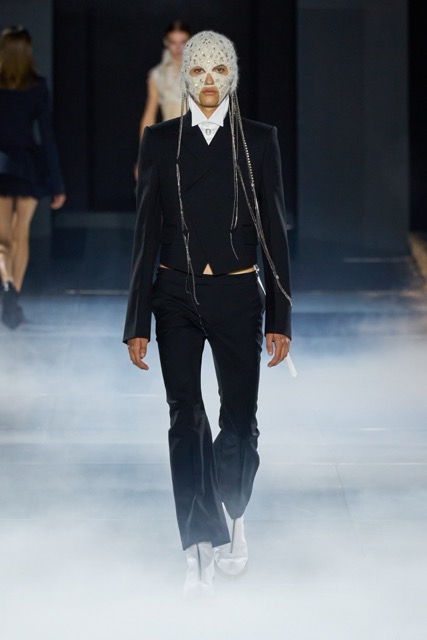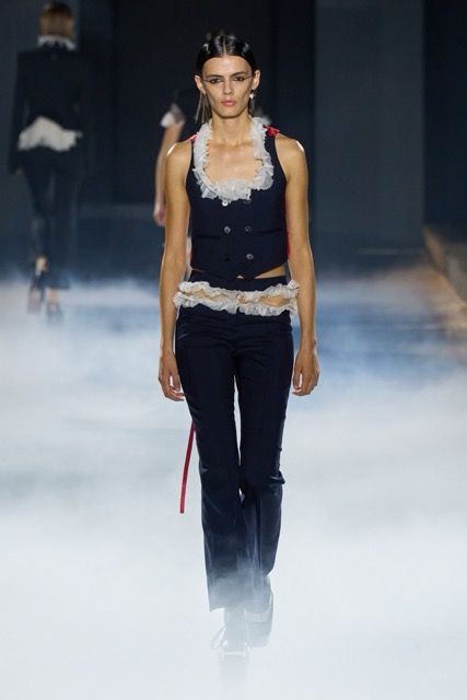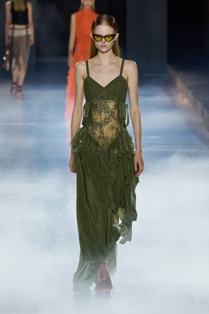 The standout moment was the final look—a crystal-encrusted gown worn barefoot, symbolizing McGirr’s grand vision for the brand’s future. Accessories, including mismatched earrings and chain details, added layers of intrigue, enhancing the collection’s bold aesthetic.