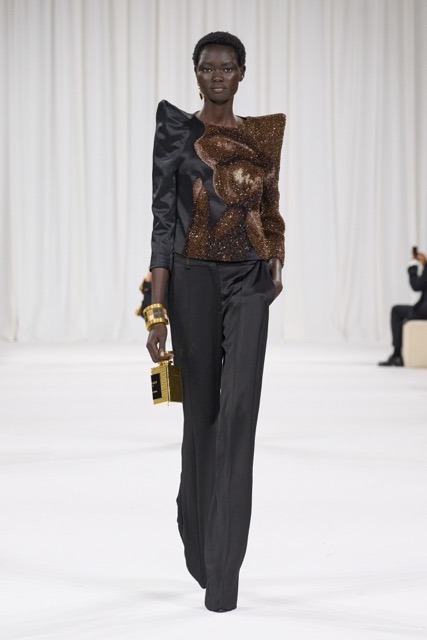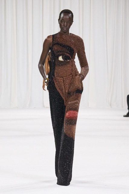 This Balmain collection is a striking display of Olivier Rousteing’s signature bold, architectural approach to fashion. The collection leans heavily into the house’s defining elements—those fiercely structured shoulders and angular silhouettes—but with fresh updates that keep it exciting. The craftsmanship shines through in every piece, with the precision cuts and sculptural tailoring showcasing the skill of Balmain’s artisans. Particularly impressive are the intricate hand-embroidered designs, where thousands of pearlescent beads create portraits of faces on jackets, dresses, and shorts.