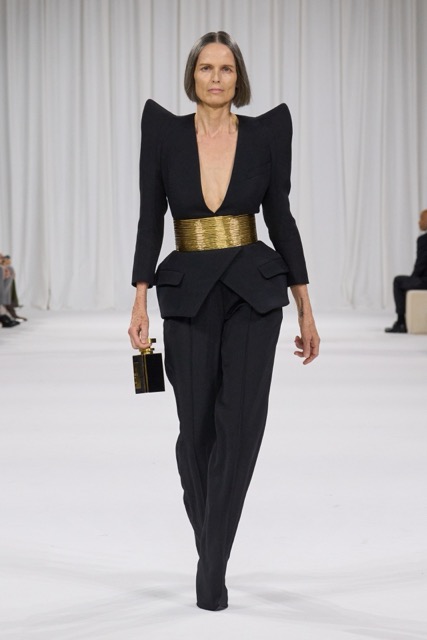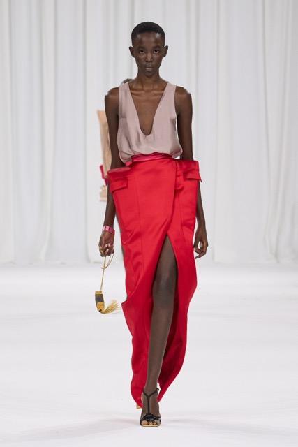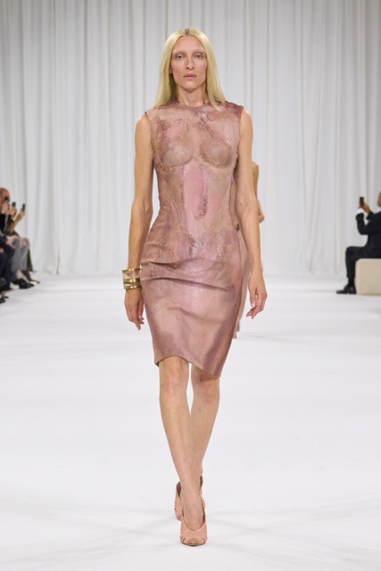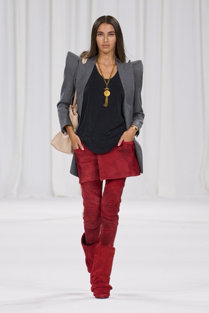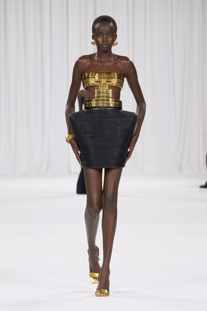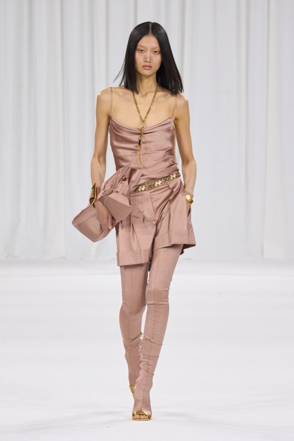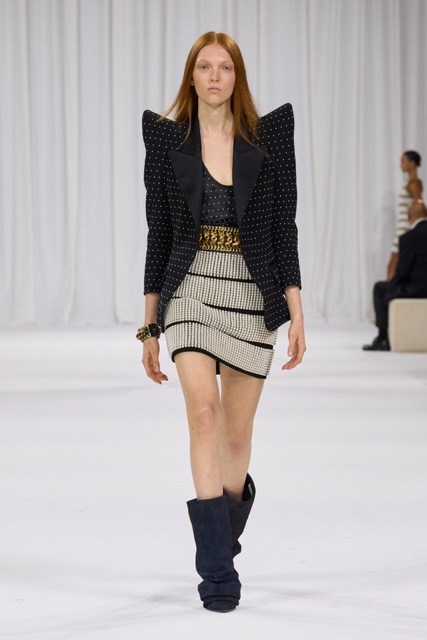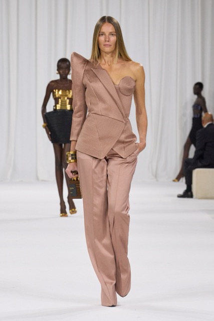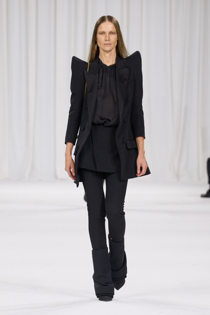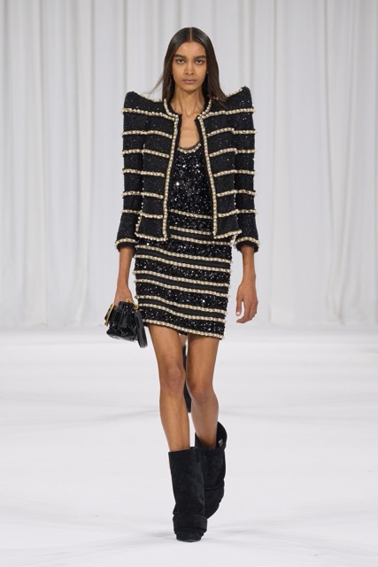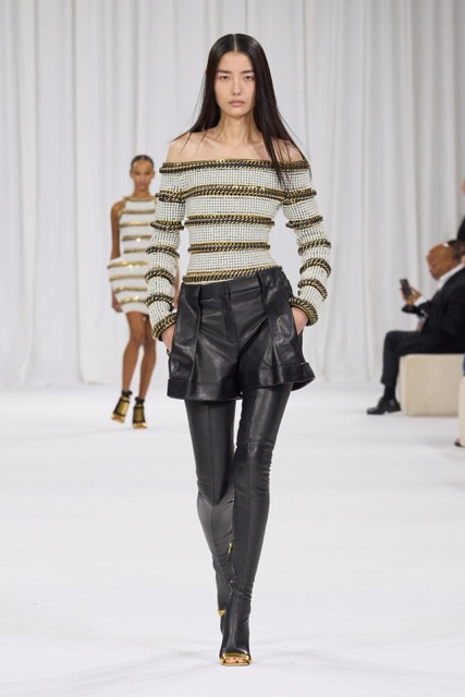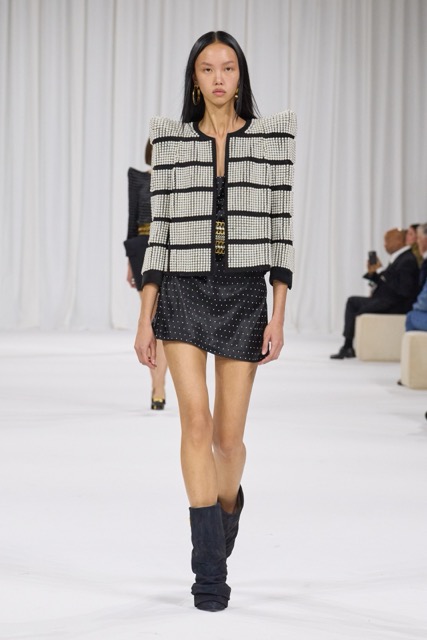 Rousteing also played with textures and shapes, giving us everything from multi-toned dresses inspired by makeup palettes to a clever trouser-boot combo that keeps the silhouette perfectly straight. There’s a great balance of strong tailoring and glamorous eveningwear, with cropped jackets, skirts, and exaggerated hips that make a statement without going over the top. You had these edgy, structured silhouettes with a hint of nostalgia, like the marinière stripes that are so quintessentially French. And the final looks—draped silk dresses in neutral tones—were simply stunning.