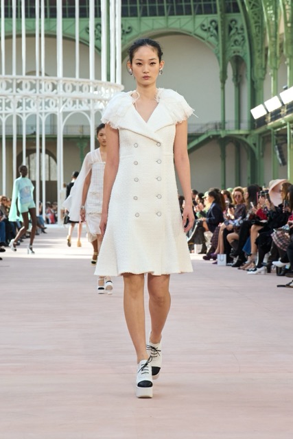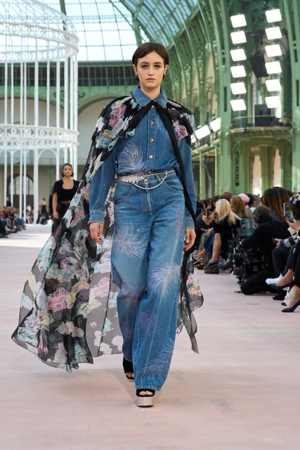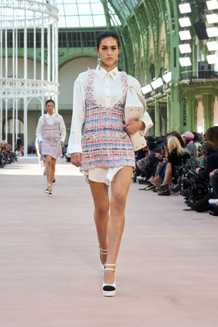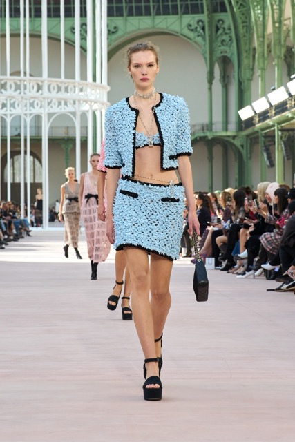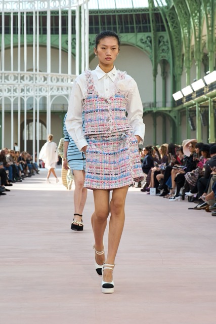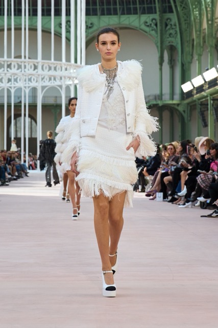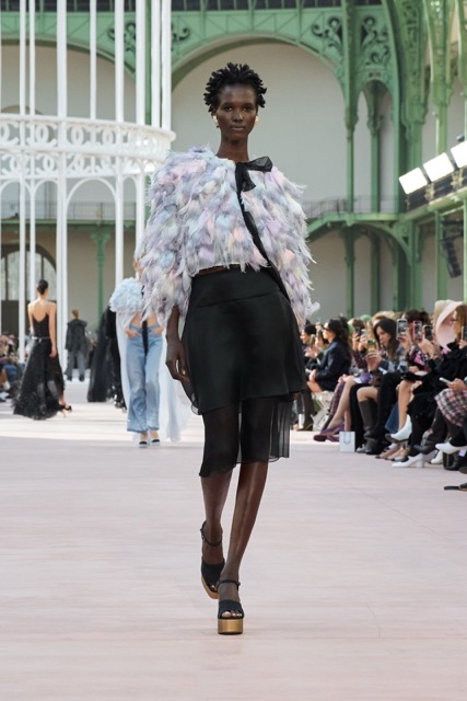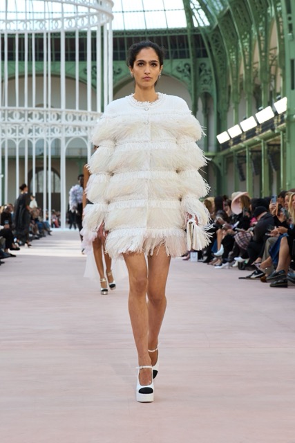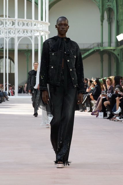 The concept of flight and freedom was clearly central, with feathers, flowing fabrics, and lightness featured heavily throughout the collection. While these elements made for beautiful imagery, the execution of these ideas felt somewhat repetitive. The tweed, which remains Chanel’s signature, was given a refreshing twist with pastel hues and some playful slits in the skirts, but at times, the fabric felt overused. It was reimagined in a variety of ways—pastel-colored, sparkly, and even in short suits—but the numerous iterations of tweed became redundant, especially when juxtaposed against some of the more experimental pieces like the denim jackets embellished with sequins. While these were intriguing, they didn’t quite gel with the overall tone of the collection. The collection also struggled to find a balance between playful and classic, with some looks feeling too casual or youthful, as if the designs were trying too hard to appeal to a younger demographic without fully committing to that direction.