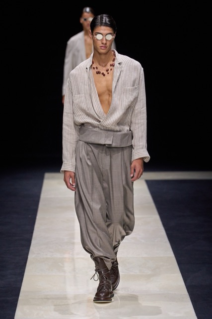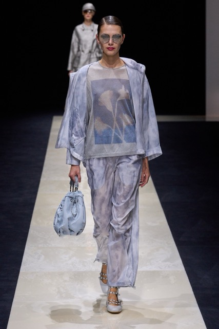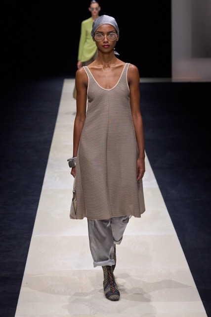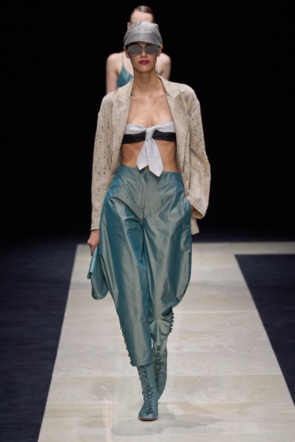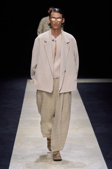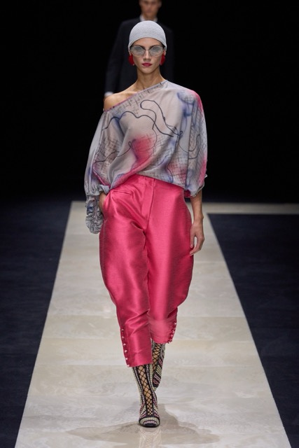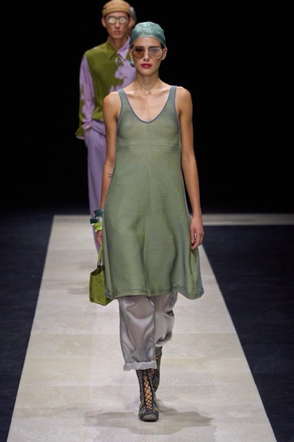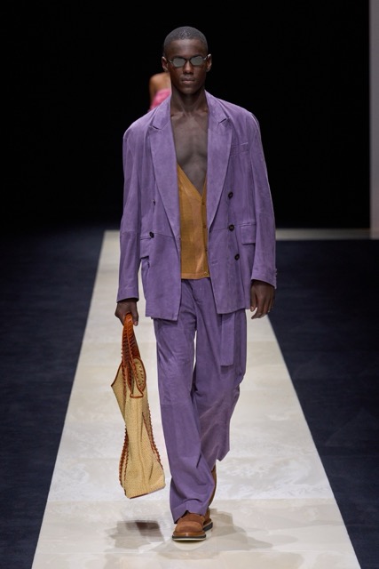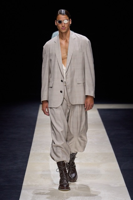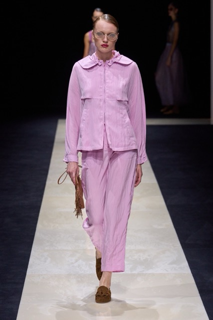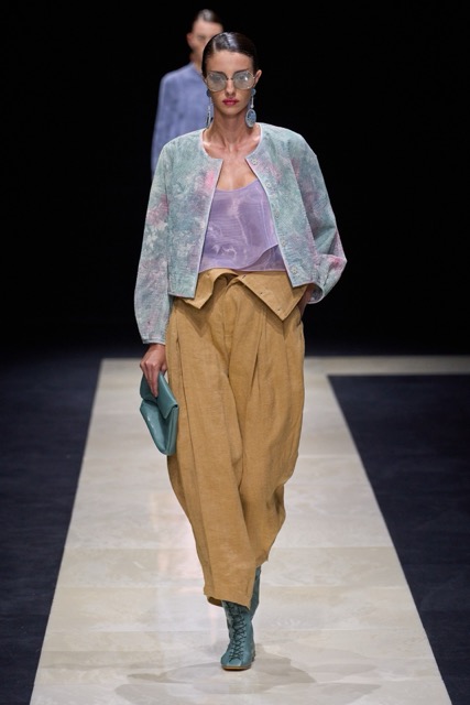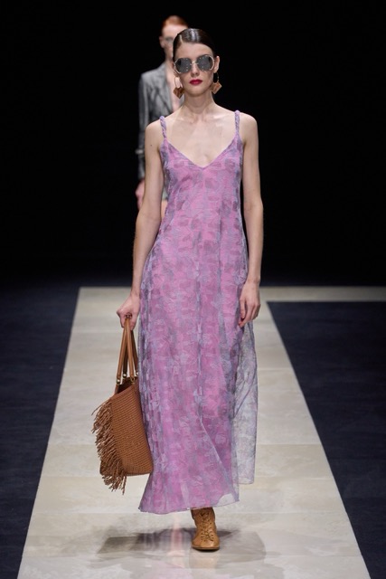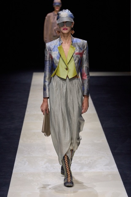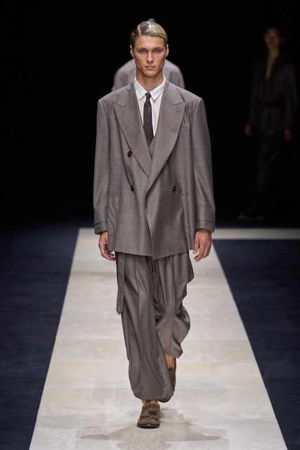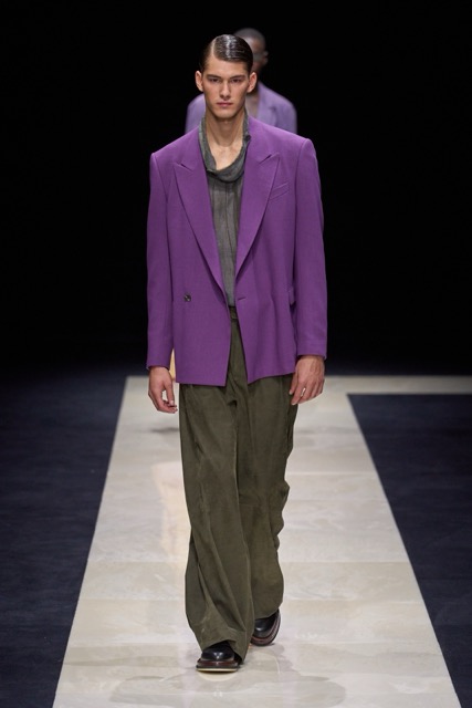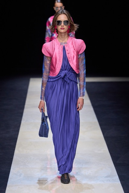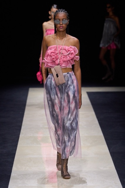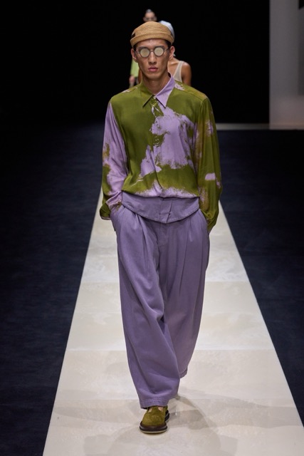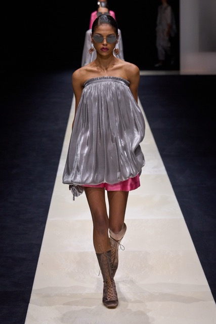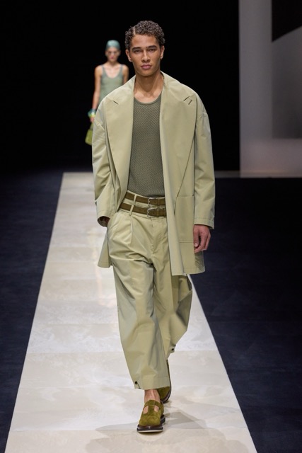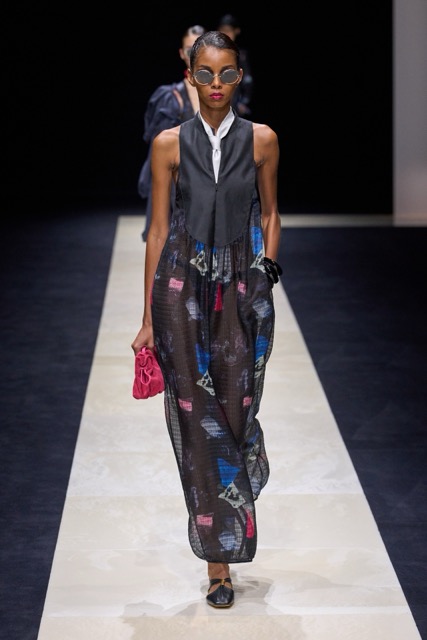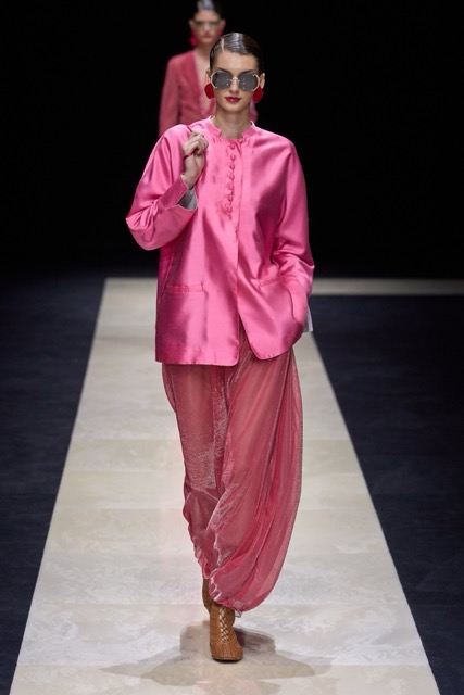 Throughout the collection, Armani balanced tradition and innovation.The runway was alive with contrasts. For women, tailored suiting—sharp yet gamine—was softened by bursts of hot pink and cobalt blue, giving the classic grey and black palette a youthful energy. For men, Armani took his trademark suiting and dialed it up with dramatic volume: pleated pants wide enough for four legs and jackets with skirts that dropped to mid-thigh. The playfulness didn’t stop there. Sporty vest dresses shimmered in kaleidoscopic stripes, while watercolor-toned parkas and harnesses added an edge to the otherwise sophisticated lineup.The show’s color palette was vibrant, featuring shades of pink, sage, and light grey, contrasted with darker, deeper hues.