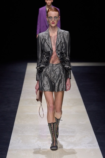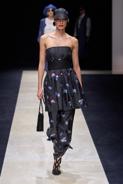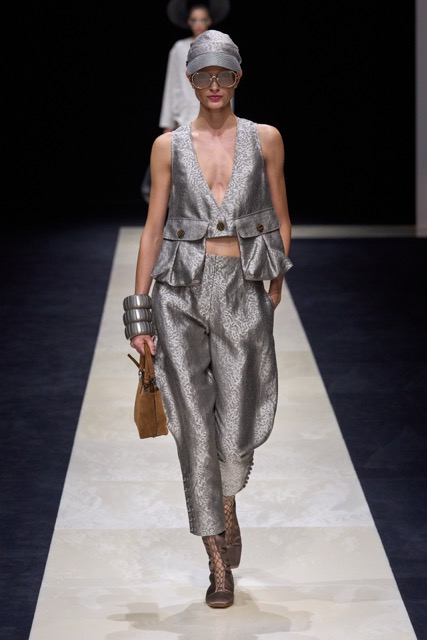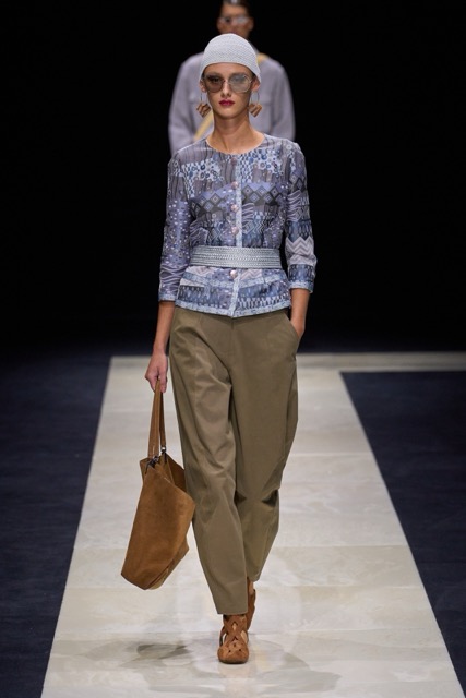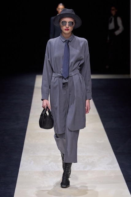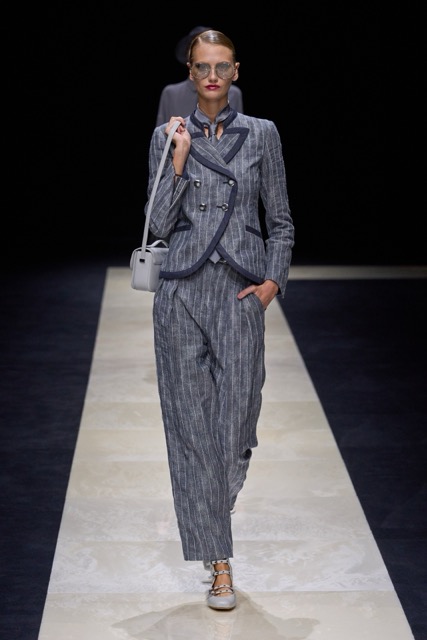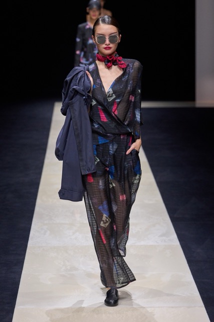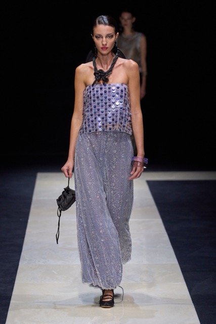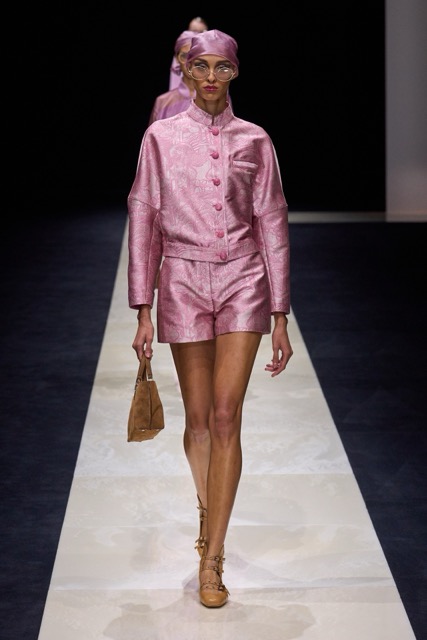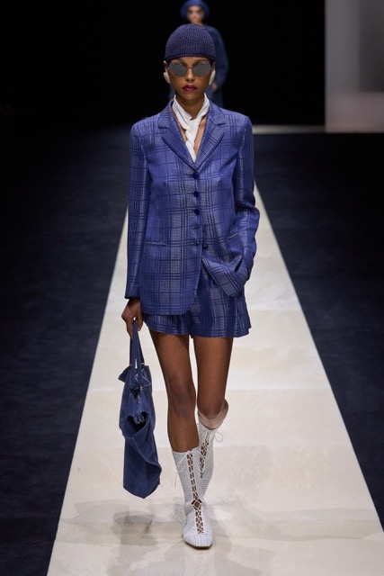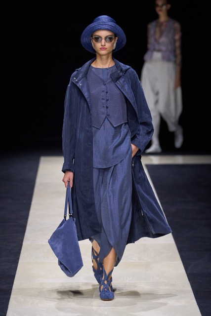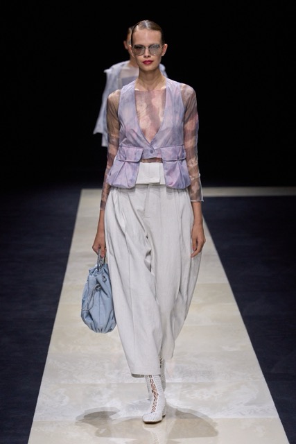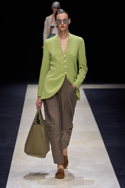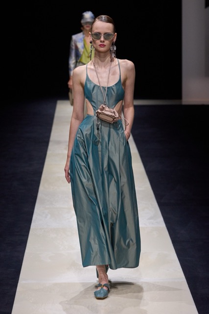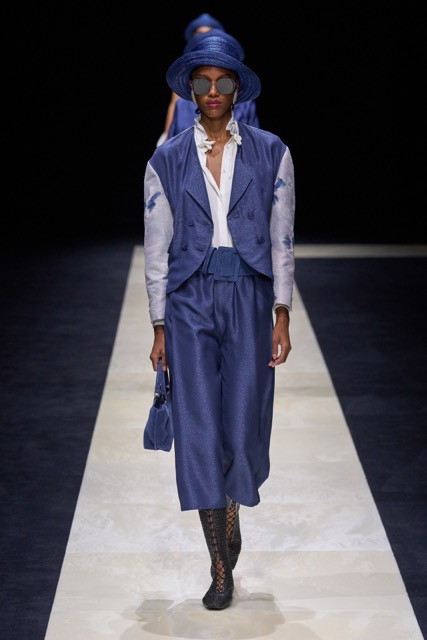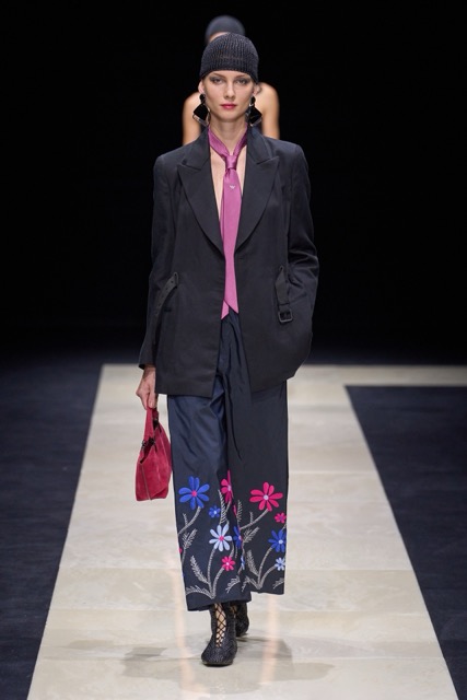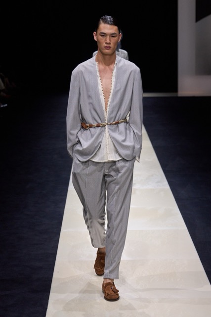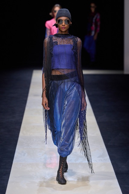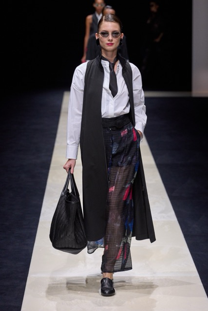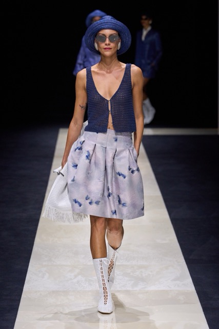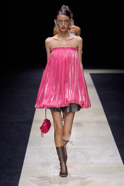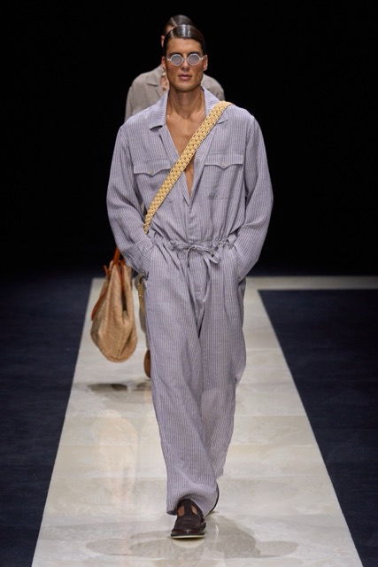Throughout the collection, Armani balanced tradition and innovation.The runway was alive with contrasts. For women, tailored suiting—sharp yet gamine—was softened by bursts of hot pink and cobalt blue, giving the classic grey and black palette a youthful energy. For men, Armani took his trademark suiting and dialed it up with dramatic volume: pleated pants wide enough for four legs and jackets with skirts that dropped to mid-thigh. The playfulness didn’t stop there. Sporty vest dresses shimmered in kaleidoscopic stripes, while watercolor-toned parkas and harnesses added an edge to the otherwise sophisticated lineup.The show’s color palette was vibrant, featuring shades of pink, sage, and light grey, contrasted with darker, deeper hues.