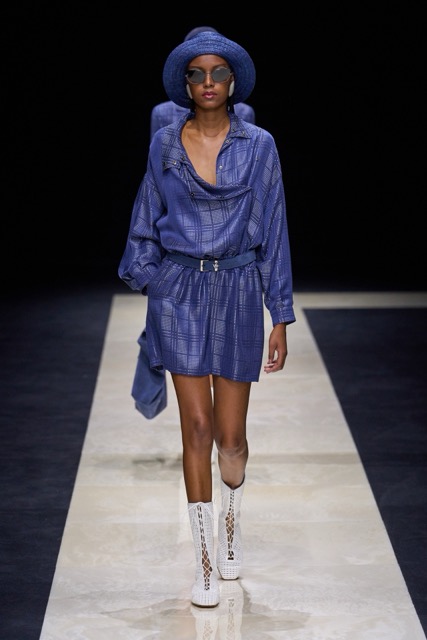This collection encapsulates Giorgio Armani’s philosophy of “changing so as not to change,” reflecting a seamless blend of past and present. A highlight of the show was the striking image of a female model in a suit, harking back to the ‘90s, now reimagined to embrace fluidity in fashion. Armani’s signature suiting, particularly the gamine silhouettes for women, felt sharp and playful, with bursts of vibrant color. The menswear, meanwhile, took on a more avant-garde approach, exploring extreme volumes with pleated pants and extended jacket skirts.