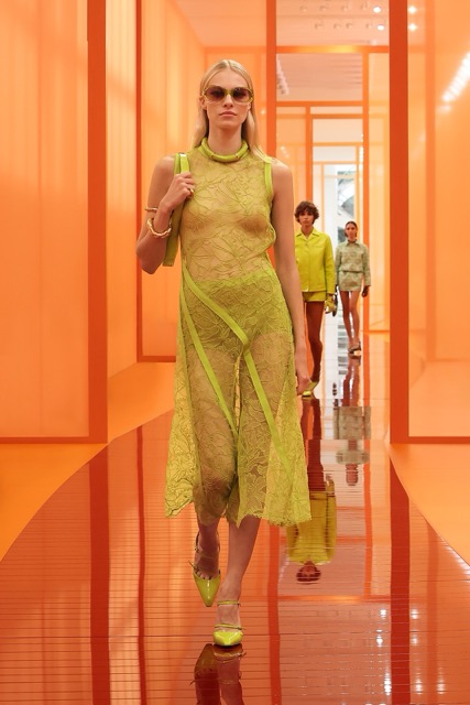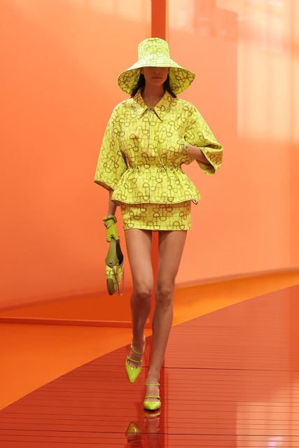 De Sarno’s vision reflects a thoughtful exploration of Gucci’s heritage, intertwining motifs like the iconic bamboo and horsebit, reimagined through fresh silhouettes and vibrant colors. The runway showcased a diverse range of pieces, including low-slung trousers, draped gowns, and tailored outerwear, all crafted with a focus on comfort and elegance. The color palette oscillated between deep reds, neon greens, and neutrals, creating a rich visual tapestry that resonates with contemporary fashion sensibilities.