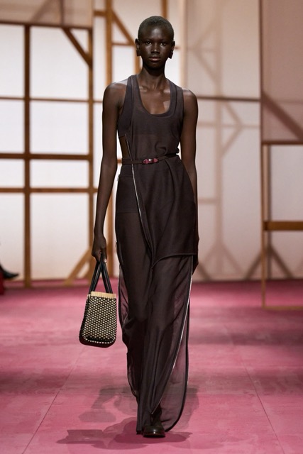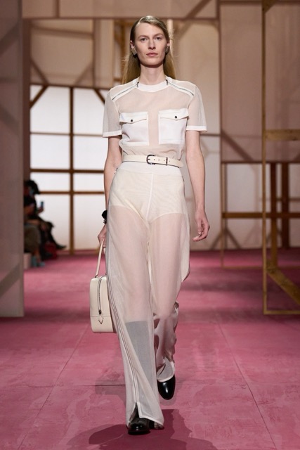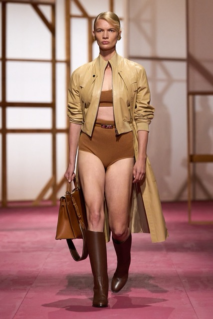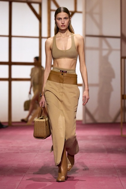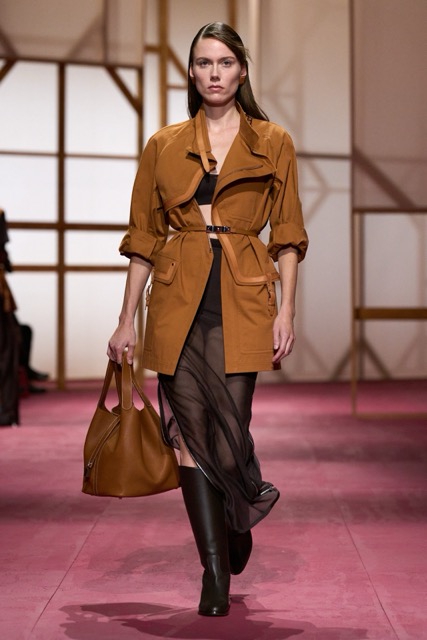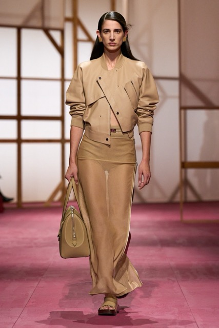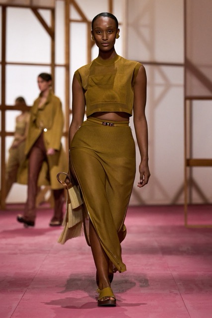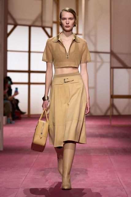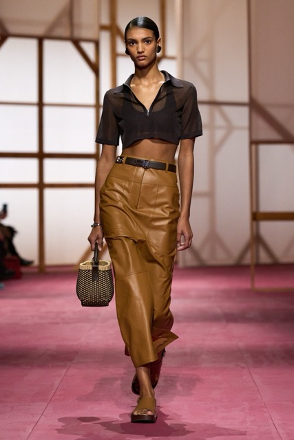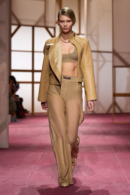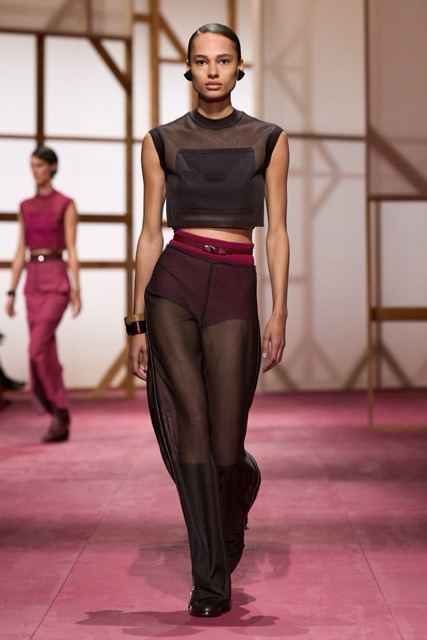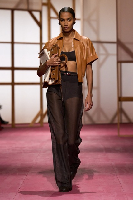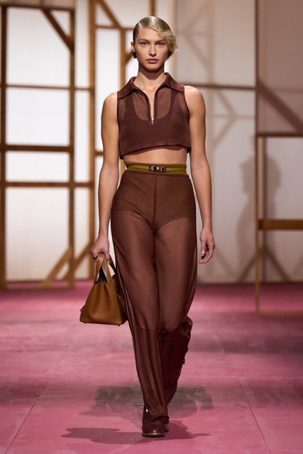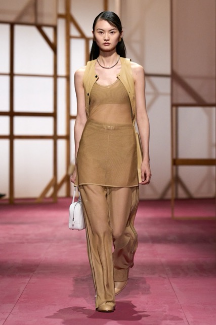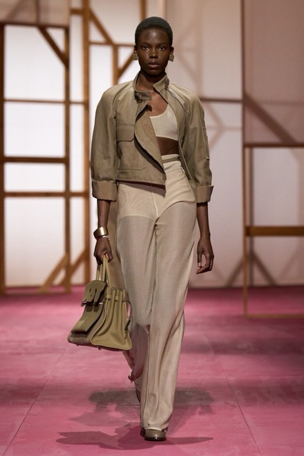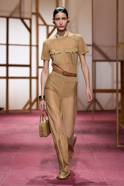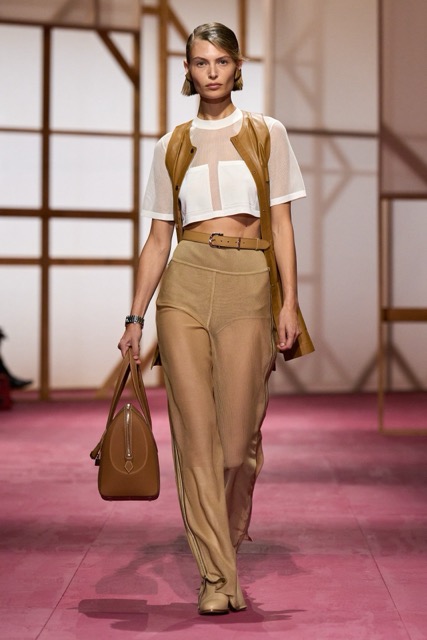 With sheer fabrics front and center, from breezy pants to tunics, it’s all about letting the skin breathe while still maintaining a high chic look. The Hermes collection balances this airy feel with sturdier pieces like leather jackets, slim belts, and classic Hermès handbags, giving everything a mix of lightness and structure.