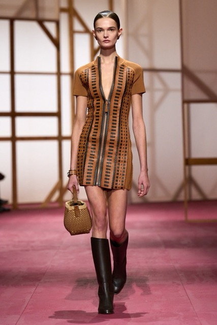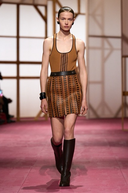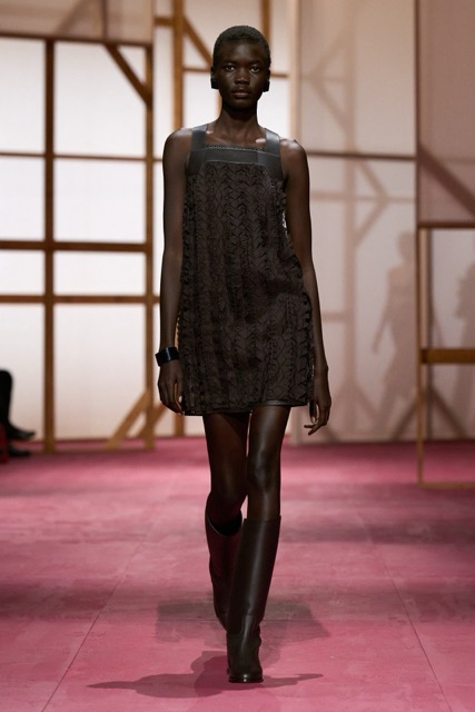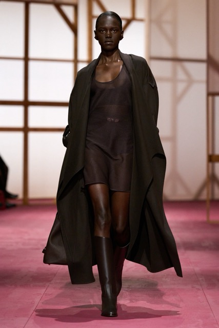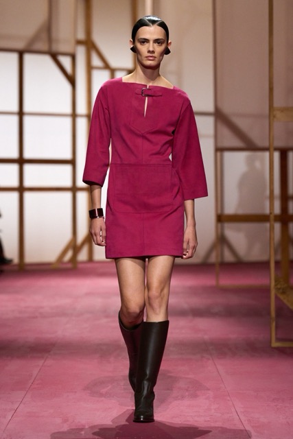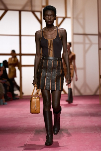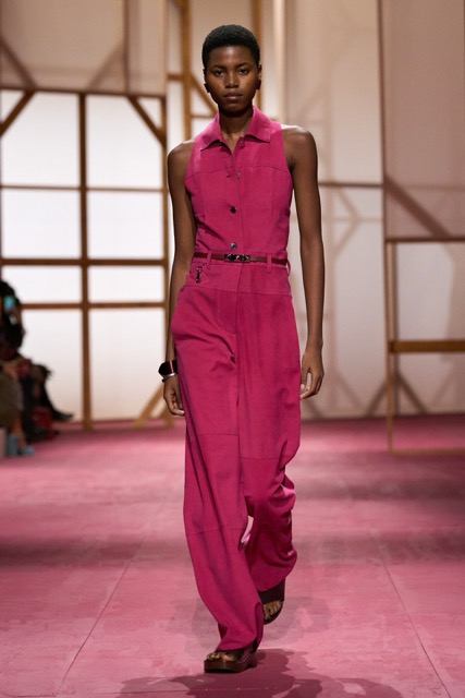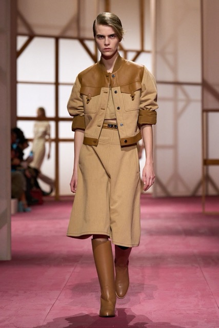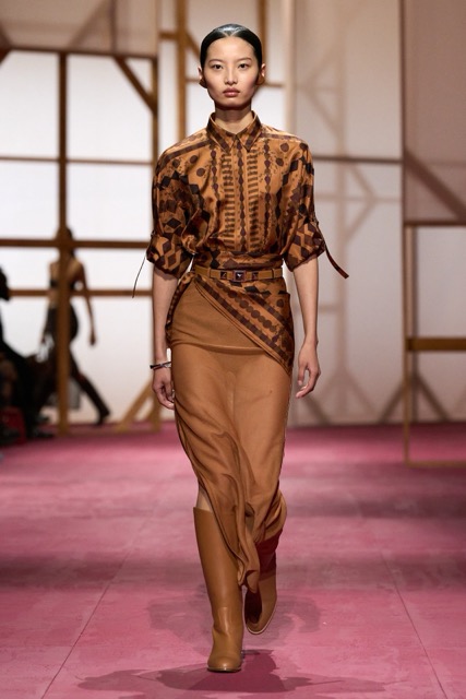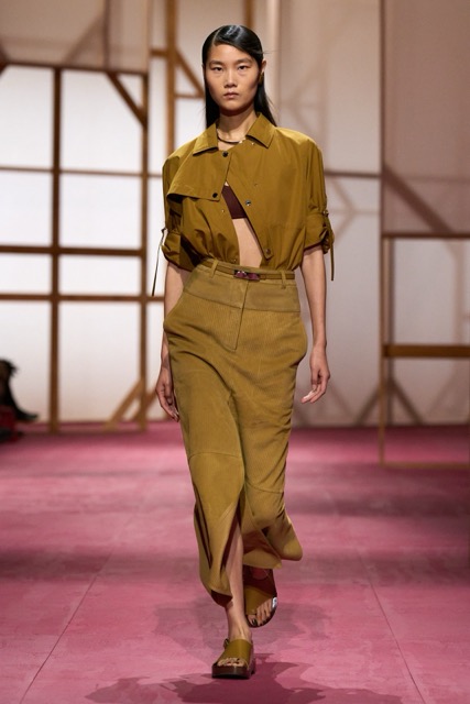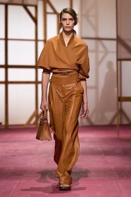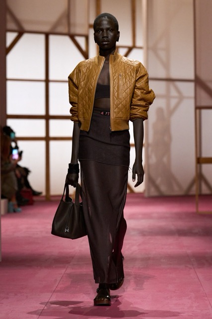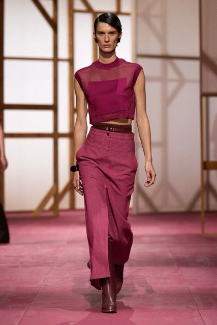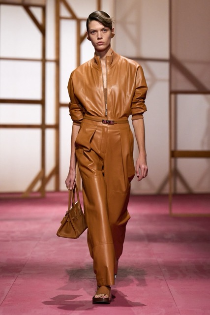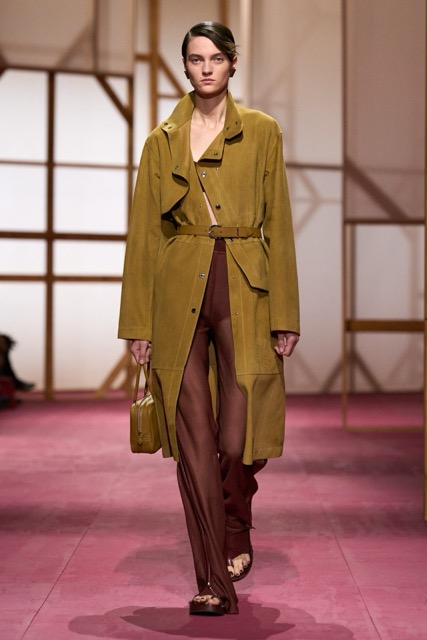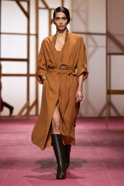 The color palette leans toward earthy tones—camel, chocolate, and marigold—with a few surprising pops of fuchsia to keep things interesting. Footwear ranges from sleek riding boots to comfy clog sandals, bringing a modern twist to Hermès’ classic equestrian roots.