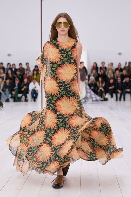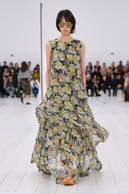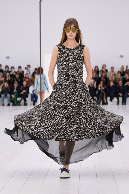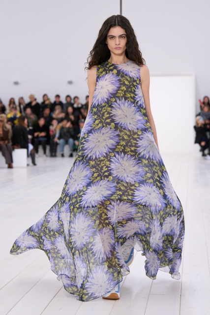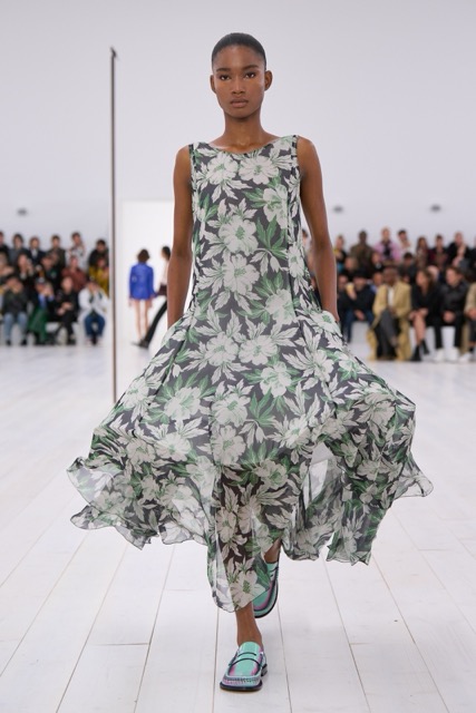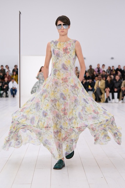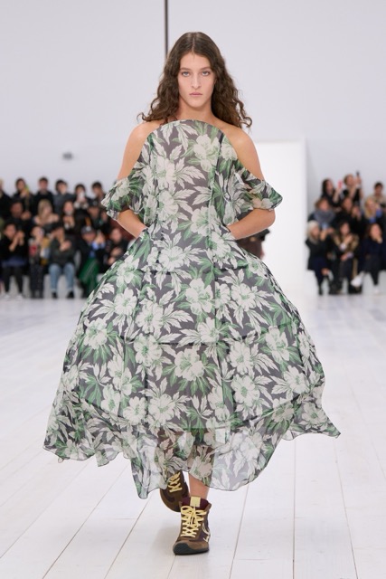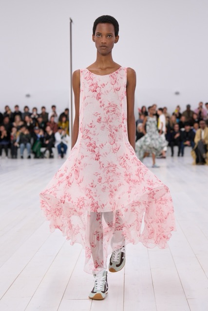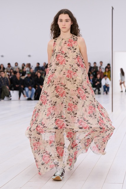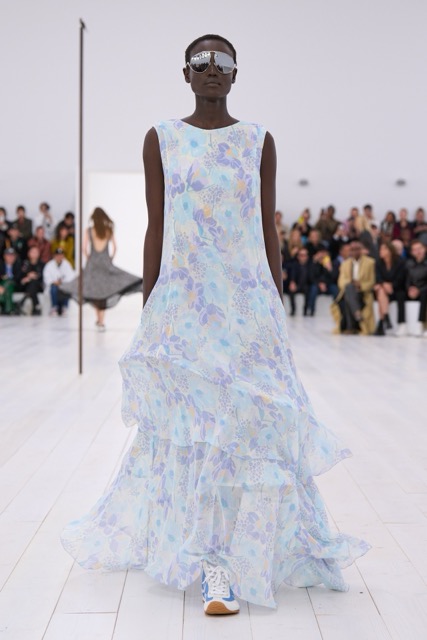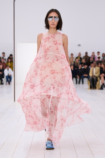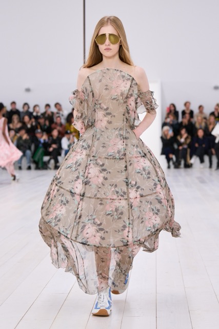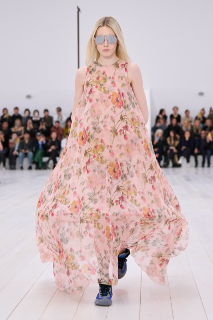 Anderson played with proportions and historical references, reinventing classic silhouettes in unexpected ways. One standout was the crinoline dress, traditionally known for its rigidity, which he transformed into a light, floating form. The fabric, delicate organza and silk, billowed around wire frames, creating a sense of movement as models walked. These dresses, with their sheer layers and floral prints, felt almost weightless, defying the bulkiness often associated with such designs.