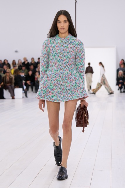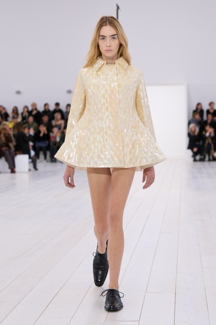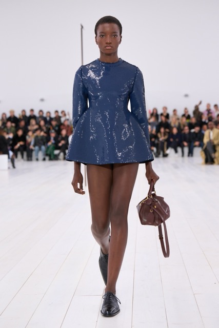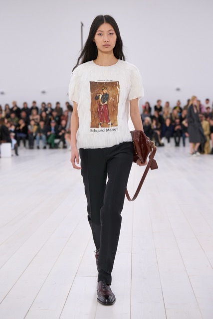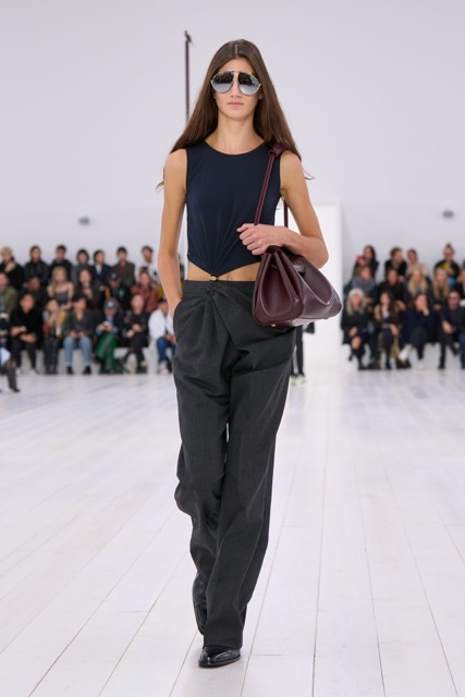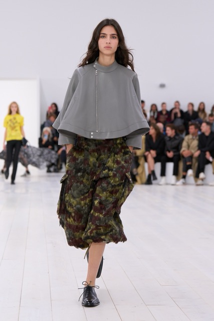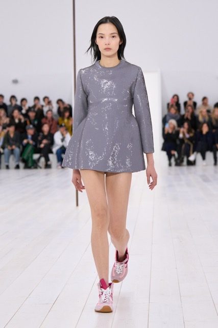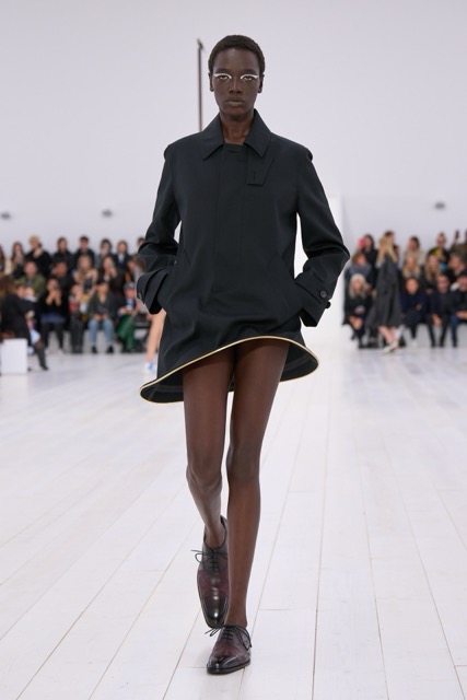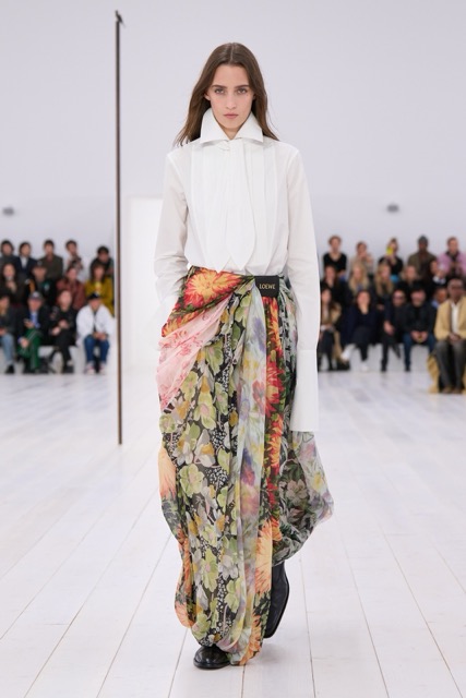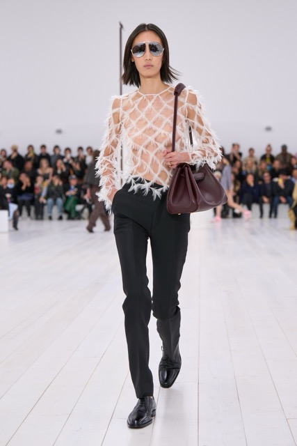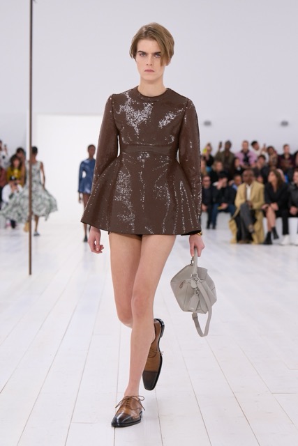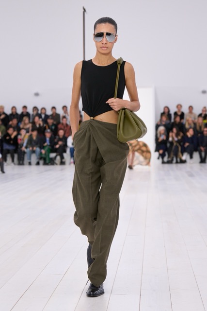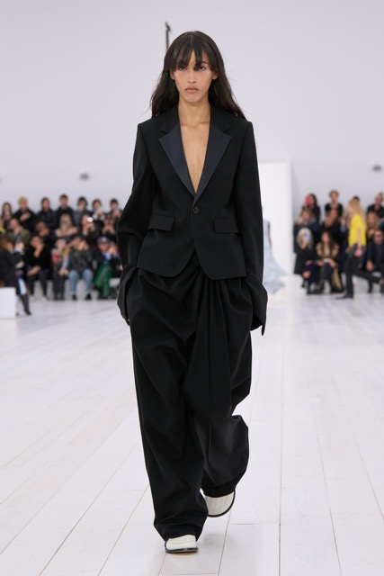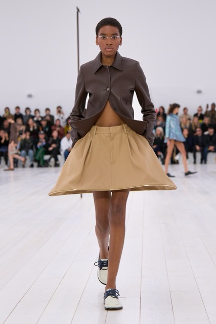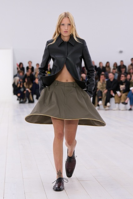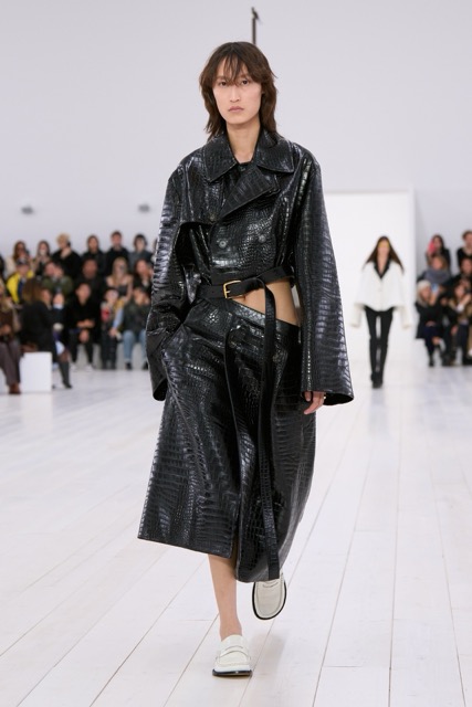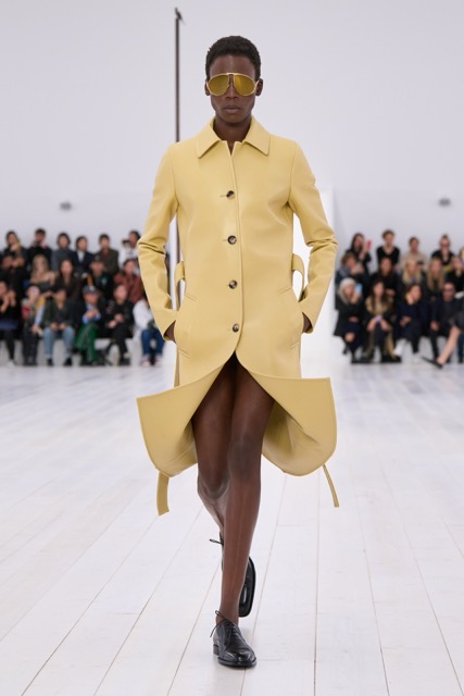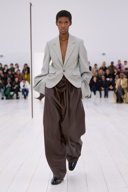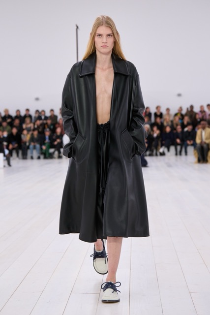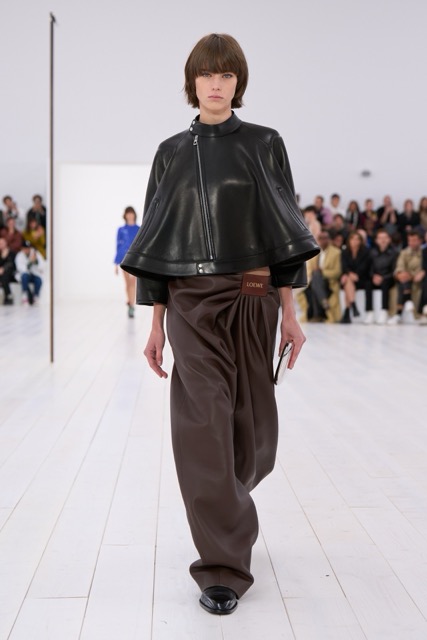 Anderson’s tailoring was another highlight. Slouchy suits with single-button jackets and gathered-waist pants balanced elegance with ease. The silhouettes were relaxed yet precise, offering a modern take on traditional tailoring. Leather, a Loewe signature, was crafted into sleek coats with flared hems and cropped capes that seemed to be caught mid-swing, adding an architectural quality to the garments.