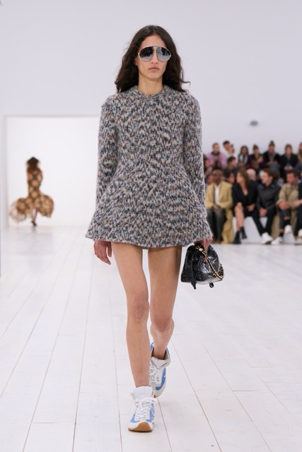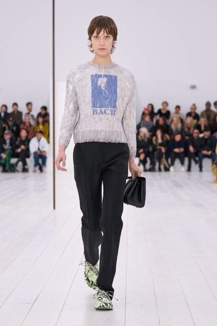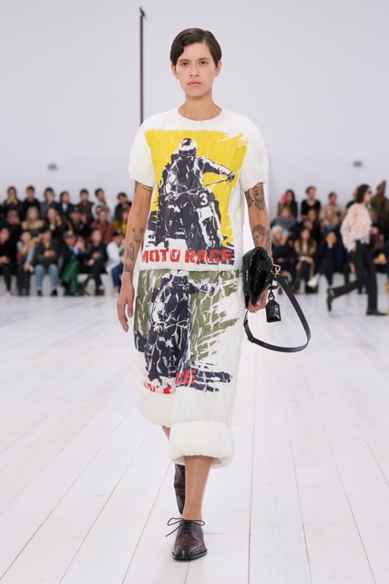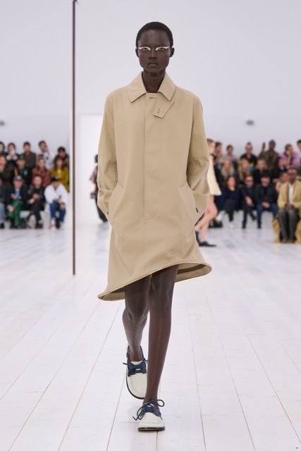 Accessories were equally inventive. Alongside fresh iterations of the popular Puzzle bag, Anderson introduced the Madrid, a trapezoidal bag that added a new geometric shape to Loewe’s accessory repertoire. Paired with oxfords, boat shoes, and Ballet Runner sneakers, the collection had a grounded practicality amidst its avant-garde designs.