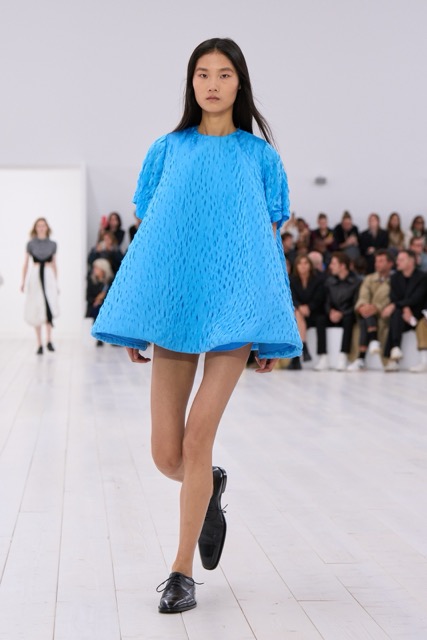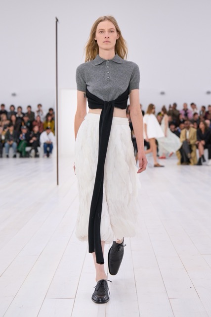 The show’s setting—a minimalist white room centered around a small bird sculpture by Tracey Emin—symbolized Anderson’s theme of “radical reduction.” Yet, this reduction wasn’t a lack of creativity but a focus on refining silhouettes and textures to their purest forms.