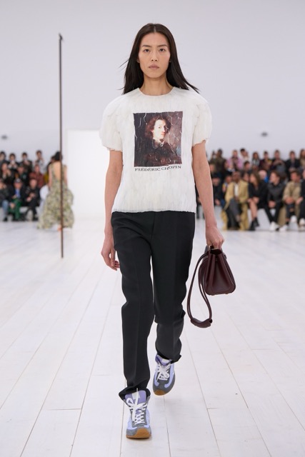 The collection also embraced playful, surreal elements. Tourist T-shirts, reimagined with feathers and printed with portraits of classical composers like Chopin and Mozart, added a whimsical twist. These, along with sequined mini-dresses and iridescent shells, fused art and fashion in a tactile, visual way.