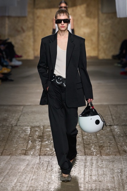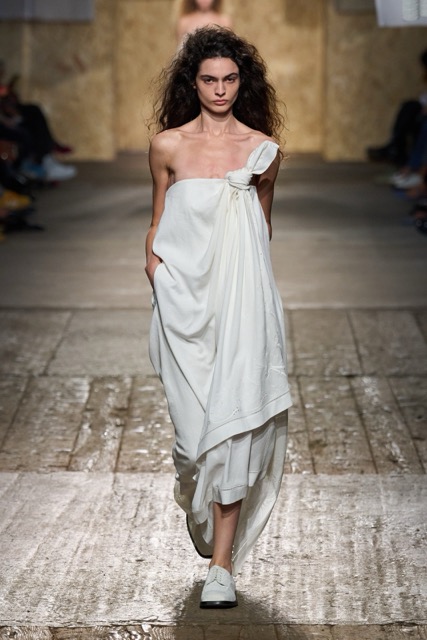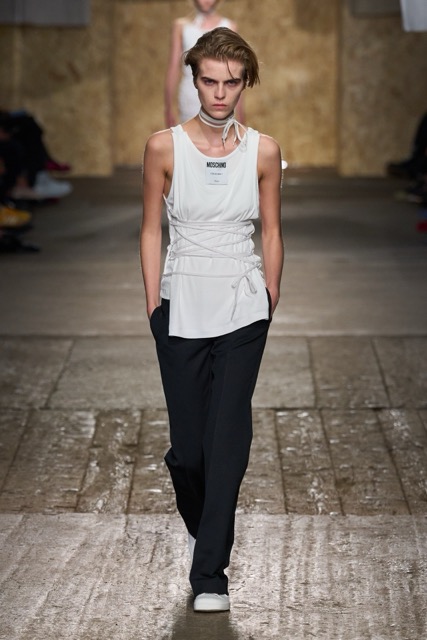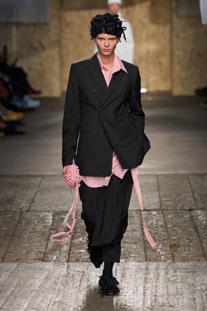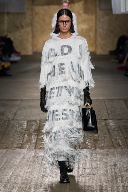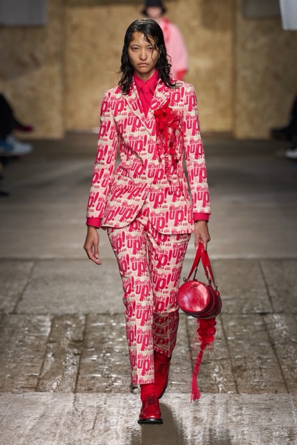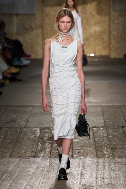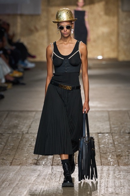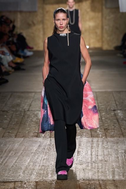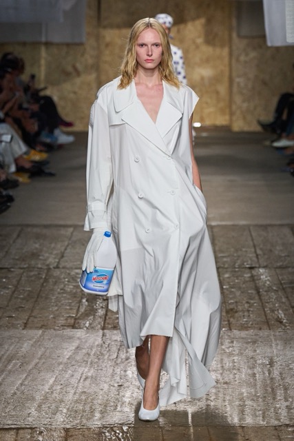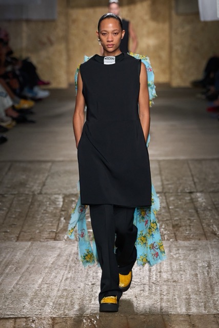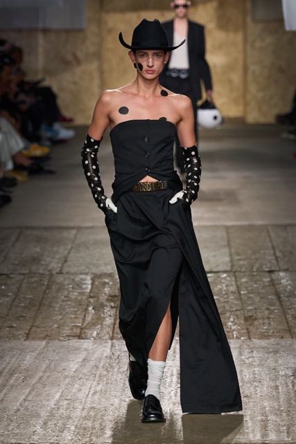 The collection’s accessories, including bold slogans and whimsical objects like detergent-shaped bags, balance satire and style, making a statement while maintaining Moschino’s signature humor. Highlights include deconstructed little black dresses and outerwear crafted from shoelaces.