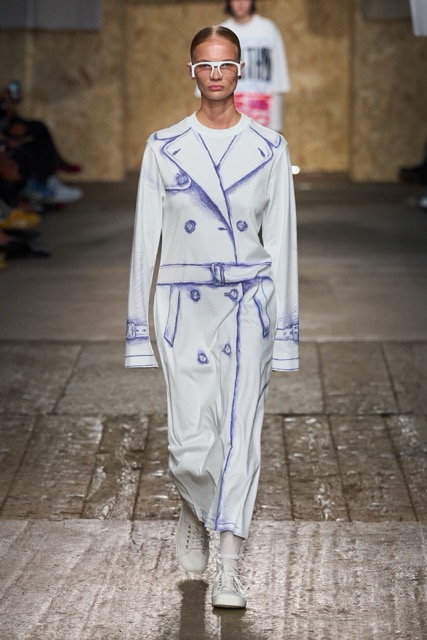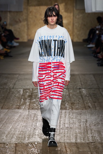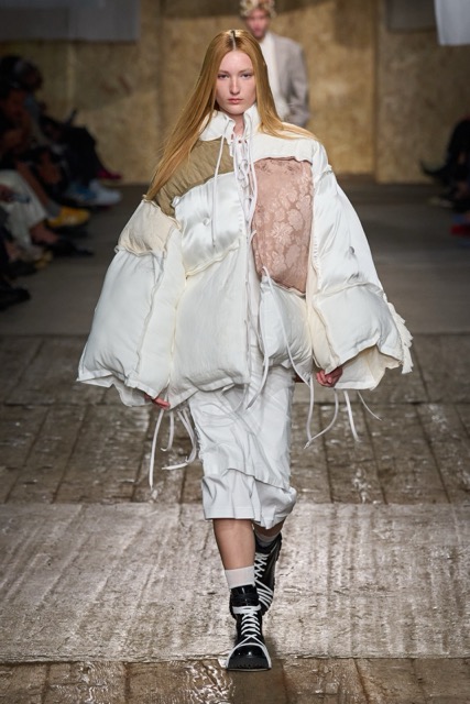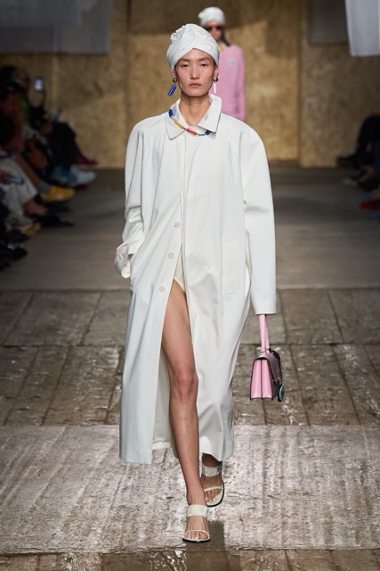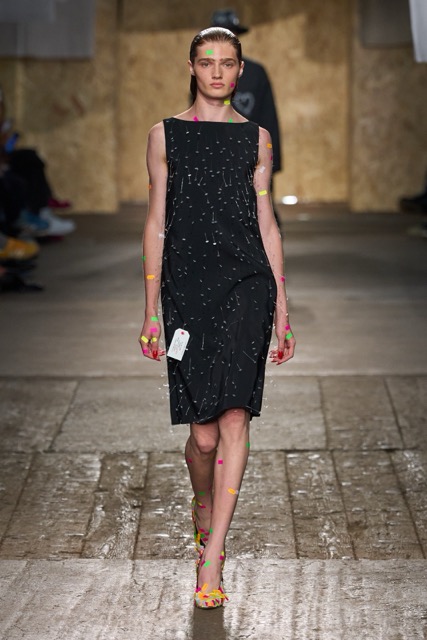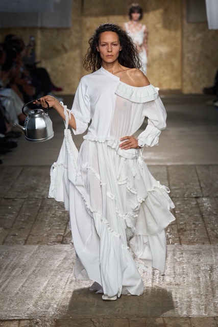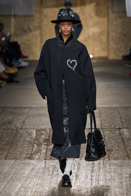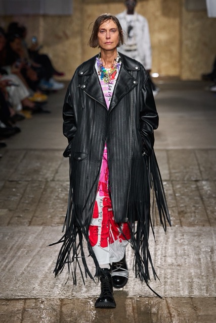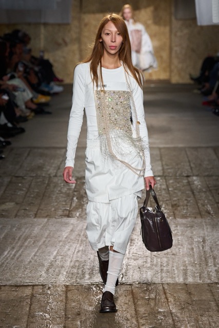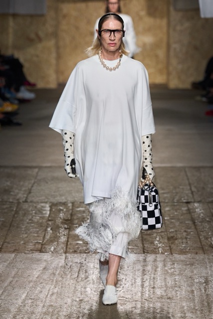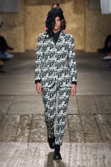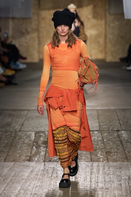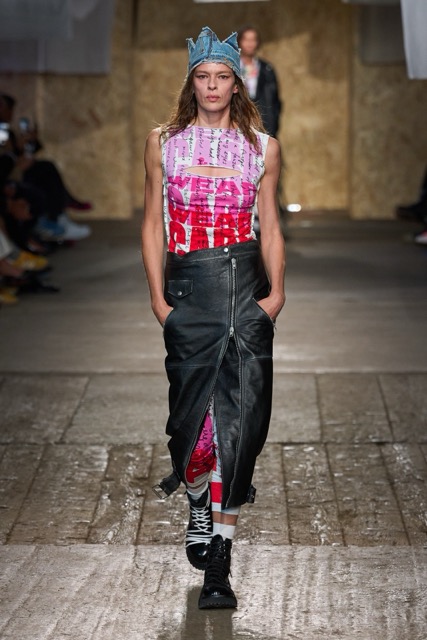 The collection’s accessories, including bold slogans and whimsical objects like detergent-shaped bags, balance satire and style, making a statement while maintaining Moschino’s signature humor. Highlights include deconstructed little black dresses and outerwear crafted from shoelaces.