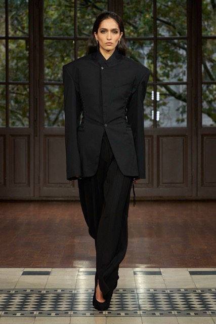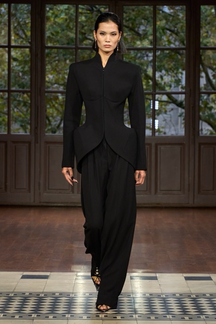 The collection, presented in the intimate setting of Le Trianon in Pigalle, brings a shift in focus—from Cadwallader’s usual theatrical spectacles to a more detailed exploration of craftsmanship. Jackets with wide, structured shoulders mimic blossoming flowers, while sleek pants and skirts emphasize the geometry of the human form. The use of delicate, hand-painted floral motifs on velvet and crystal-embellished dresses provides a contrast to the harder, corset-inspired tailoring, delivering a unique fusion of softness and sharpness.