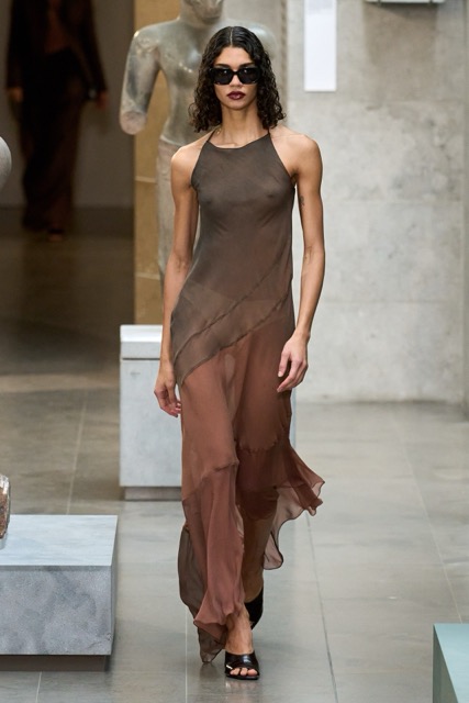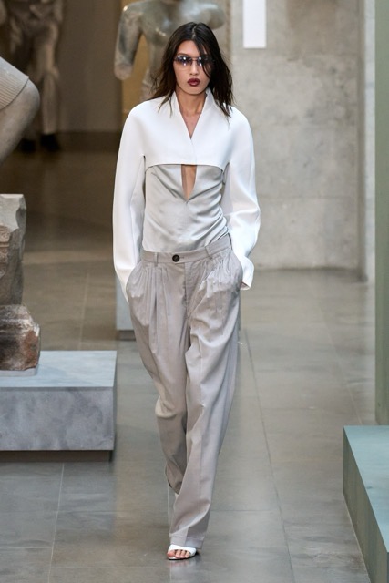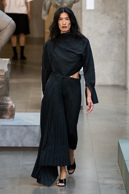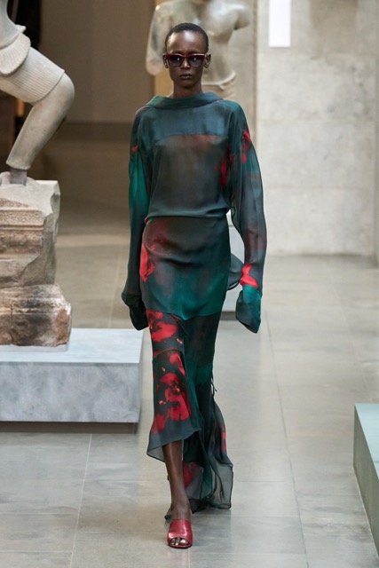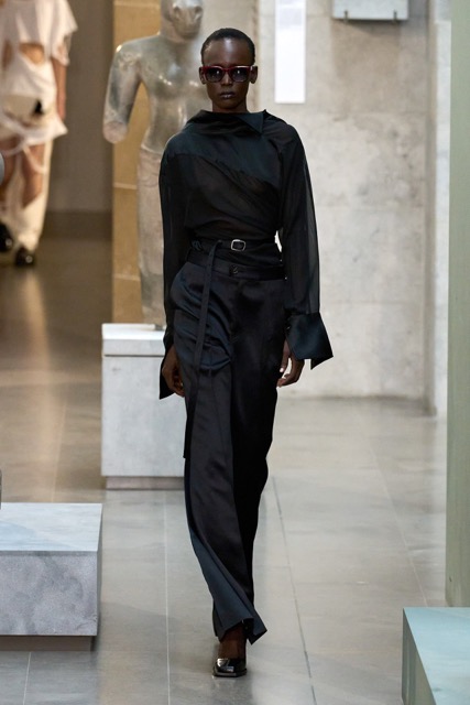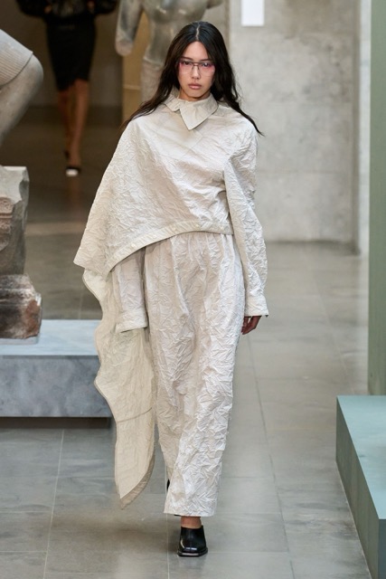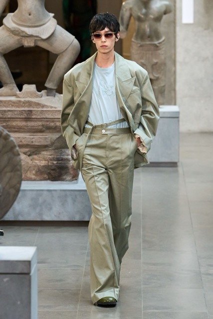 Held at the Musée Guimet, home to one of the largest collections of Asian art outside of Asia, the show was a fitting backdrop for this Peter Do collection. Titled “Grounded,” the show featured fabrics dyed using traditional techniques from Thailand, giving pieces a unique, earthy feel. Do’s collaboration with Philip Huang brought natural elements like leaves and tree bark into the dyeing process, resulting in soft, ombré patterns on fabrics like silk and chiffon.