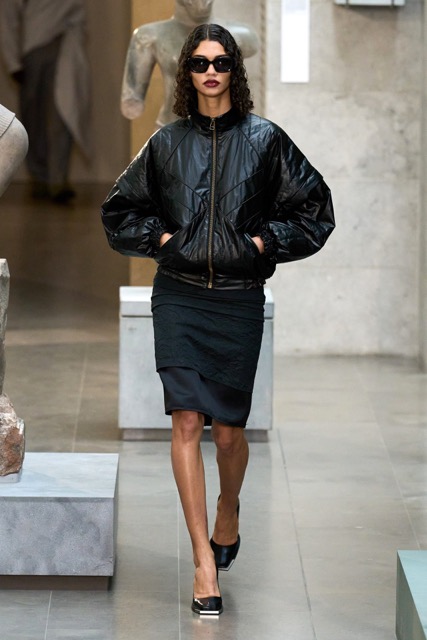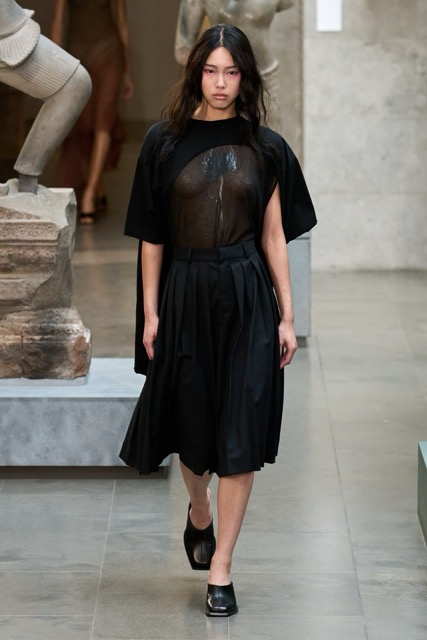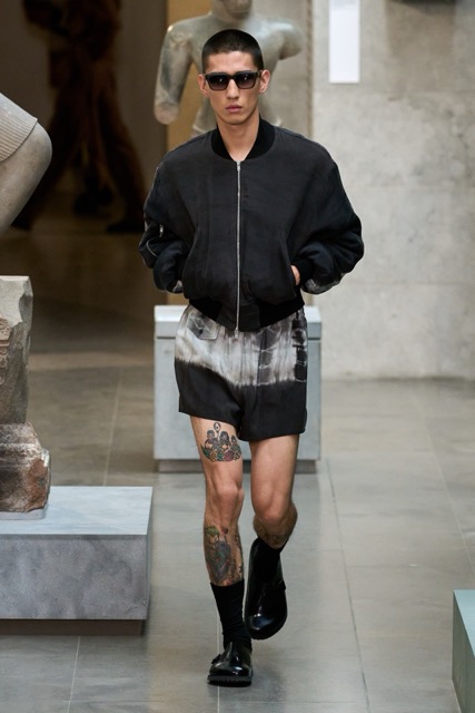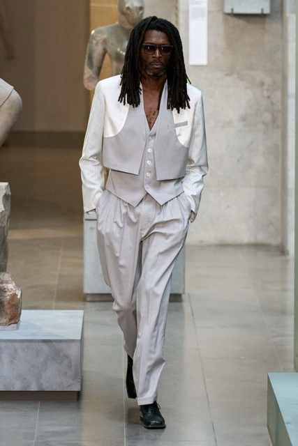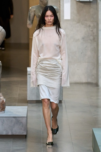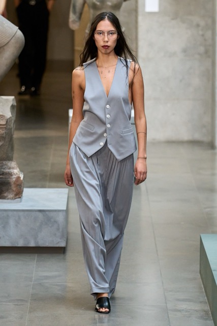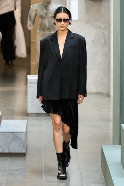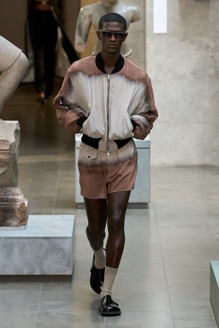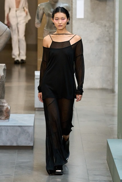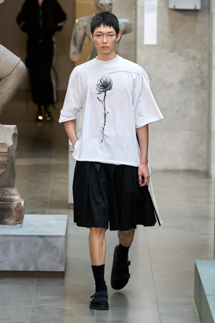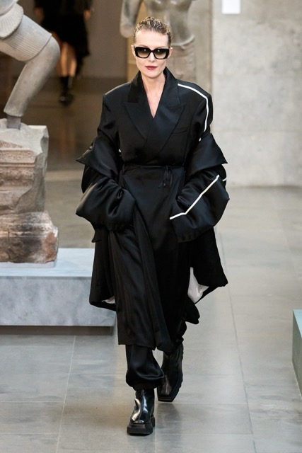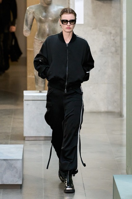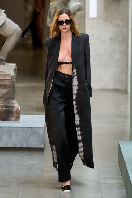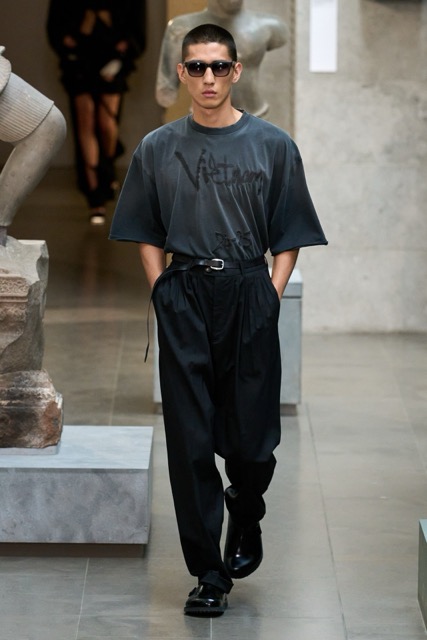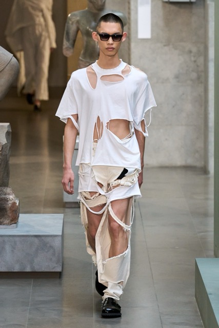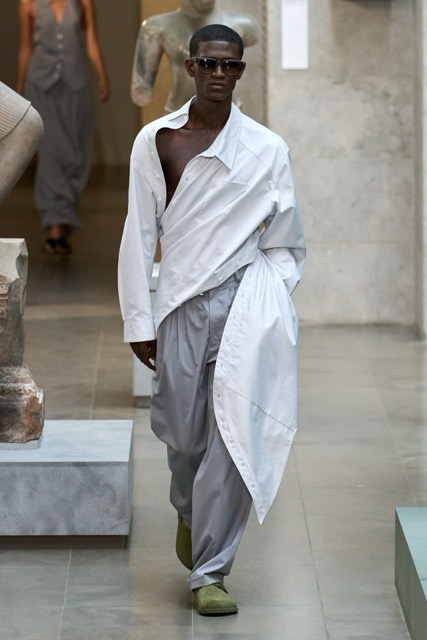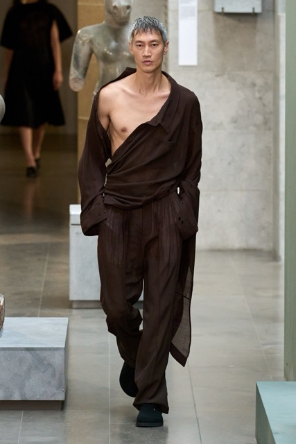 The collection was a mix of loose, deconstructed pieces and more structured tailoring. Standout looks included a dark green chiffon tunic paired with matching trousers, sporty black puffers, and shredded denim. Do also introduced a new line called “168,” featuring seasonless, gender-neutral suits that added a personal touch with his own tattoo as a design element.