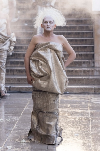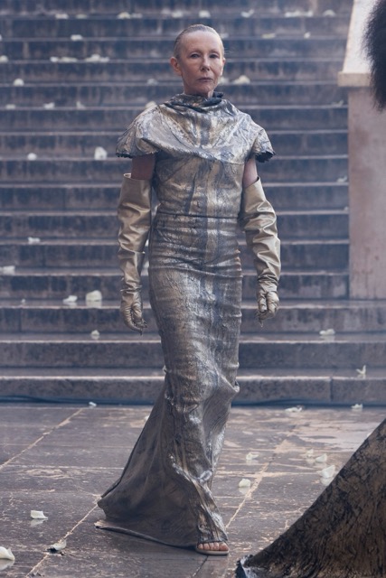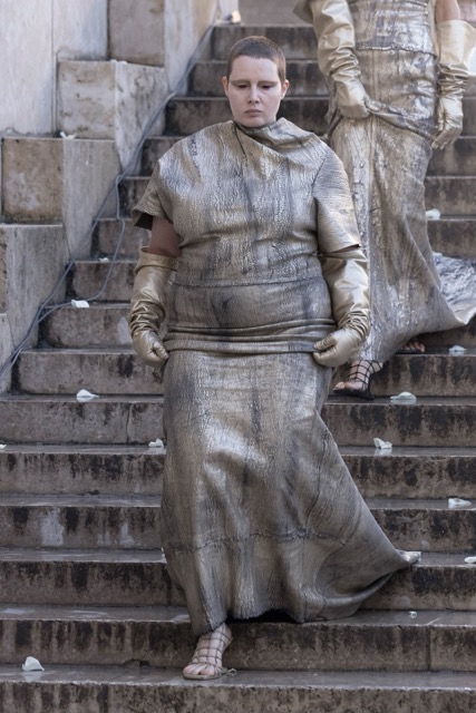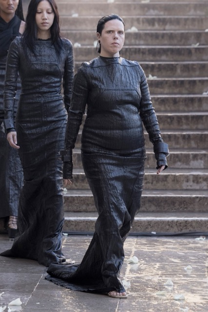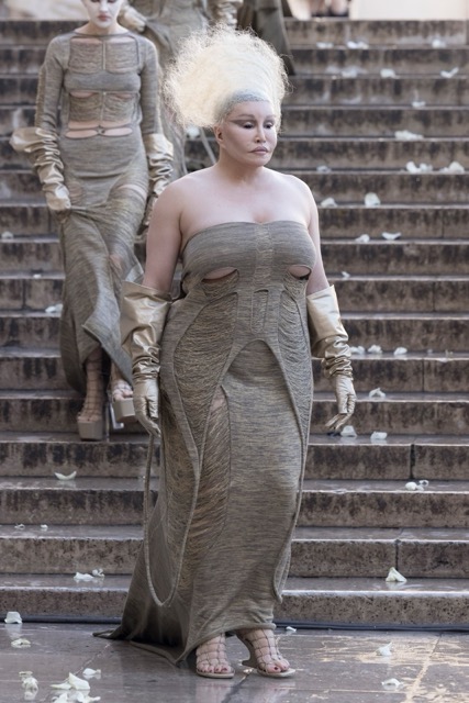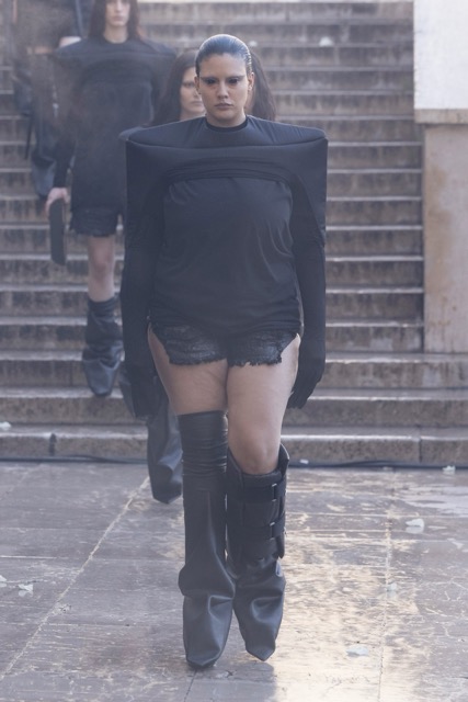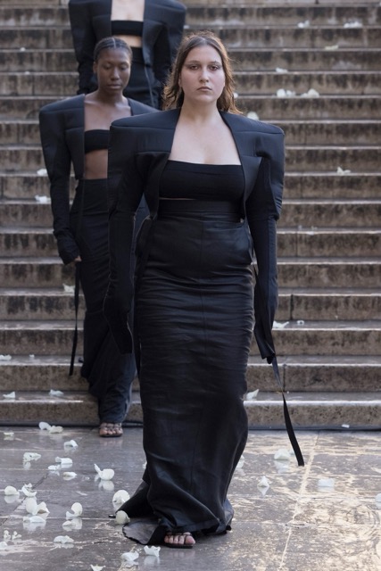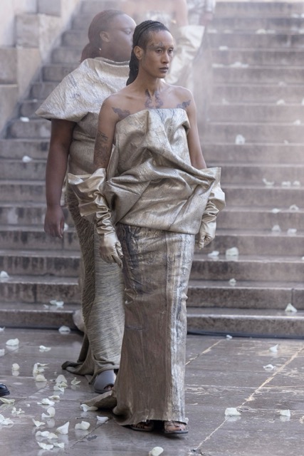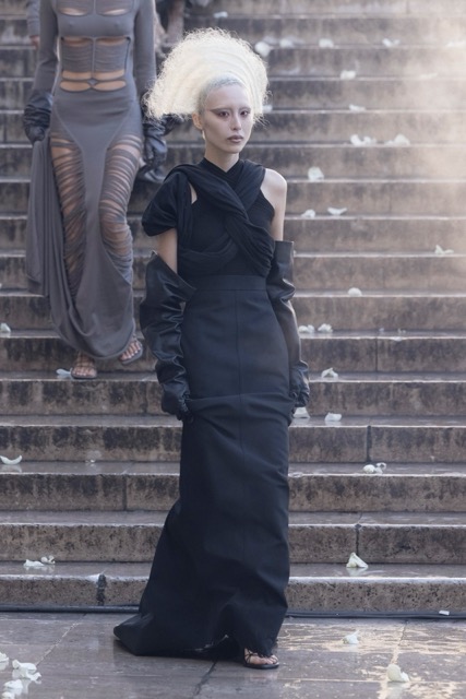 Rick Owens returned to the Palais de Tokyo for his Spring/Summer 2025 show, a dramatic spectacle titled “Hollywood.” This marked a shift from the intimacy of his previous season, embracing inclusivity with a cast of 200 models – a mix of students, Owens devotees, and even circus performers. This decision not only brought diversity to the cast but also infused the show with an inclusive spirit, echoing his own journey from the fringes of society to the forefront of fashion.