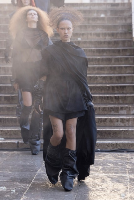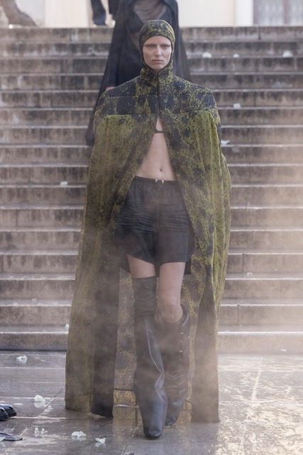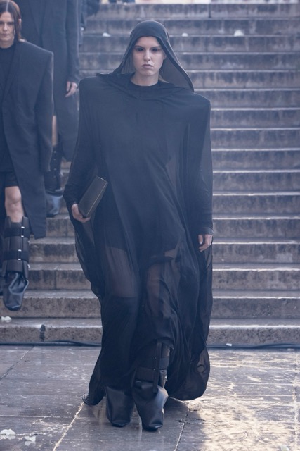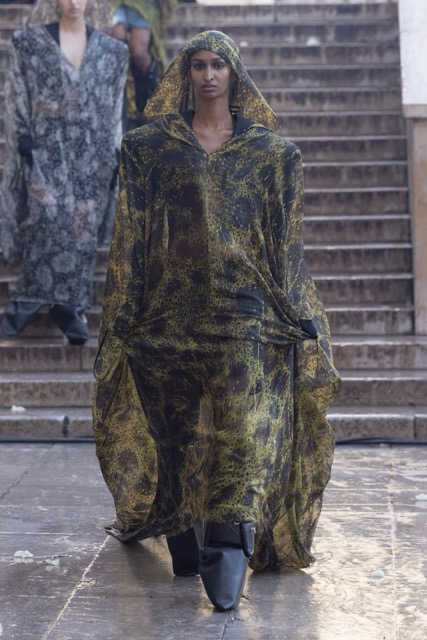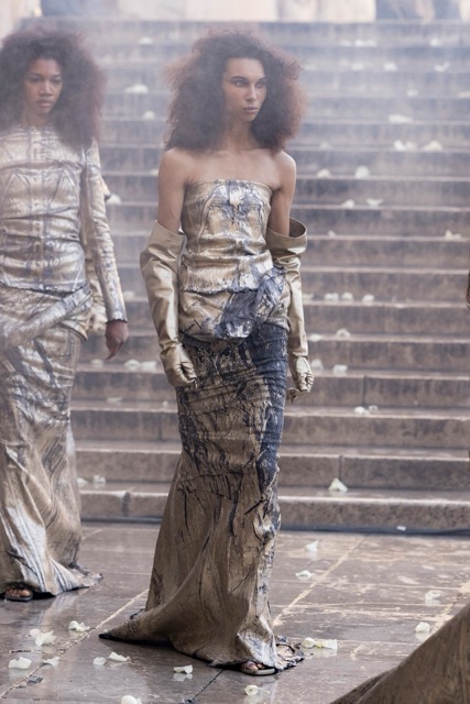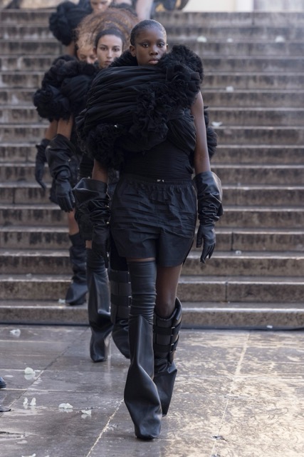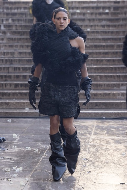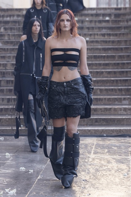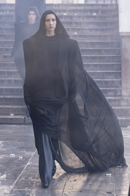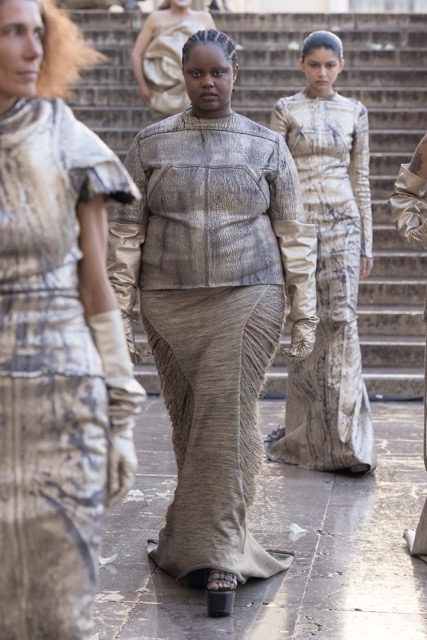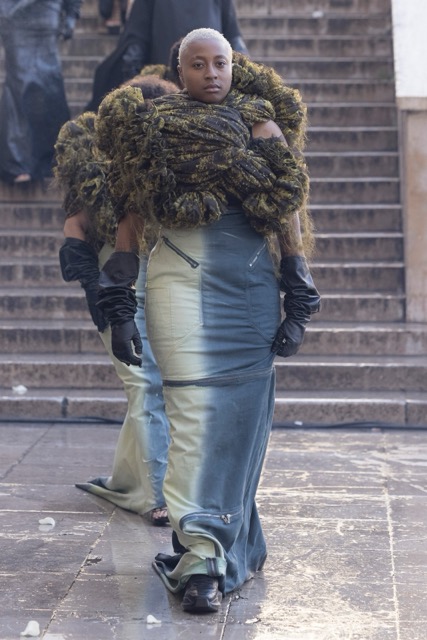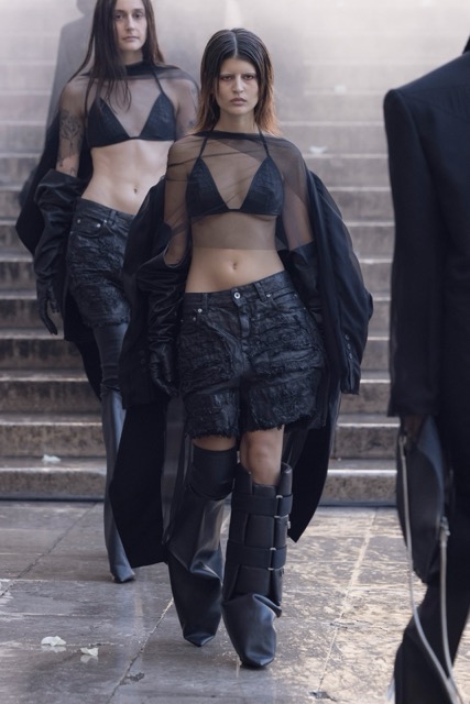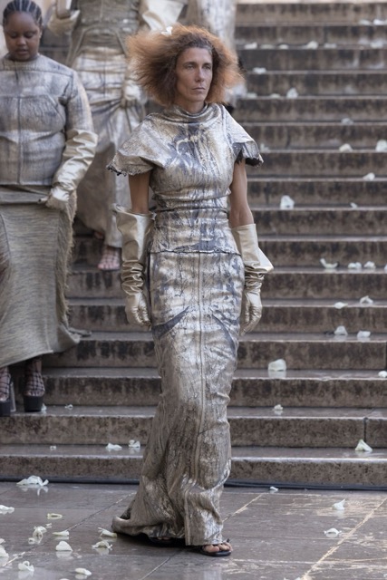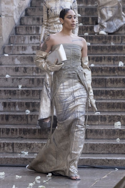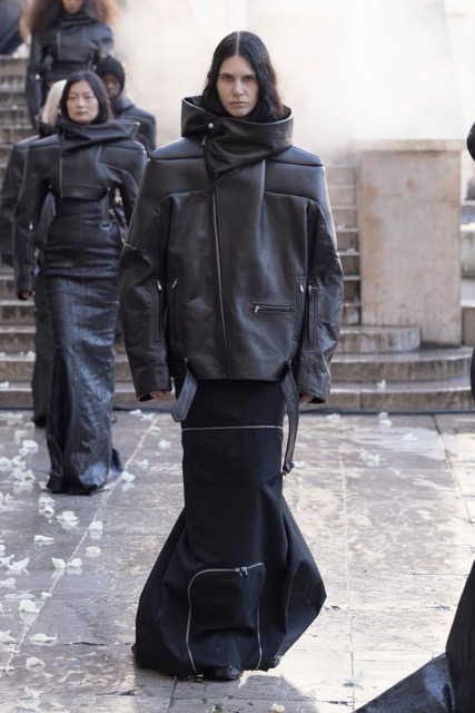 Notable looks included airy chiffon capes paired with structured bomber jackets, juxtaposing softness with boldness. The long fishtail skirts, reminiscent of 1930s Hollywood glamour, were both dramatic and wearable, while cut-off denim trousers appeared dipped in a mysterious sheen, reflecting Owens’ penchant for the unconventional.