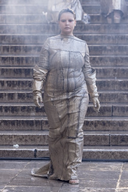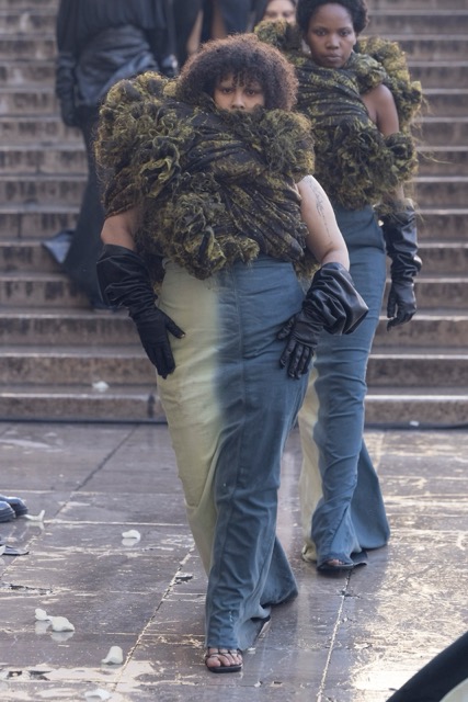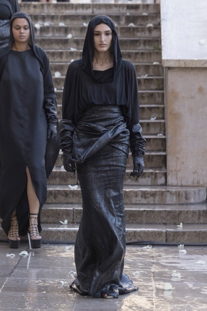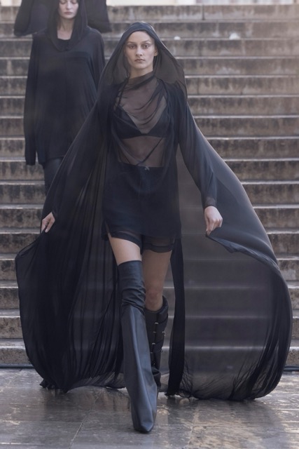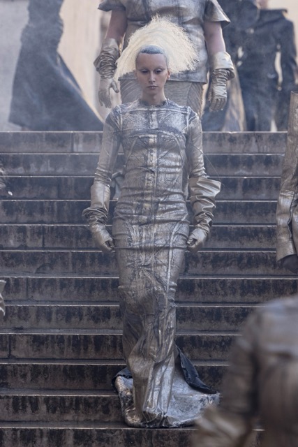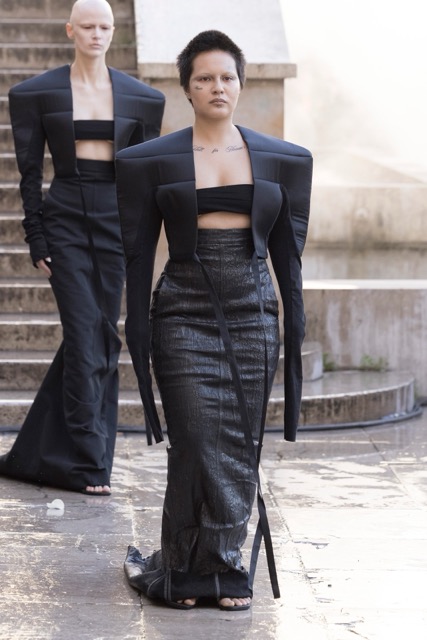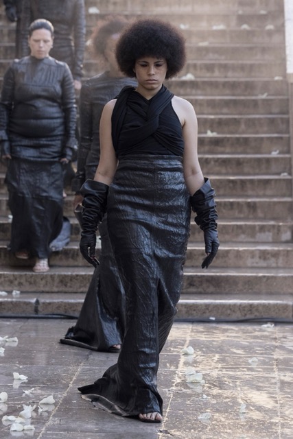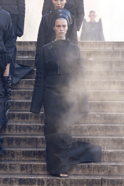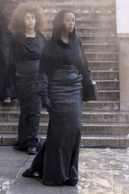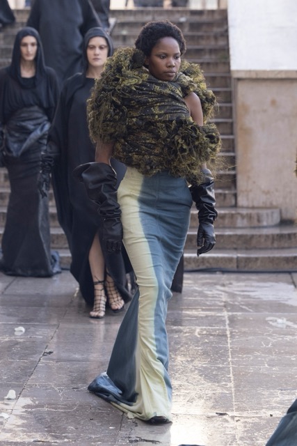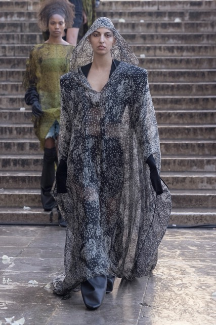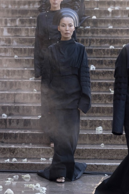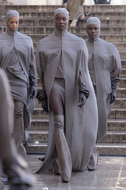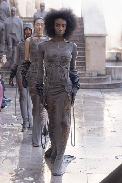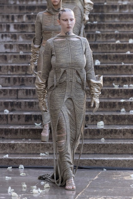 Notable looks included airy chiffon capes paired with structured bomber jackets, juxtaposing softness with boldness. The long fishtail skirts, reminiscent of 1930s Hollywood glamour, were both dramatic and wearable, while cut-off denim trousers appeared dipped in a mysterious sheen, reflecting Owens’ penchant for the unconventional.