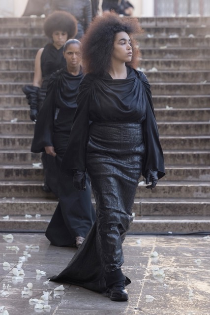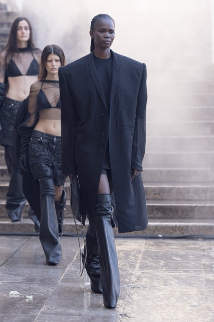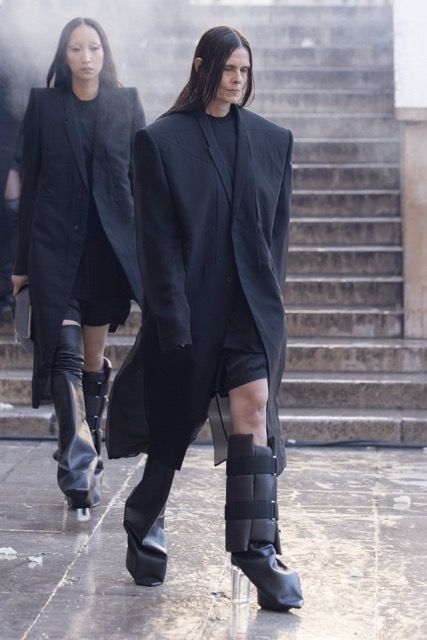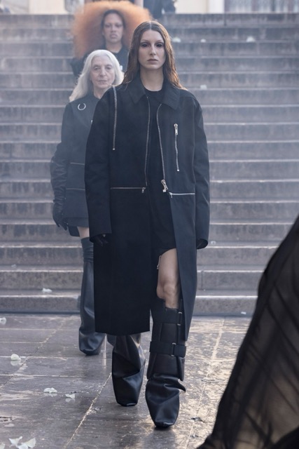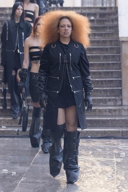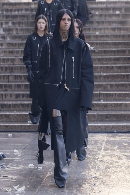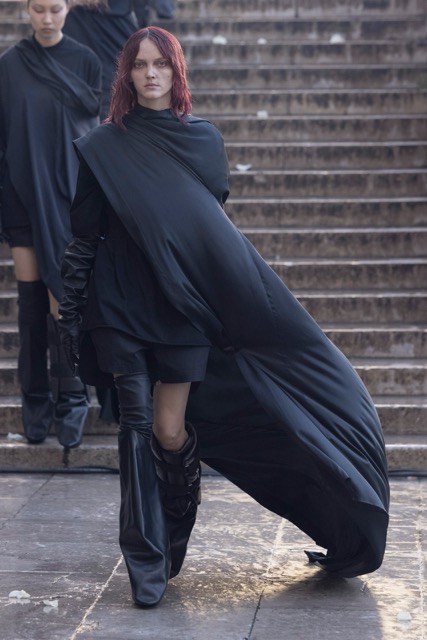 The collection itself paid homage to the flamboyant spirit of pre-Code Hollywood. Think art deco glamor with a touch of sin and redemption. Flowing white capes contrasted with Owens’ signature dark palette, featuring oversized silhouettes, biker jackets, and his iconic boots.