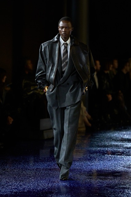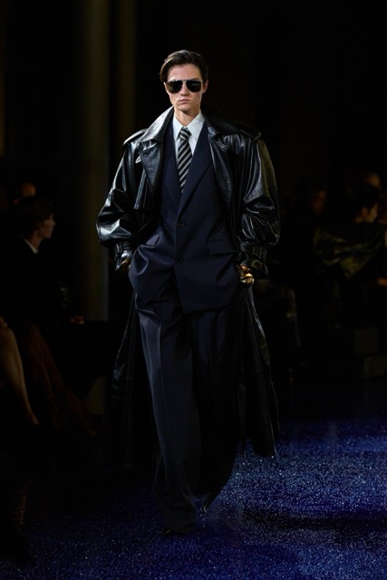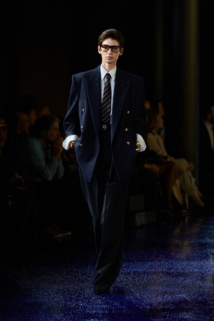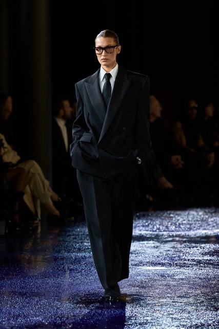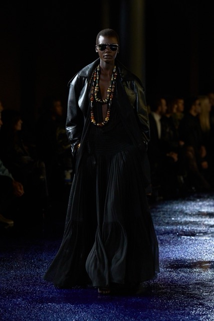 Vaccarello’s mastery of structure and tailoring is central to the collection, as seen in sharp, oversized blazers and fluid, floor-length coats that dominate the runway. This juxtaposition of precise tailoring and loose, flowing silhouettes speaks to a theme of balance—between control and ease, between masculine and feminine energy. The suits, in particular, stand out for their powerful, androgynous shapes, embodying the spirit of the confident, liberated woman. The oversized, boxy blazer—a hallmark of Saint Laurent—reappears in full force, this time paired with wide-legged trousers or styled over light, sheer dresses.