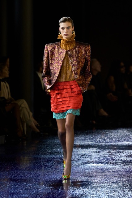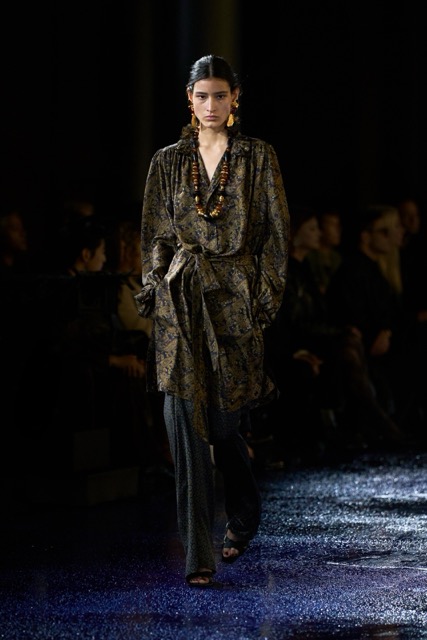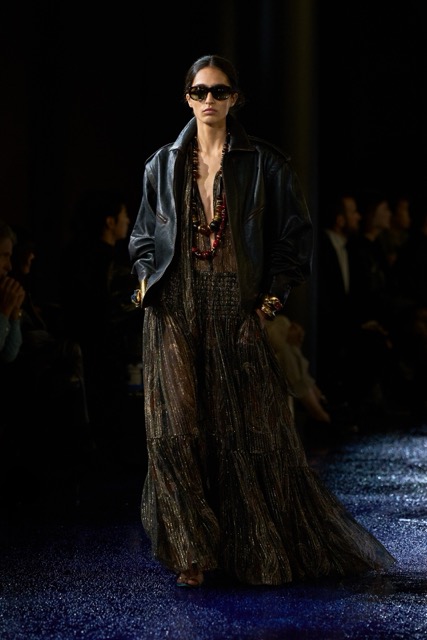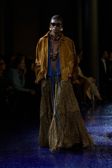 The eveningwear pieces further amplify this duality. Metallic lace details, shiny fabrics, and floral prints bring an air of Parisian nightlife, with a playful nod to Yves Saint Laurent’s bohemian past. Ruffled skirts and tiered dresses, some paired with fringed shawls, inject a sense of movement and freedom, contrasting the structured tailoring of the daywear.