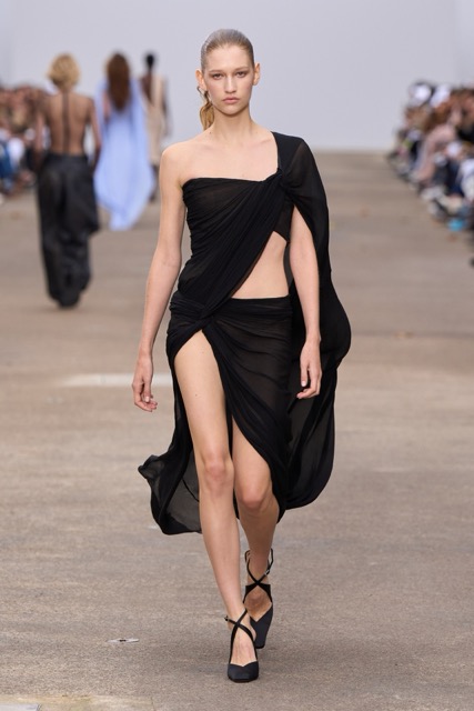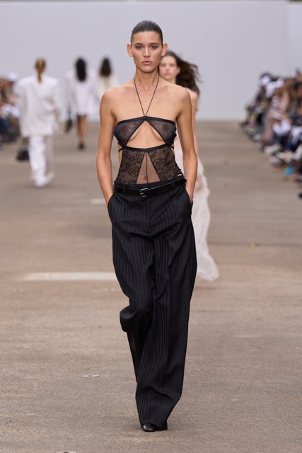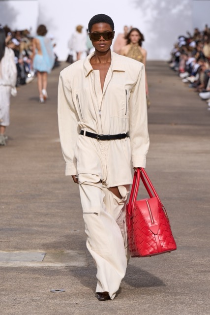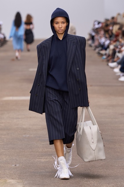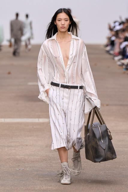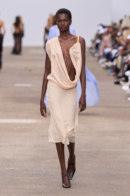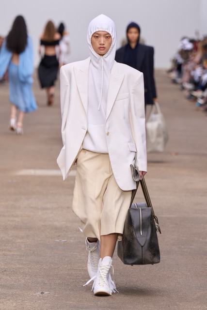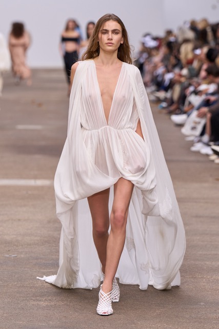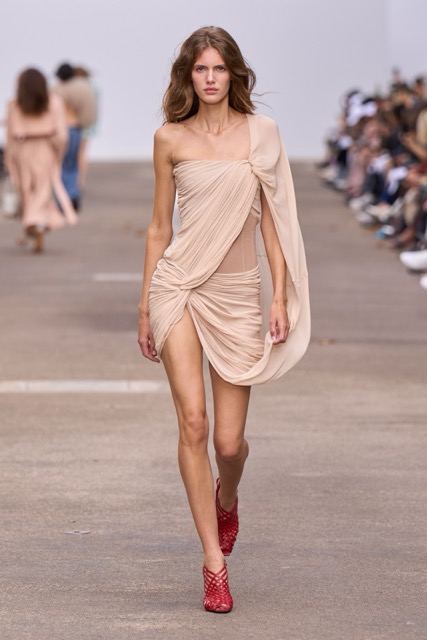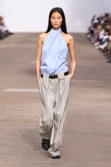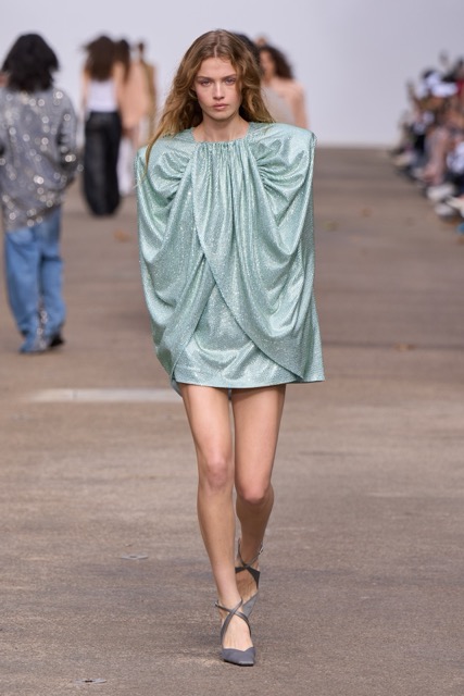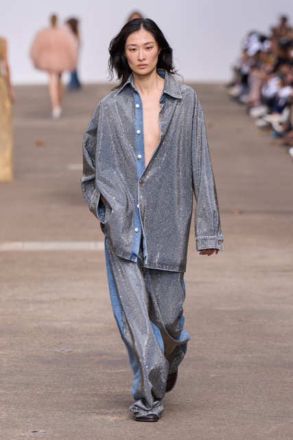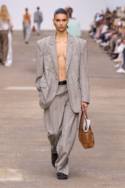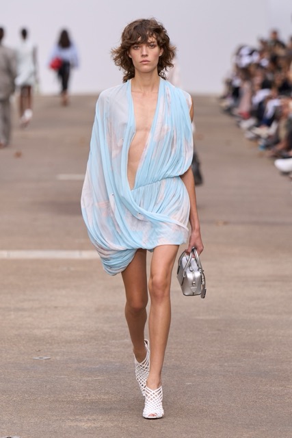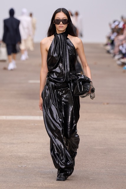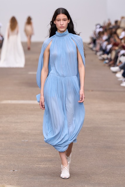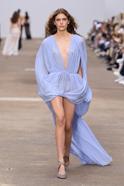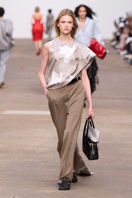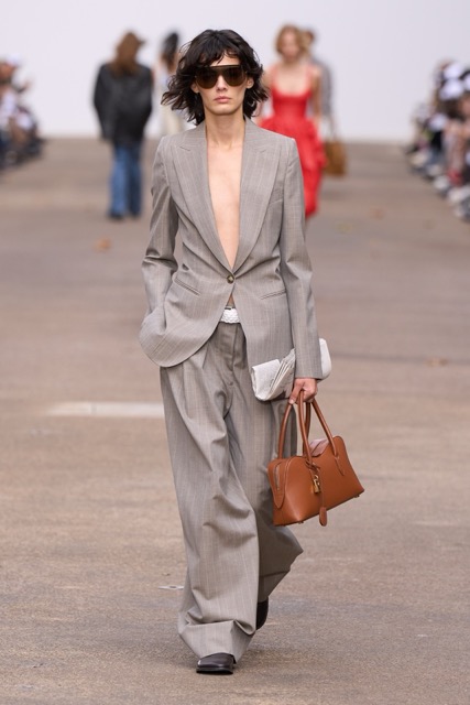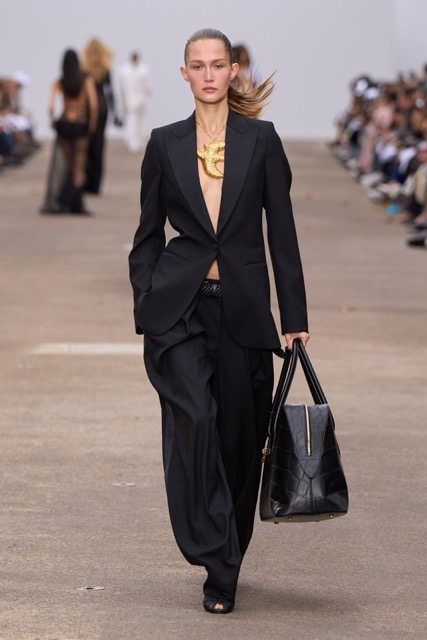 The collection balances masculine and feminine elements, featuring oversized, strong-shouldered blazers and pinstriped suits alongside delicate, sensual dresses. McCartney’s minimalist approach is elevated with dramatic details like sparkling crystals, fluid draping, and intricate knitwear. Her creativity shines in accessories too, with hand-carved dove jewelry made from repurposed materials adding a thoughtful touch.