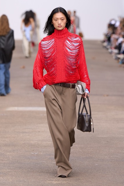 McCartney’s commitment to sustainability was evident throughout the collection. Ninety-one percent of the materials used were sustainable, including vegan leather, organic silk, and recycled materials. The designer also introduced the Ryder bag, a vegan handbag inspired by the shape of a horse’s back. The color palette was dominated by shades of red, black, and white, creating a striking visual impact.