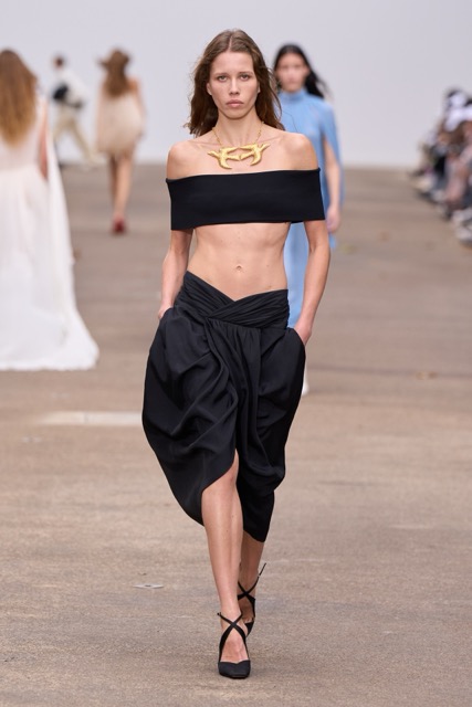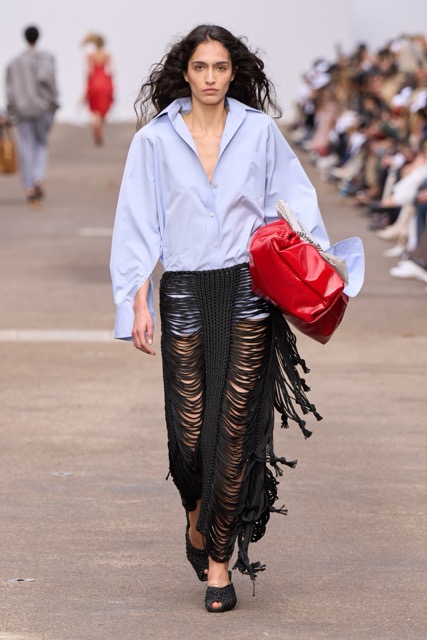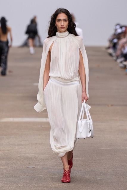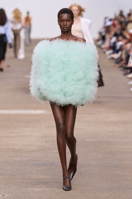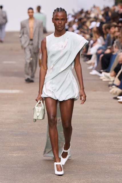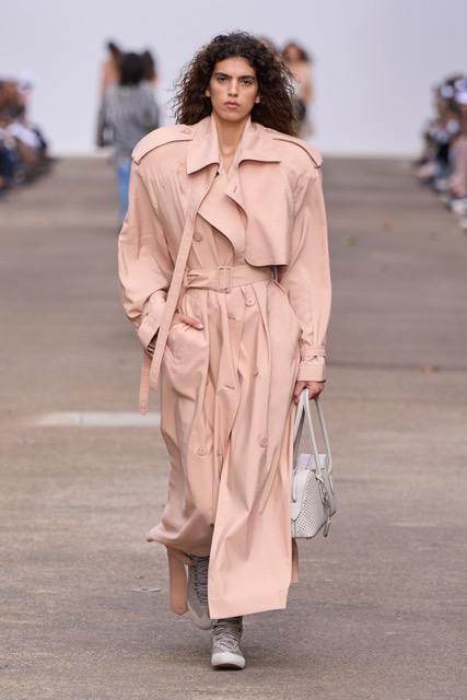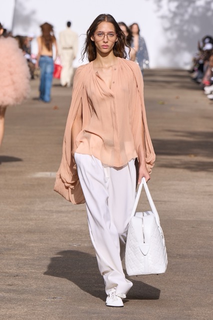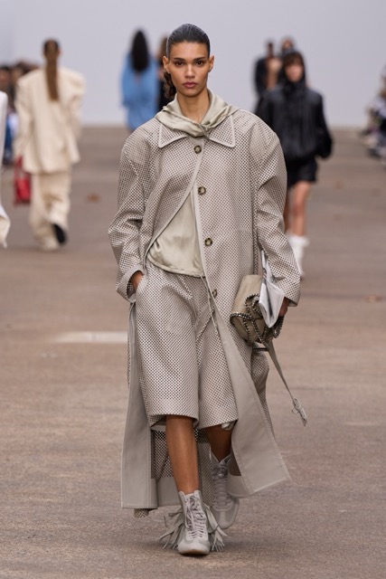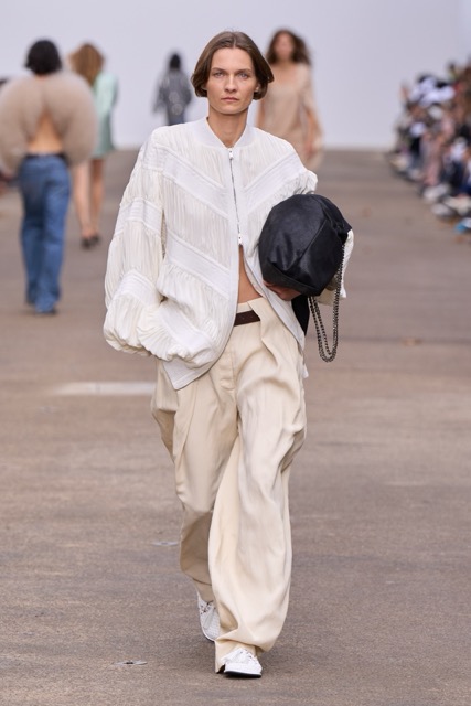 Showcased in Paris, this Stella McCartney collection is crafted from 91% sustainable materials, reinforcing McCartney’s dedication to ethical fashion. The designer’s passion for animal welfare and environmental responsibility was evident throughout, with no feathers used and pieces like the new Ryder bag, inspired by her love for horses, taking center stage.