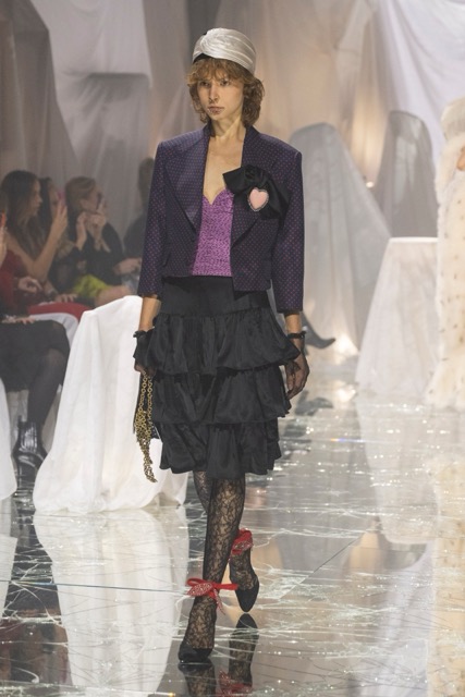The standout pieces were the gowns, many of which embodied Valentino’s timeless elegance while embracing Michele’s flair for extravagance. Ruffles cascaded down dresses in dramatic tiers, while delicate embroideries added a layer of opulence to flowing gowns. Feather boas, polka dots, and lace gloves further enhanced the theatricality of the collection. Yet, there was a sense of femininity and lightness that balanced the boldness of the looks. The A-line gowns with voluminous ruffles, paired with deeply brimmed hats or netted turbans, felt ethereal, while the tailored pieces, like fitted tuxedo tea dresses, offered a nod to the house’s classic sophistication.