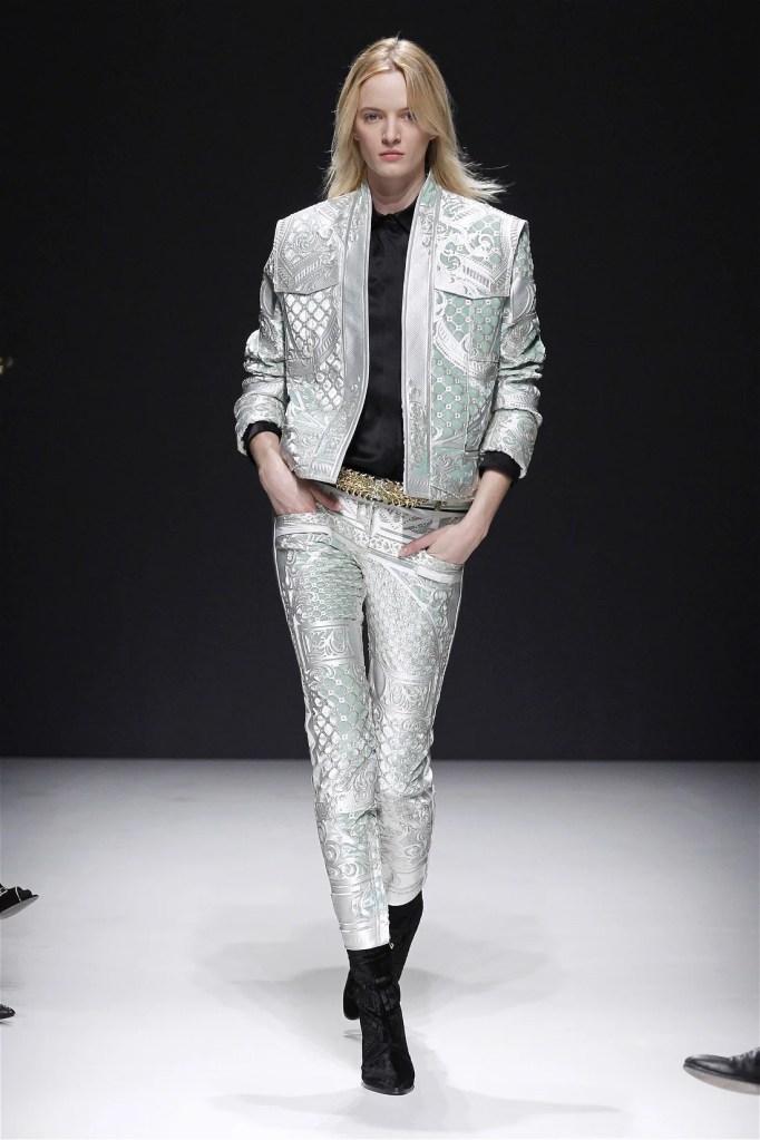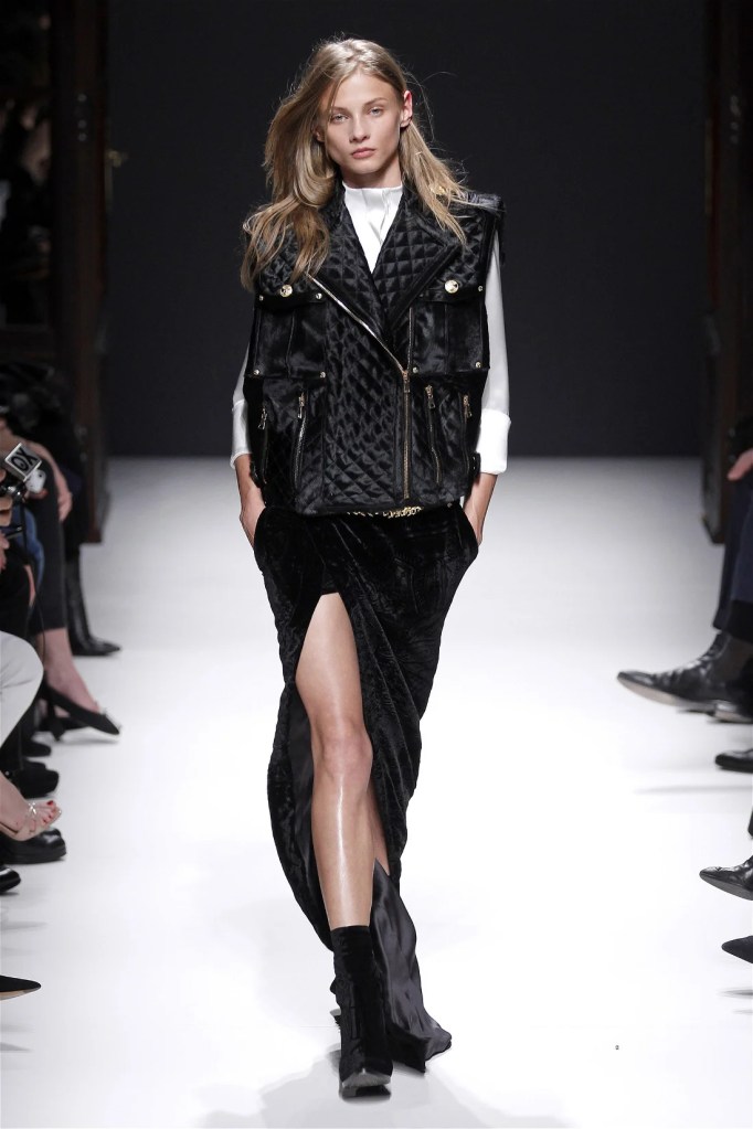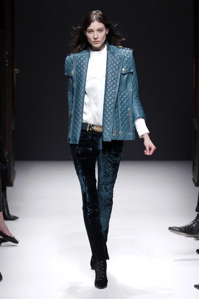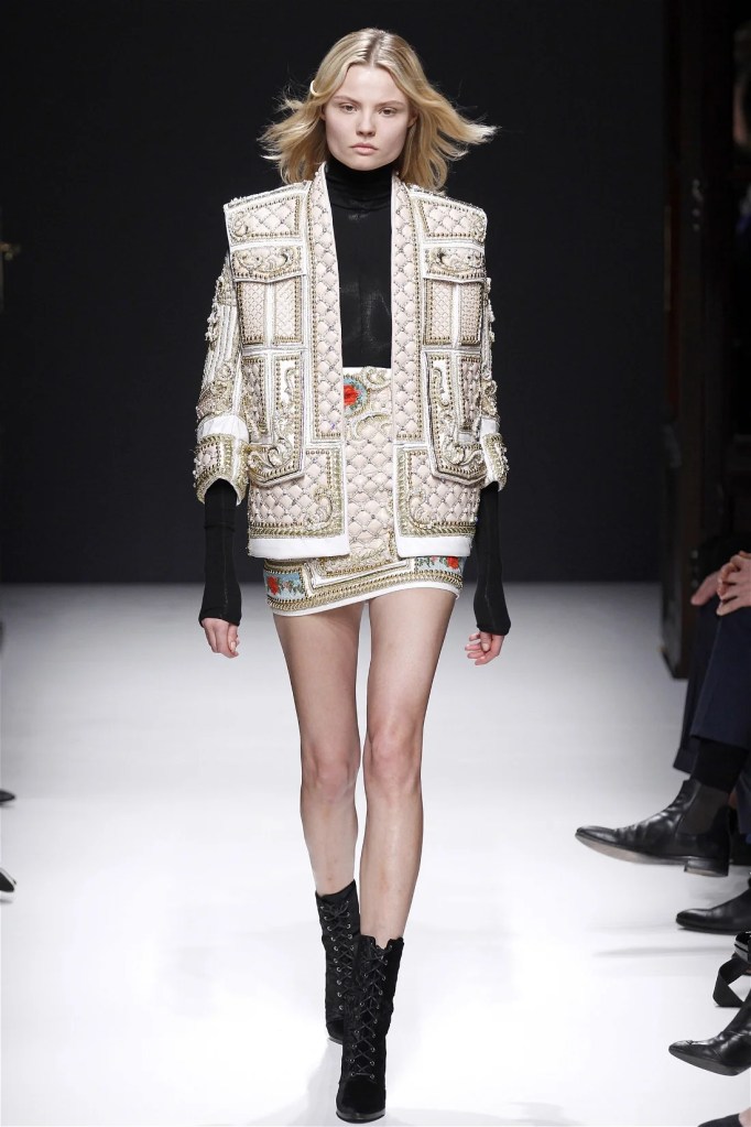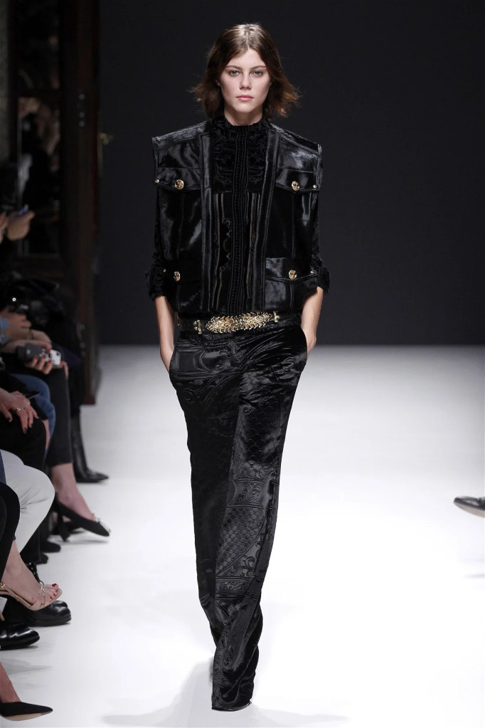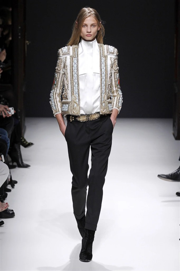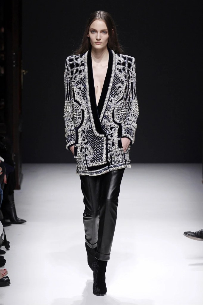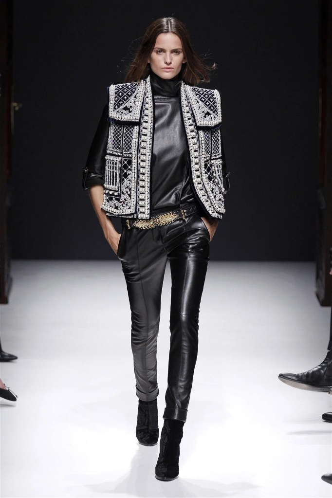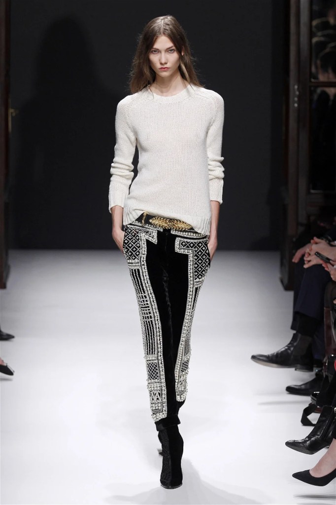 The Balmain collection from Olivier Rousteing’s early tenure offered a striking balance of couture-level craftsmanship and contemporary wearability. A standout moment came when Karlie Kloss appeared in a pearl and crystal-embroidered velvet ensemble, embodying effortless luxury. Rousteing’s vision reshaped Balmain’s aesthetic, from boxy, oversized jackets paired with fluid velvet pants to leather sweatshirts adorned with intricate needlepoint.