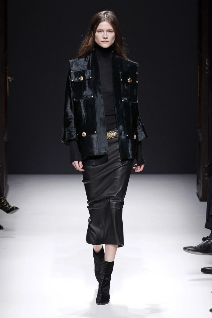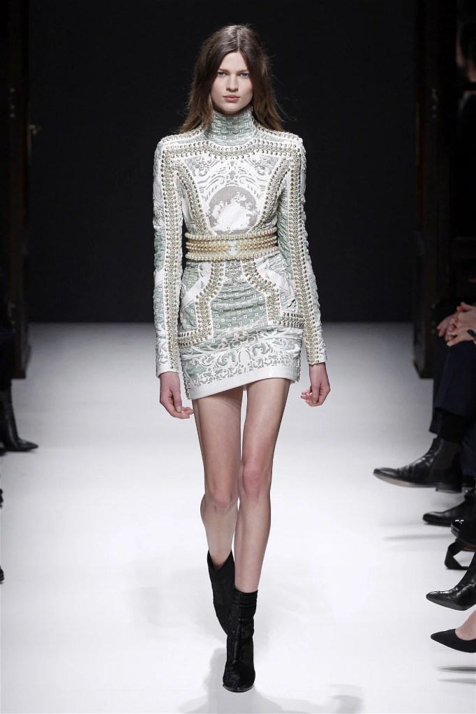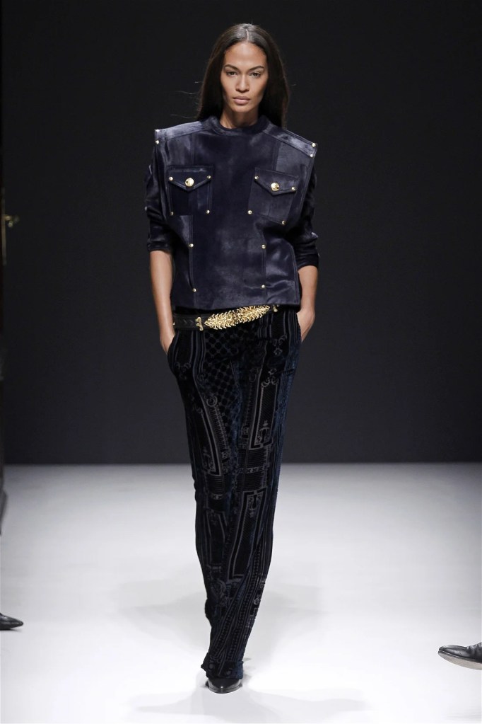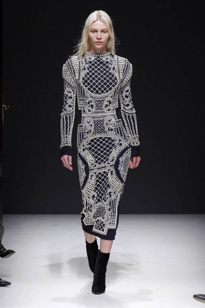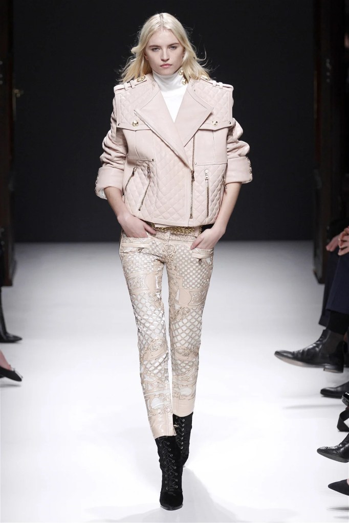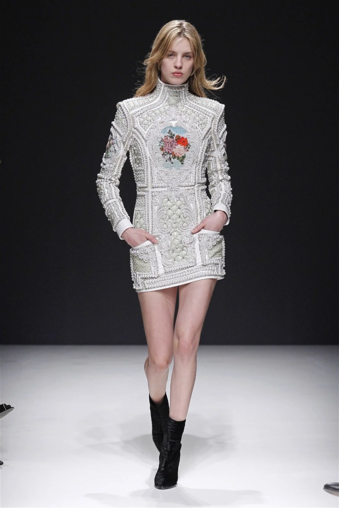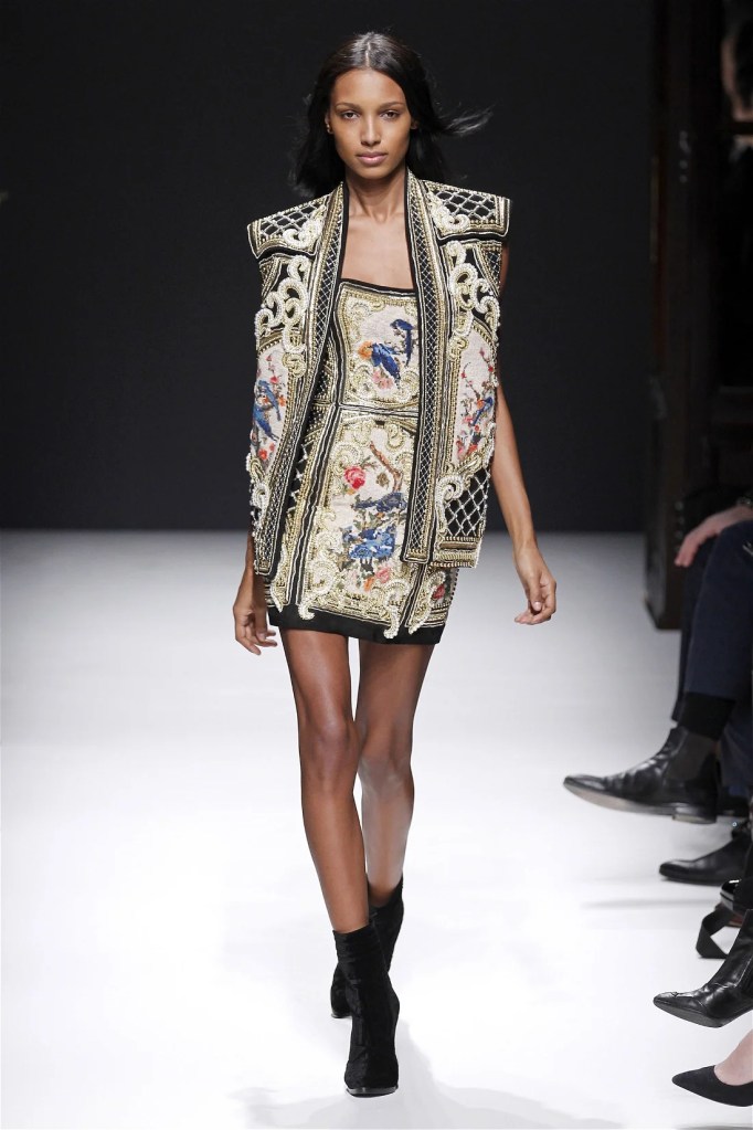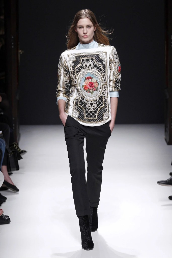 The Balmain collection from Olivier Rousteing’s early tenure offered a striking balance of couture-level craftsmanship and contemporary wearability. A standout moment came when Karlie Kloss appeared in a pearl and crystal-embroidered velvet ensemble, embodying effortless luxury. Rousteing’s vision reshaped Balmain’s aesthetic, from boxy, oversized jackets paired with fluid velvet pants to leather sweatshirts adorned with intricate needlepoint.