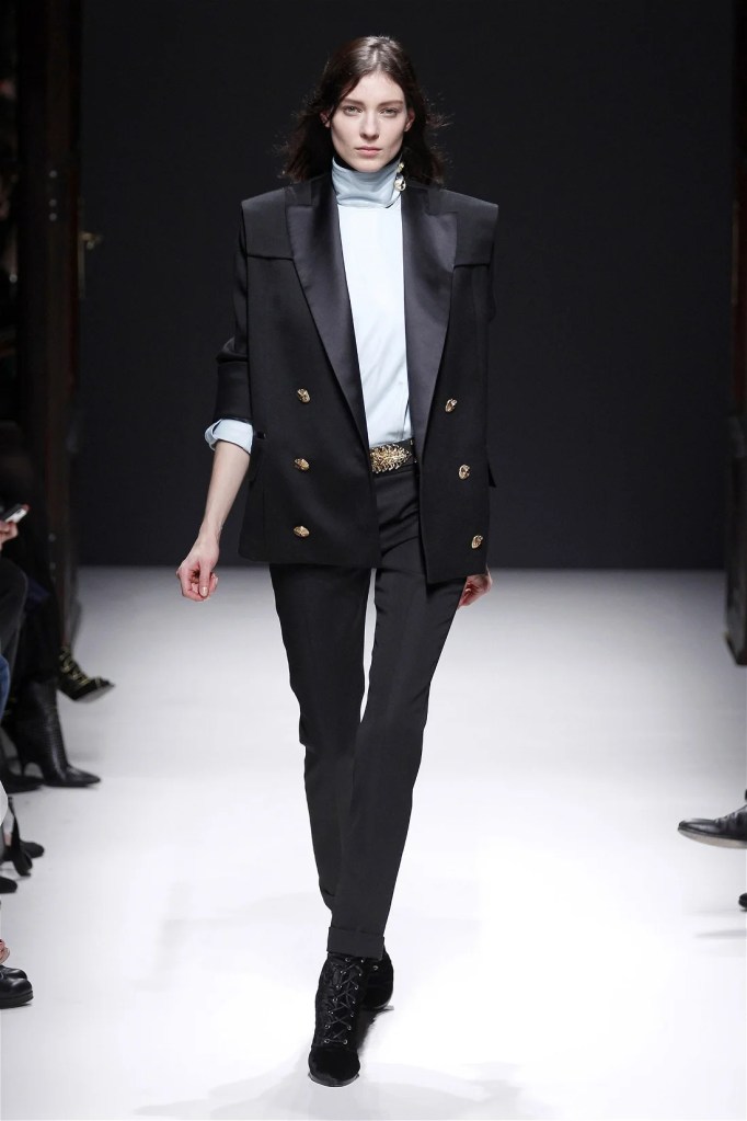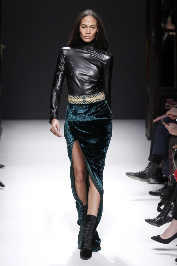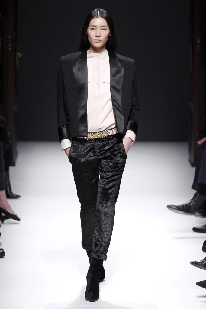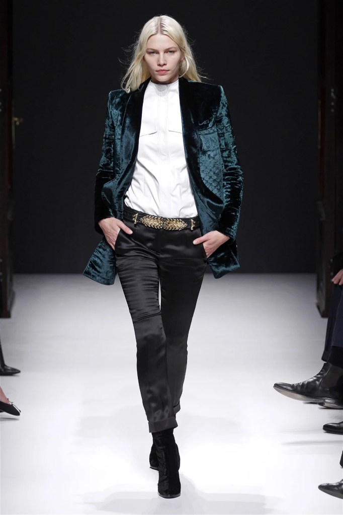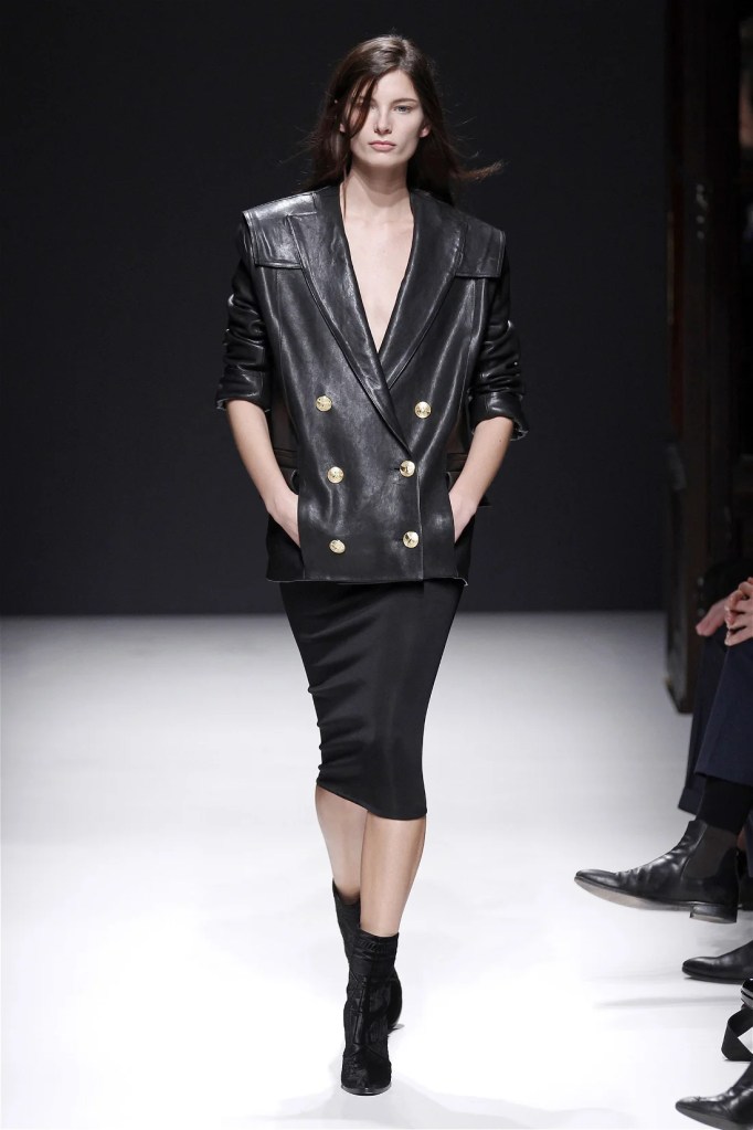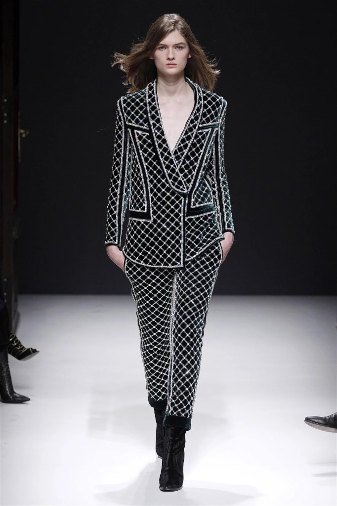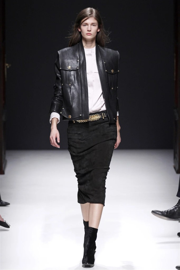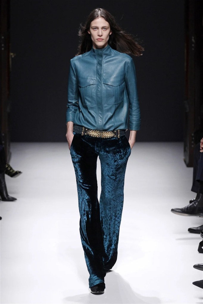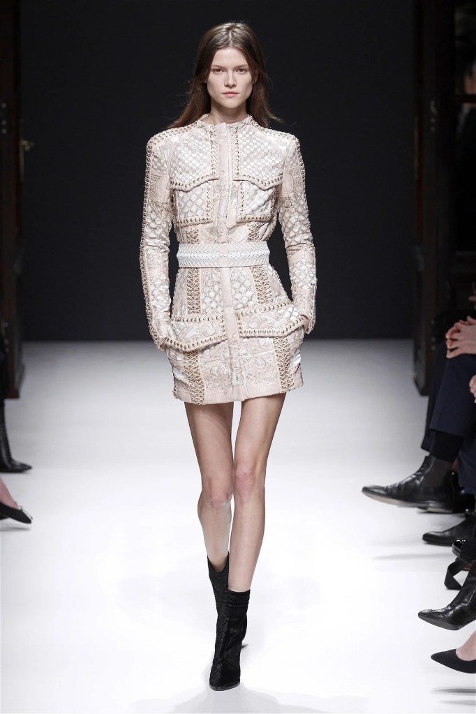 The Balmain collection from Olivier Rousteing’s early tenure offered a striking balance of couture-level craftsmanship and contemporary wearability. A standout moment came when Karlie Kloss appeared in a pearl and crystal-embroidered velvet ensemble, embodying effortless luxury. Rousteing’s vision reshaped Balmain’s aesthetic, from boxy, oversized jackets paired with fluid velvet pants to leather sweatshirts adorned with intricate needlepoint.