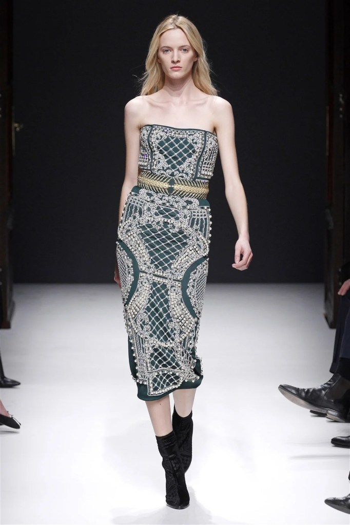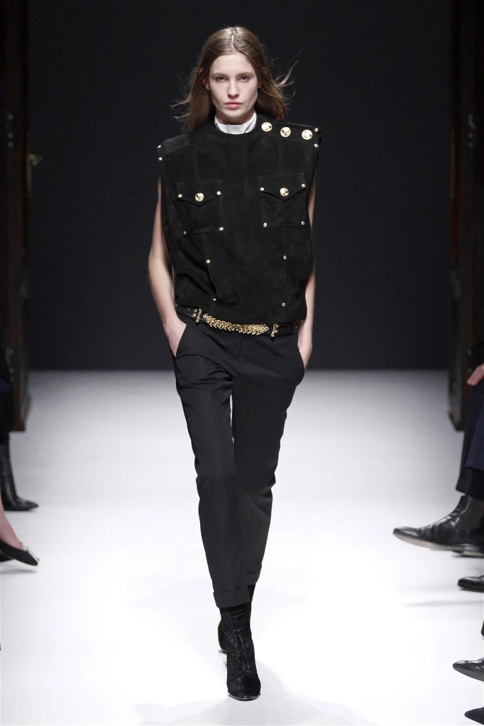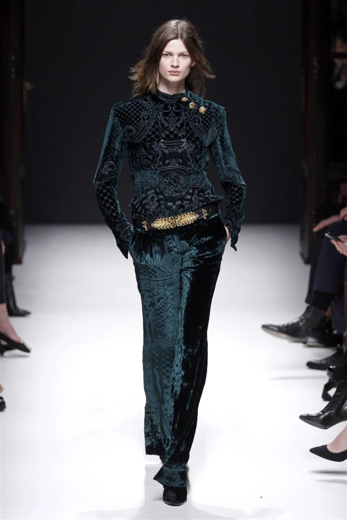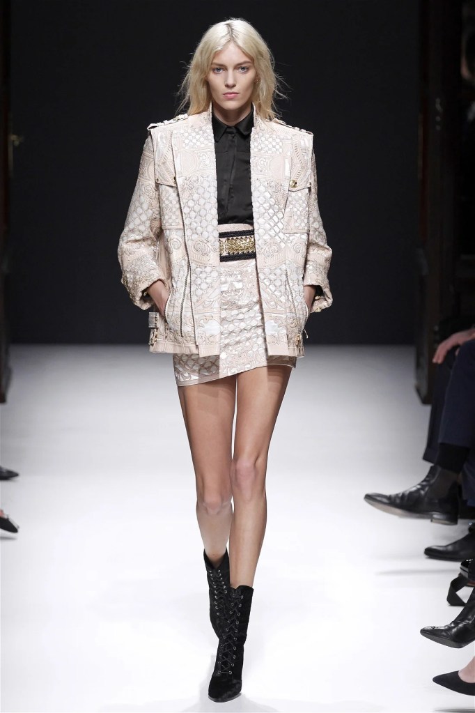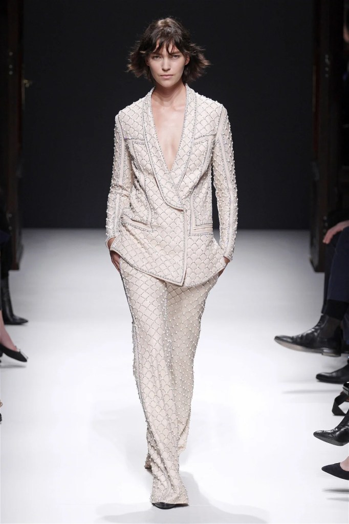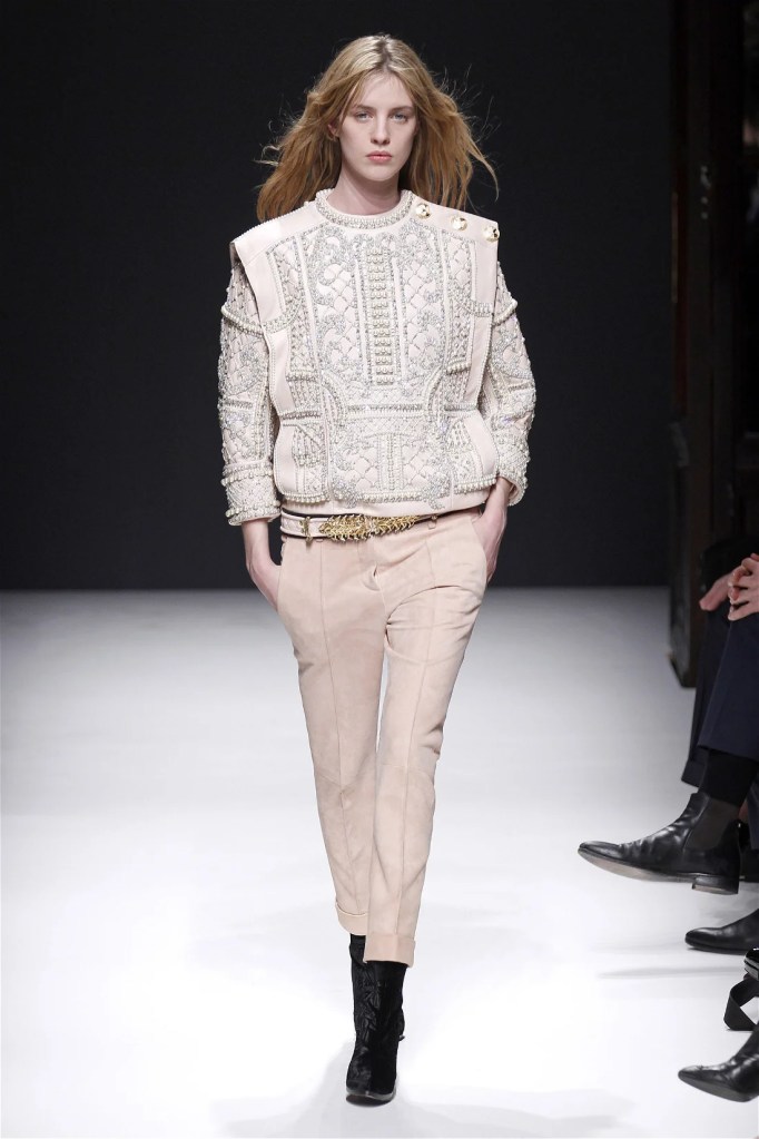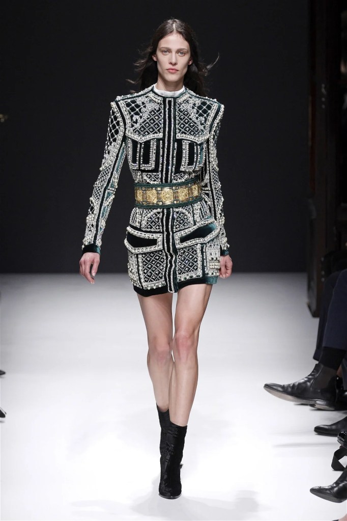 While richly detailed dresses in pearls and crystals felt less inventive, the collection’s strength lay in its high-low mixes. Rich velvets, creamy neutrals, and jewel tones infused the lineup with a modern edge. Military-inspired jackets evolved into elegant, embellished outerwear, maintaining Balmain’s signature boldness. Rousteing’s early work set a confident and refined blueprint for the house’s future.