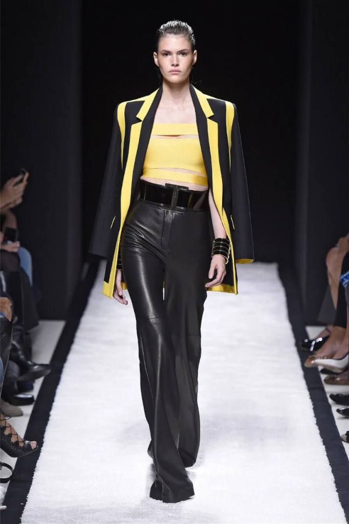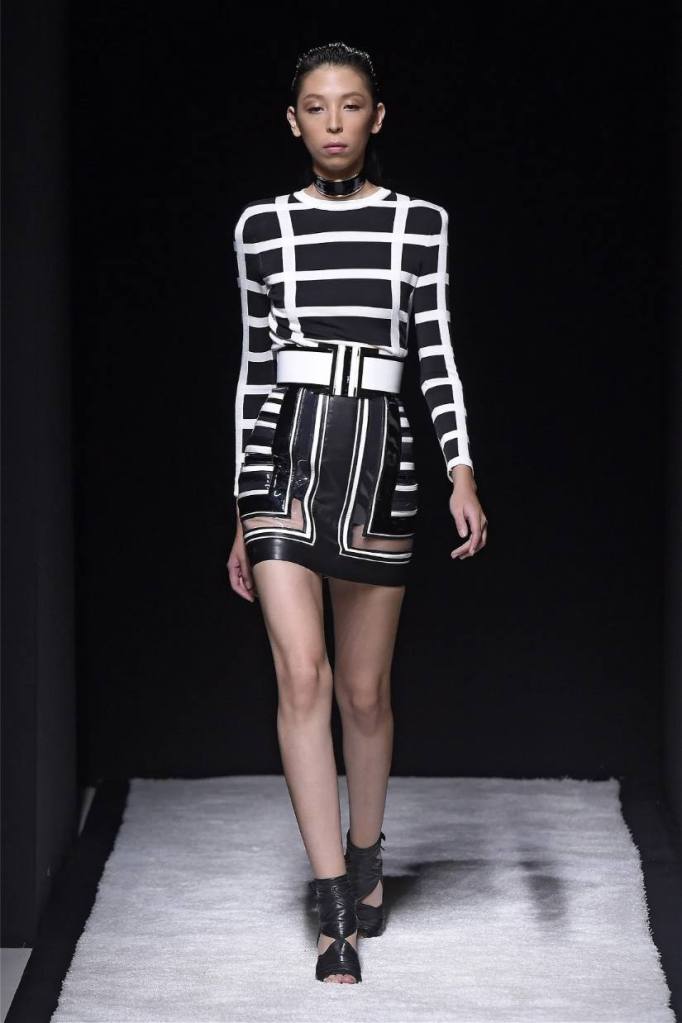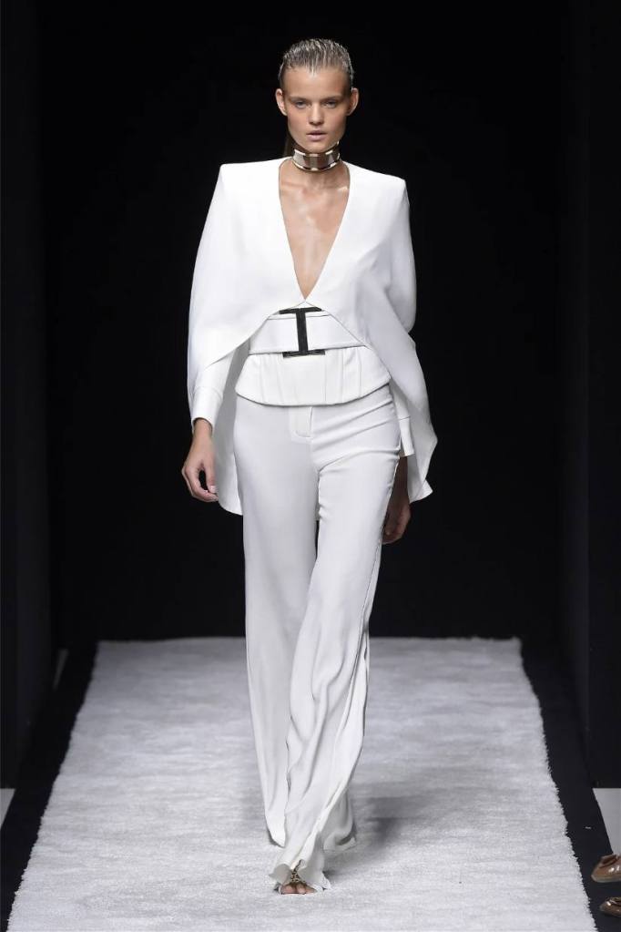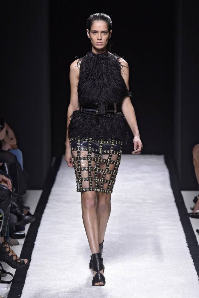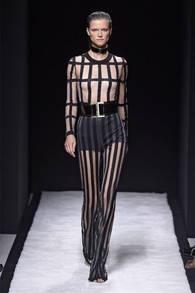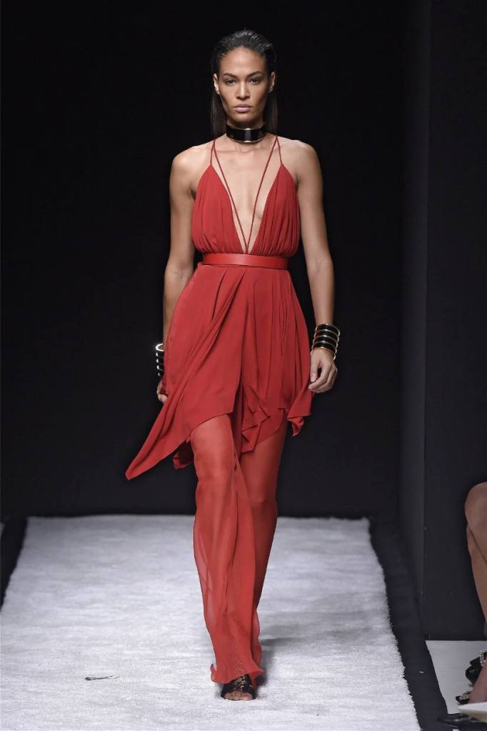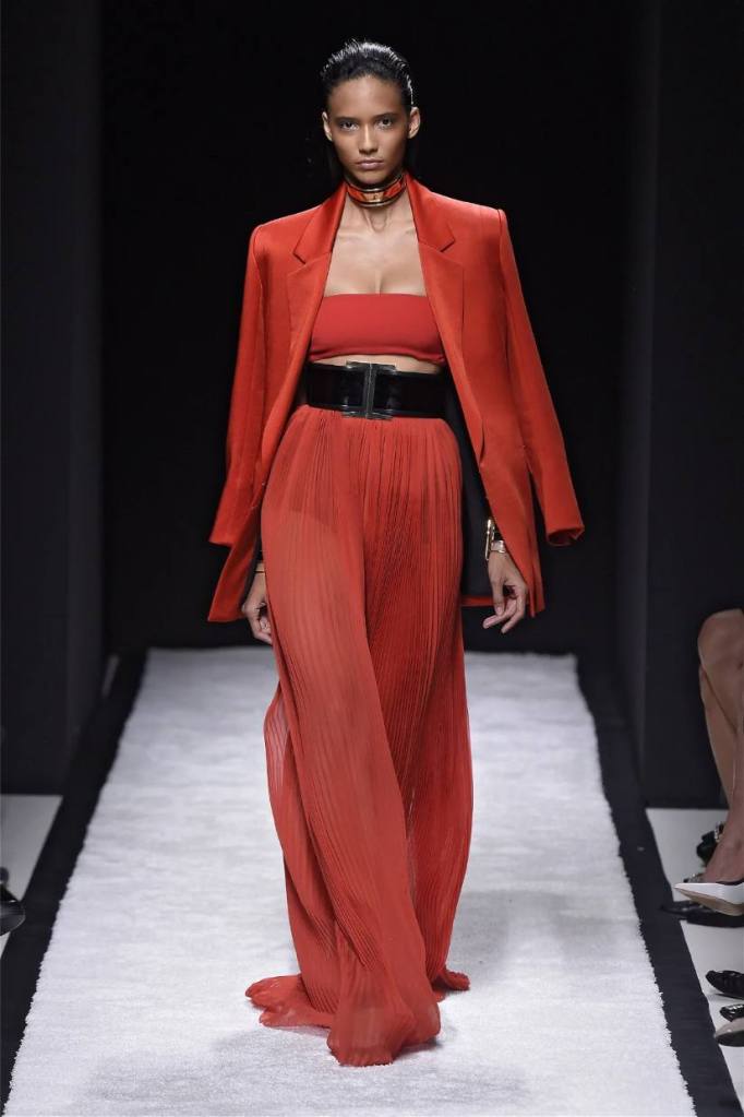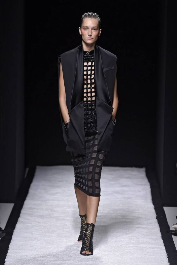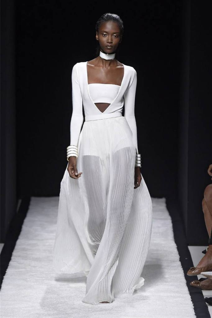 Drawing inspiration from 2015’s after-party vibe, the collection featured lots of skin and transparency, with sheer nylon knits, plastic inserts, and delicate plissé fabrics. While the designs were eye-catching, some of the fabrics, like allover crystals and heavy leather, were difficult to wear, offering less comfort than expected. The collection worked best when Rousteing kept things simple, like the elegant draped white tee paired with a crystal grid pencil skirt. Sexy, streamlined pieces like cutout dresses and strappy gowns, especially in fiery red, showcased Rousteing’s strength in balancing sensuality with structure. Models strutted in strong, confident silhouettes, from wide-legged trousers to body-con dresses, With a star-studded front row and bold designs, Balmain delivered a powerful collection.